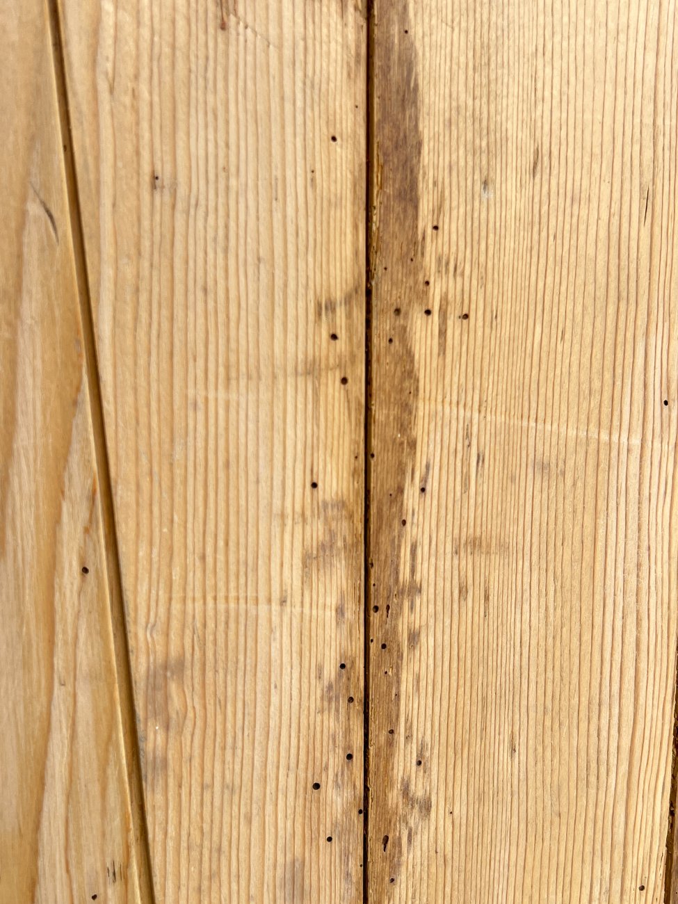 | Papildoma informacija | Matoma stogo lentų deformacija. Yra paviršiaus pabraižymų, medienos skilimų ir kinivarpų pažeidimų. |