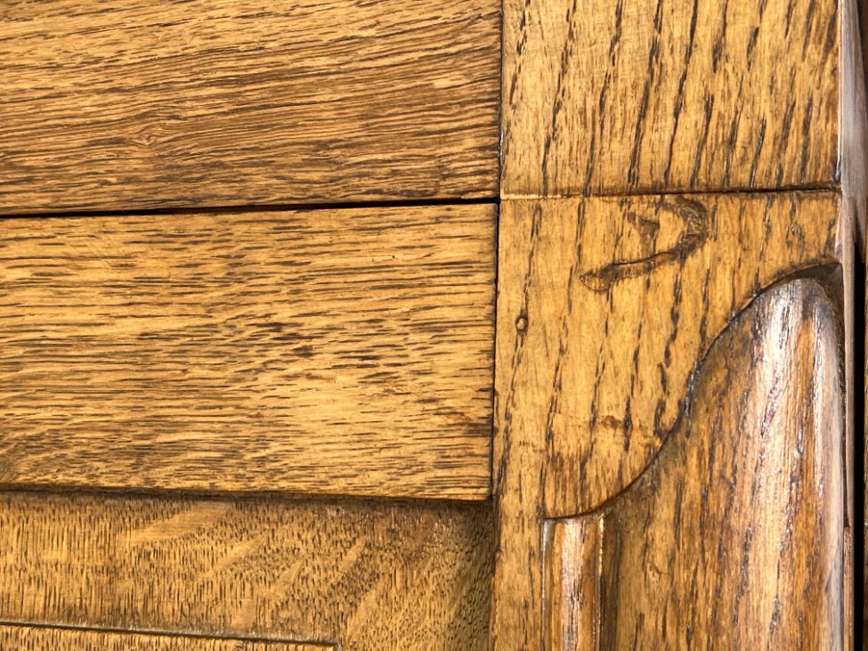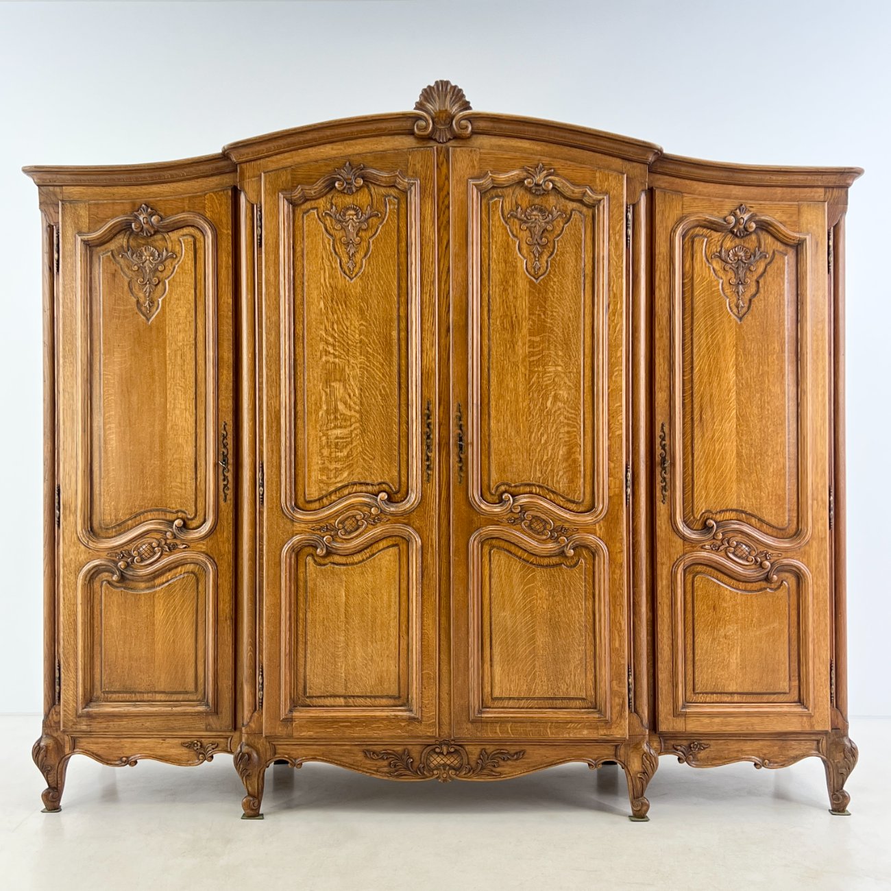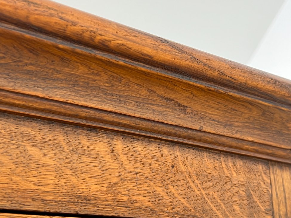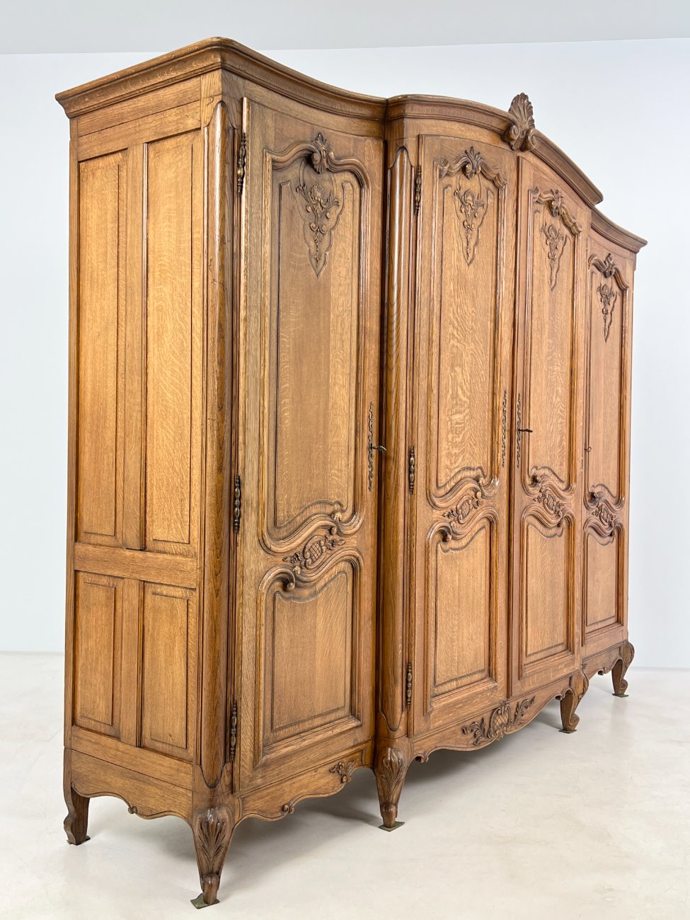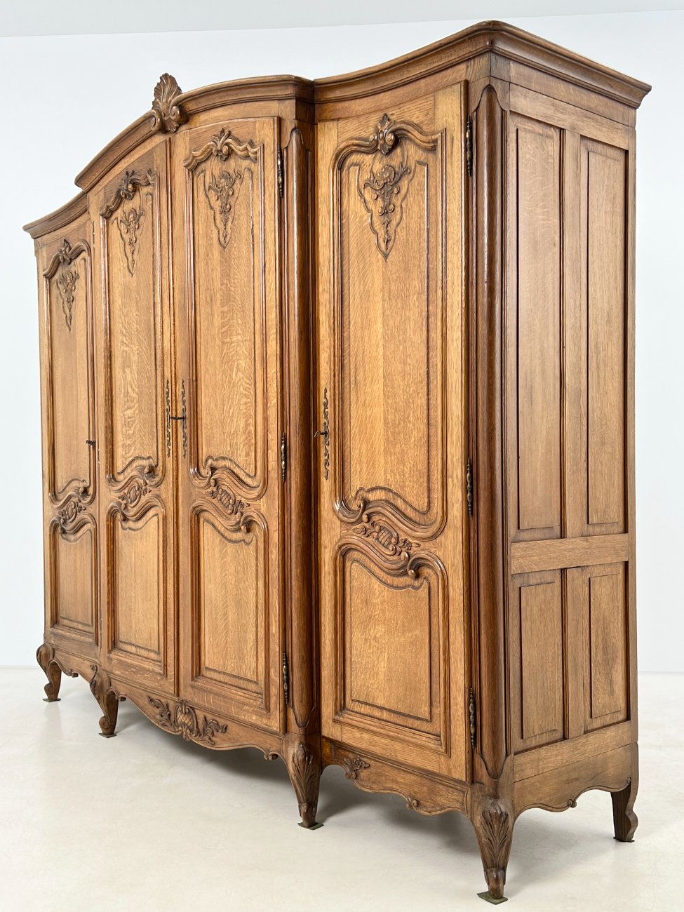 Plati ąžuolinė keturių durų rūbų spinta.