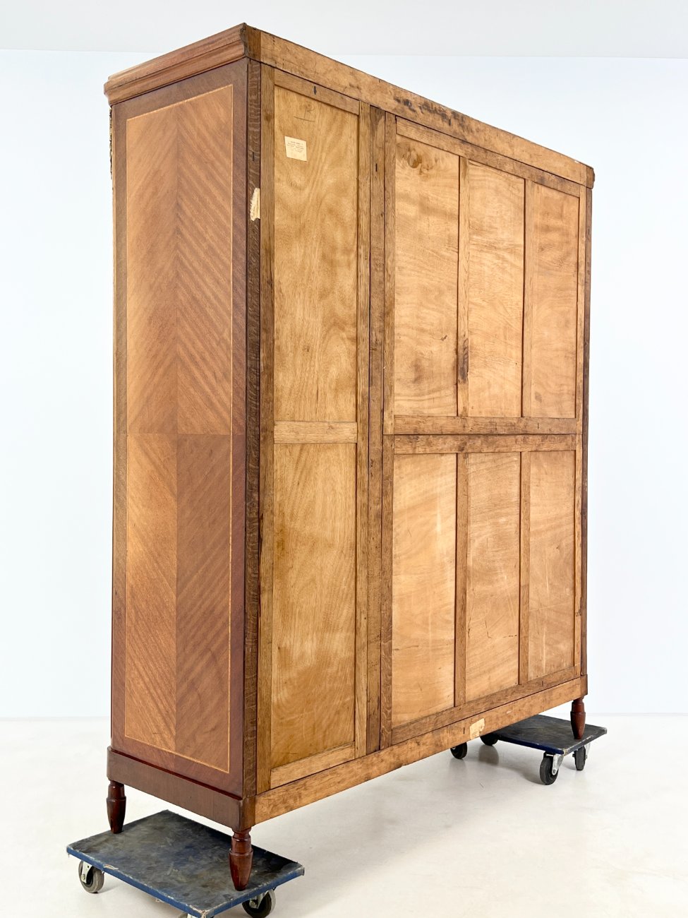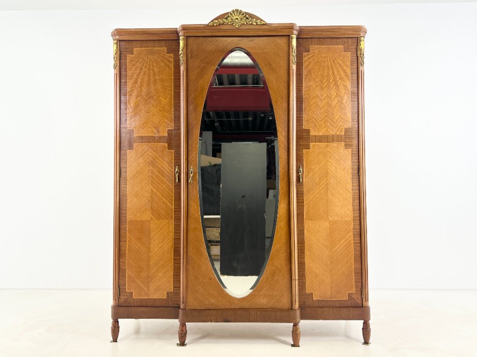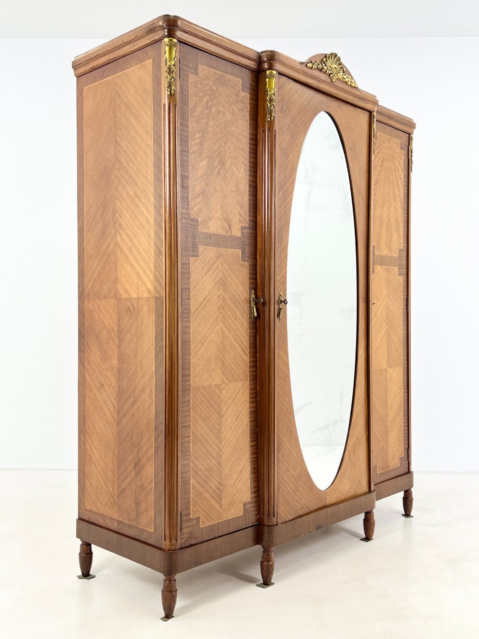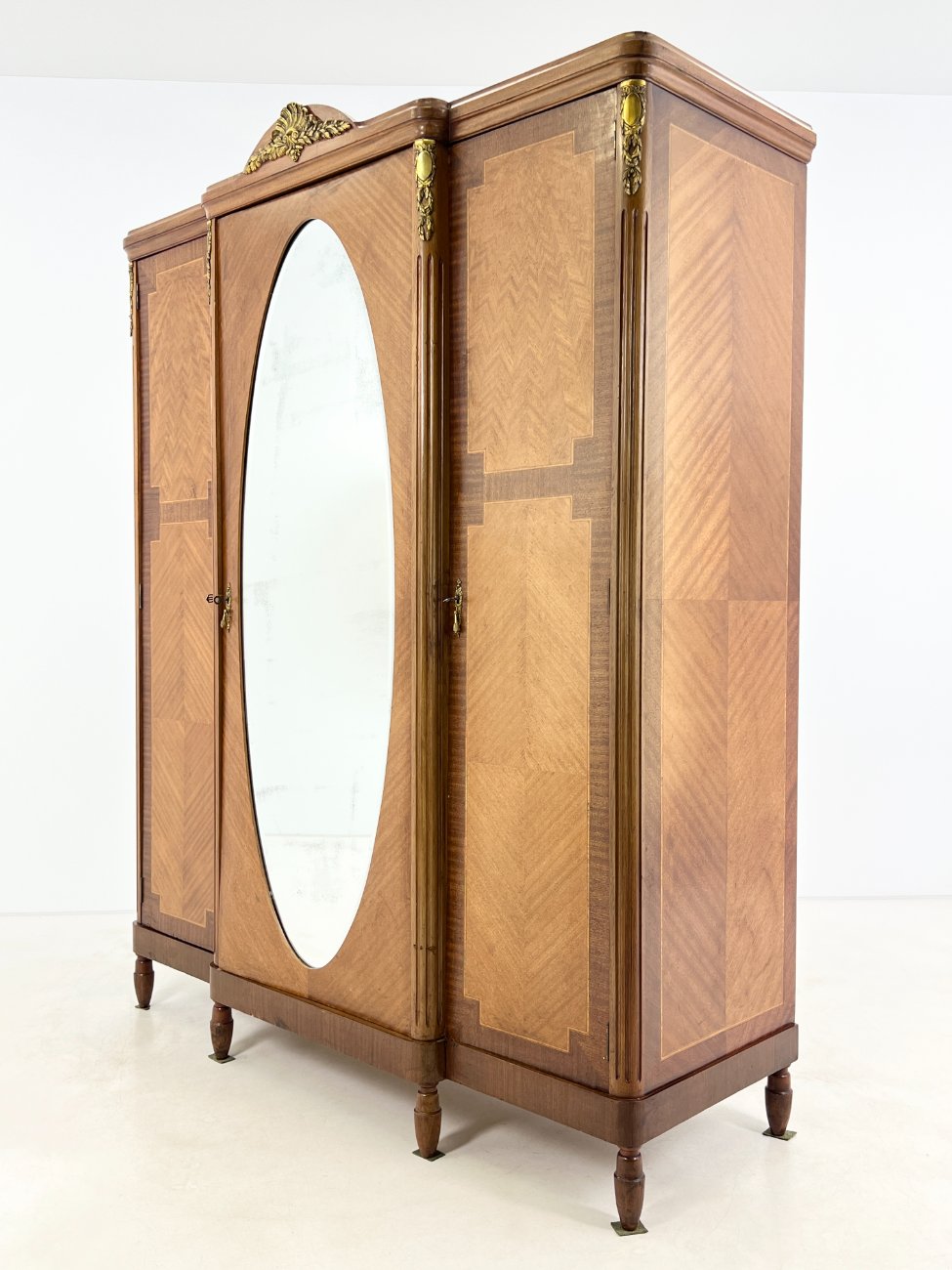 Riešutmedžio ir raudonmedžio lukšto rūbų spinta su veidrodžiu.