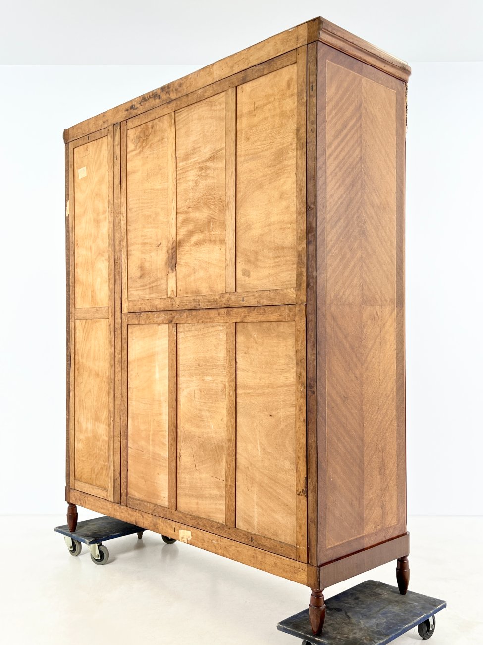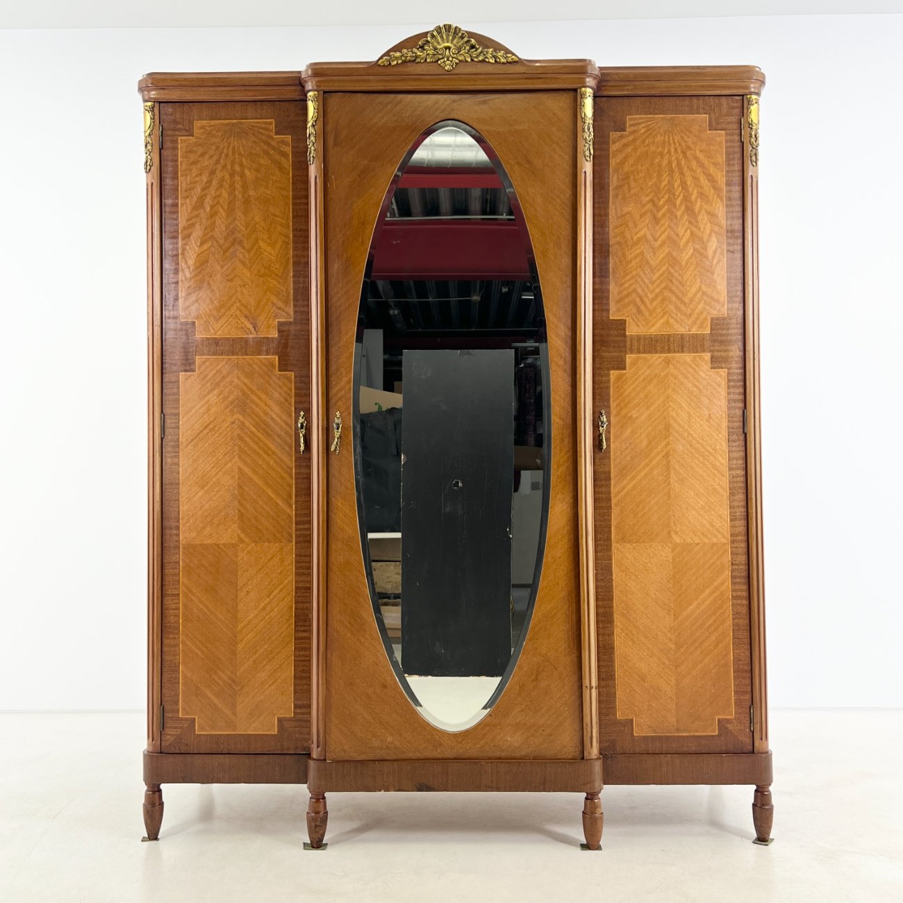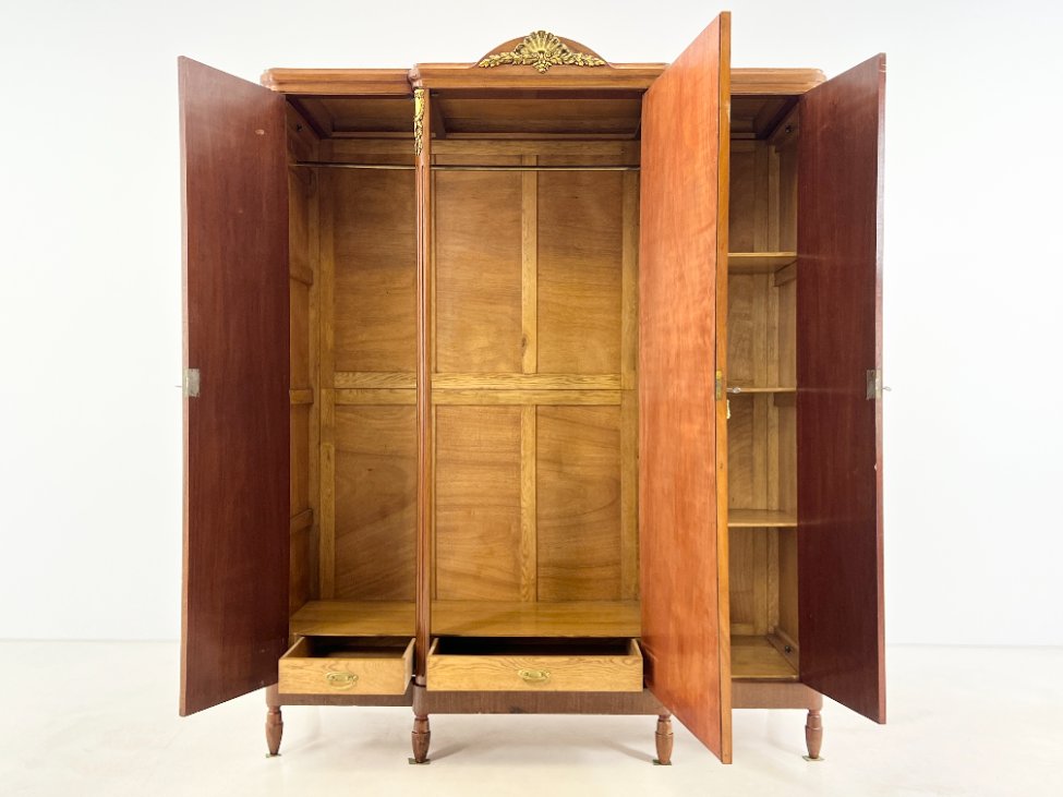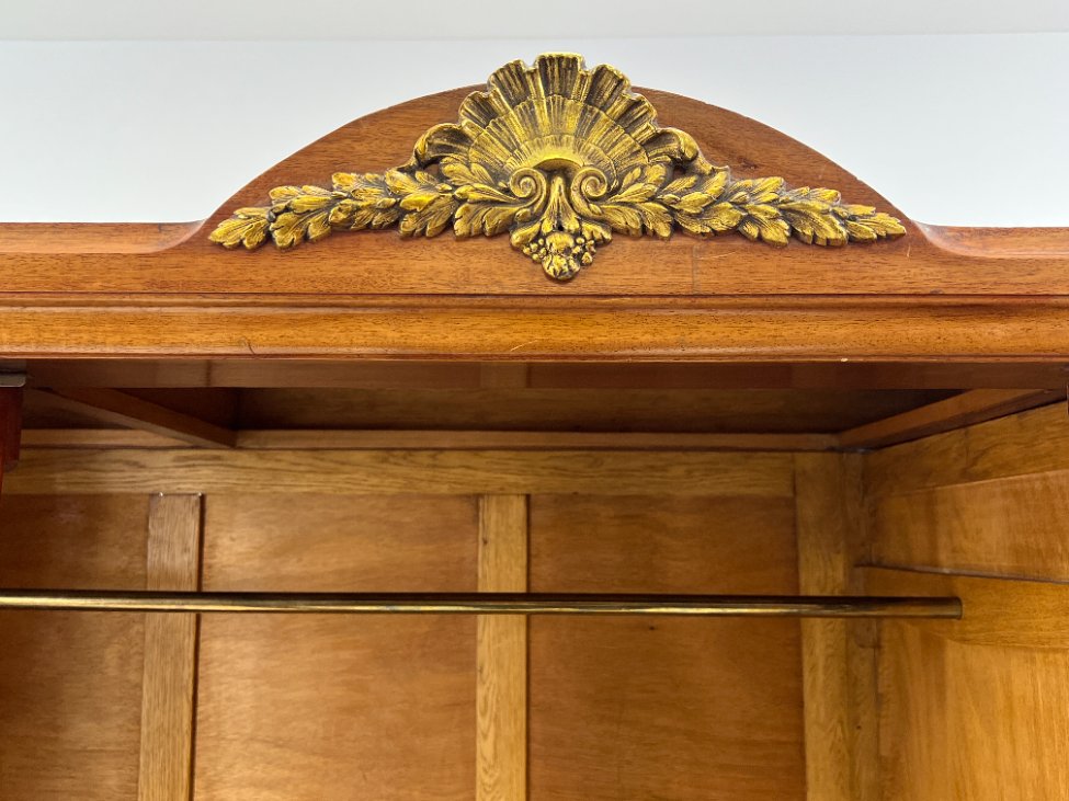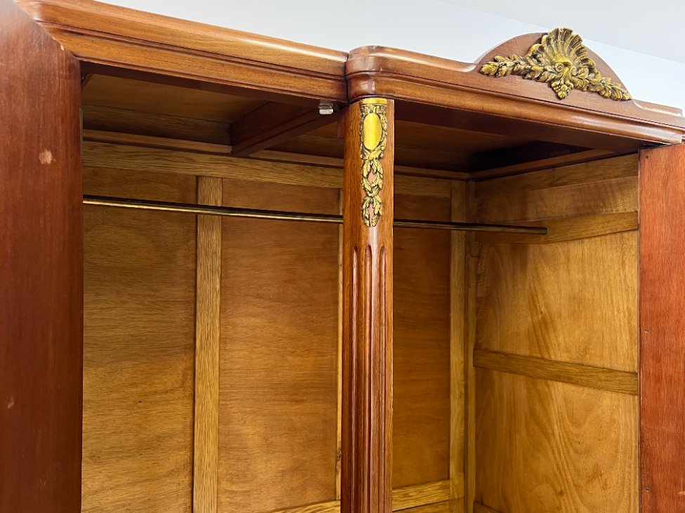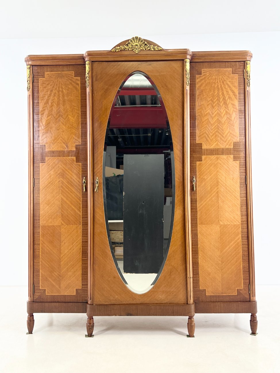 Riešutmedžio ir raudonmedžio lukšto rūbų spinta su veidrodžiu.
