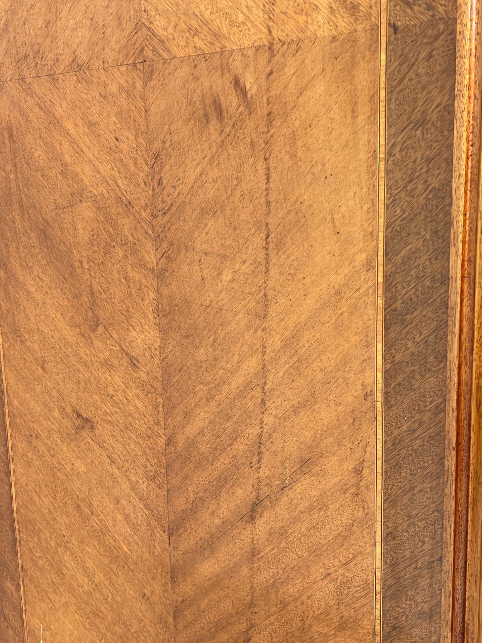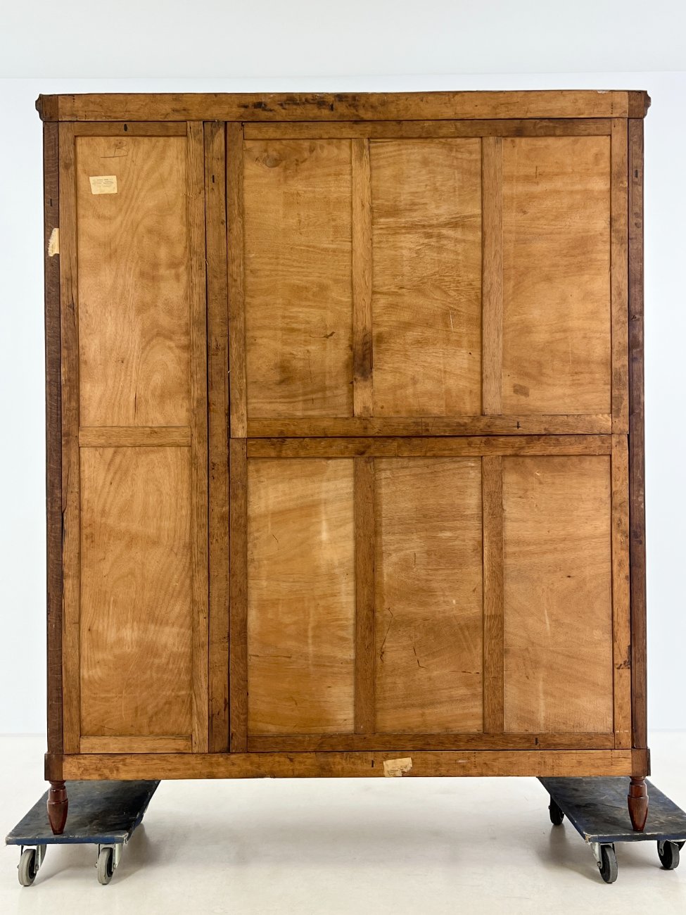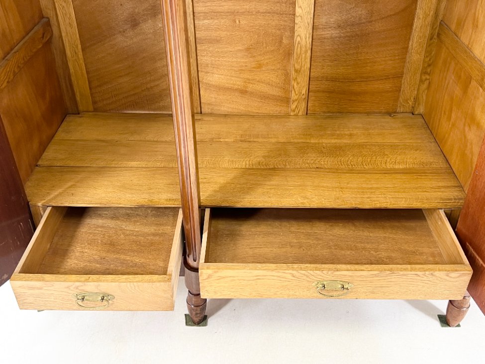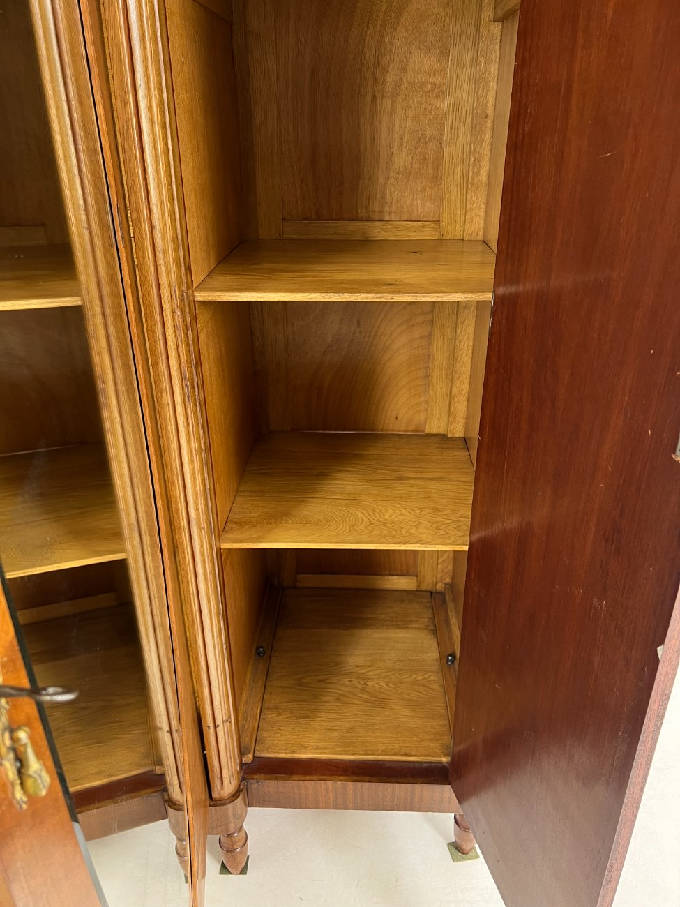 Riešutmedžio ir raudonmedžio lukšto rūbų spinta su veidrodžiu.