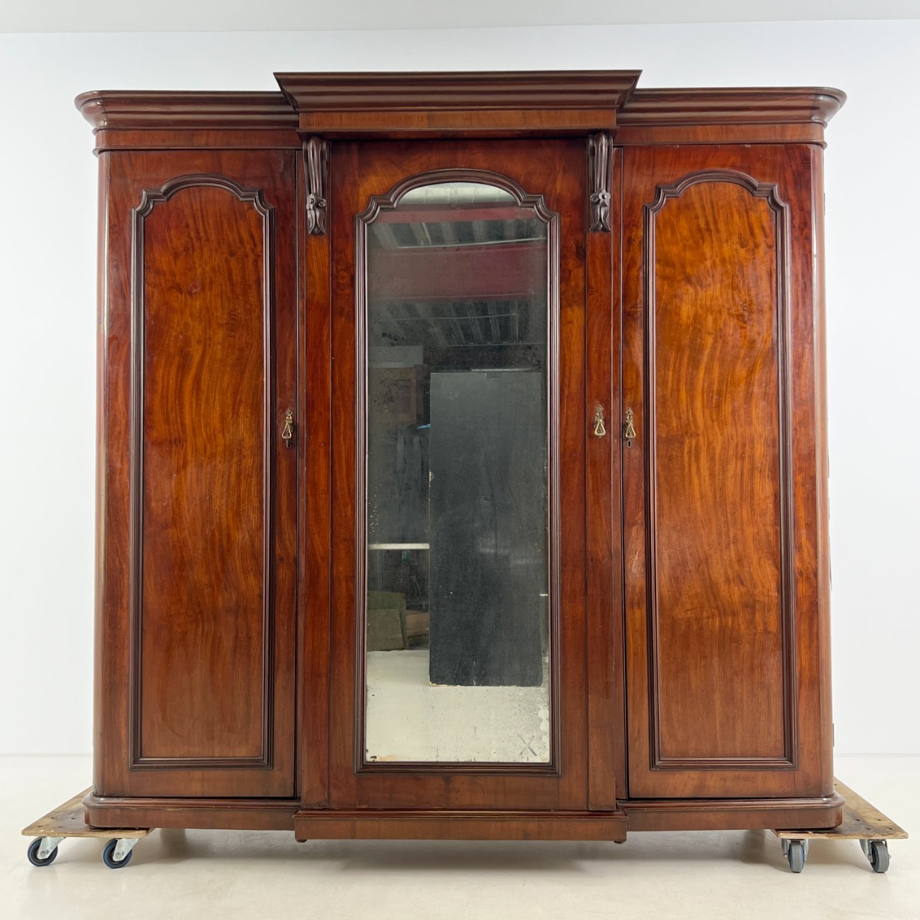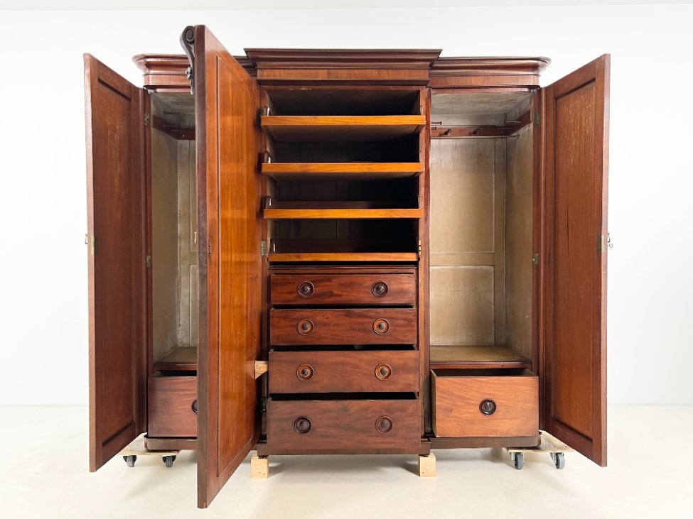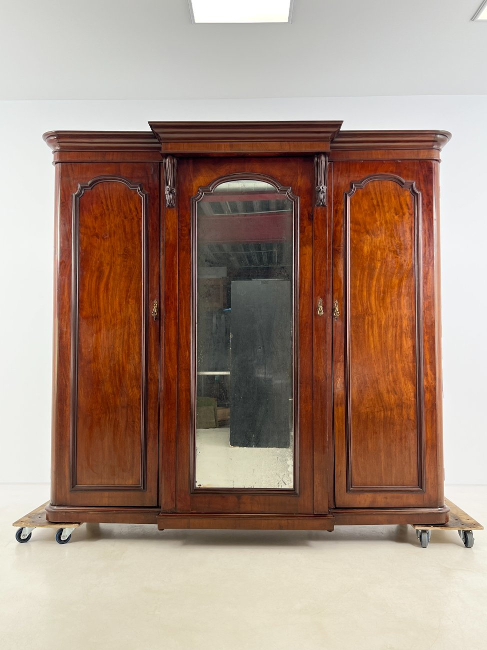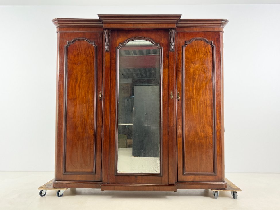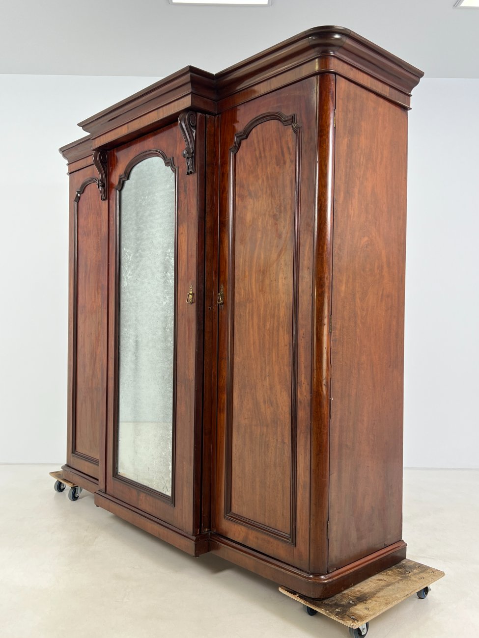 Trijų durų raudonmedžio rūbų spinta su veidrodžiu