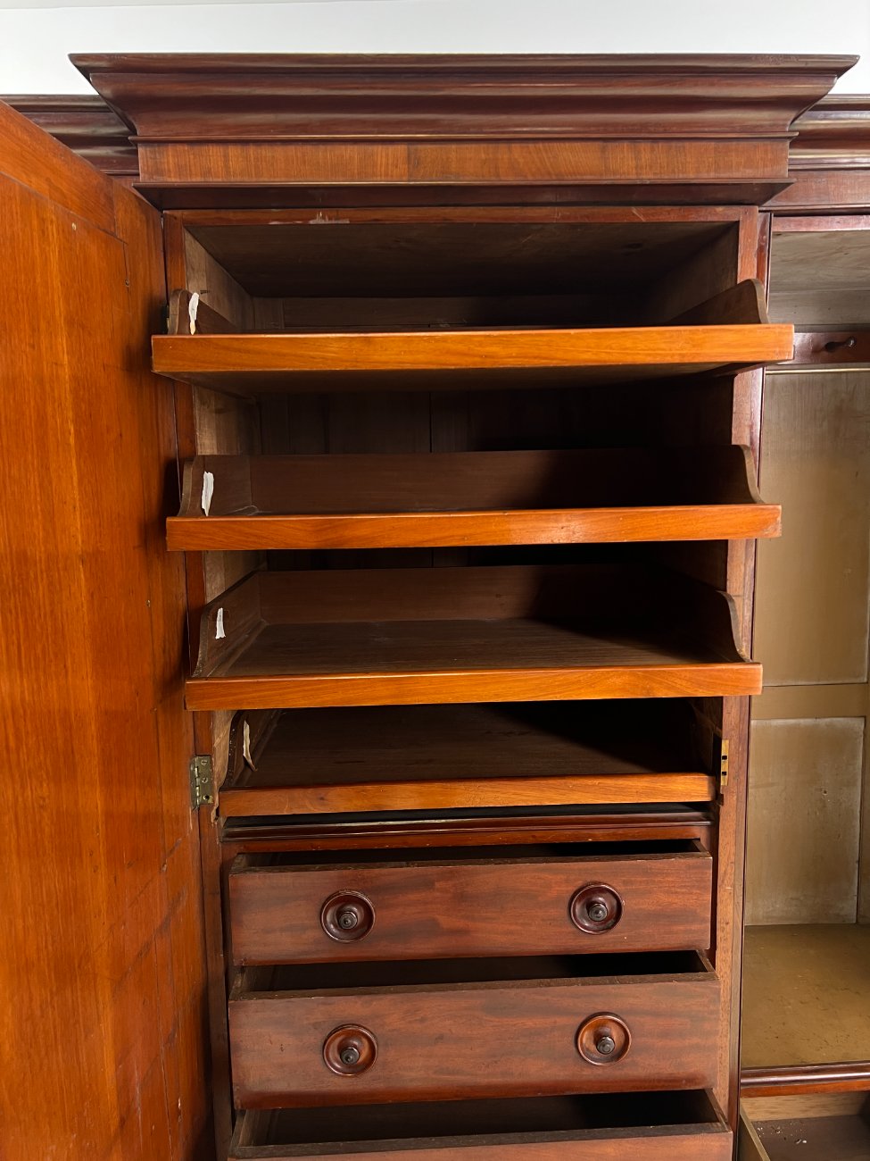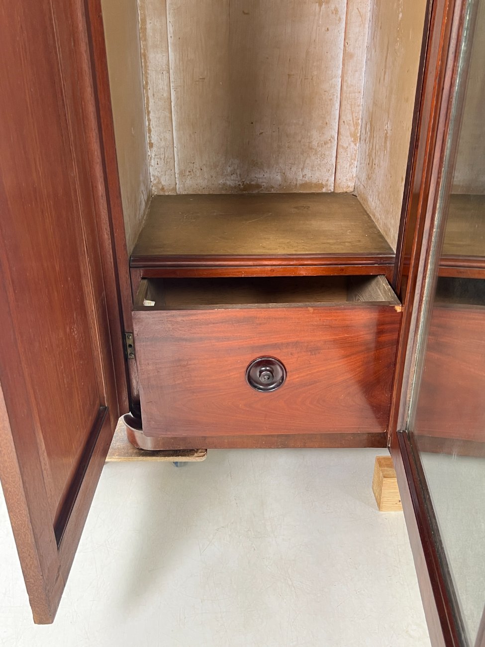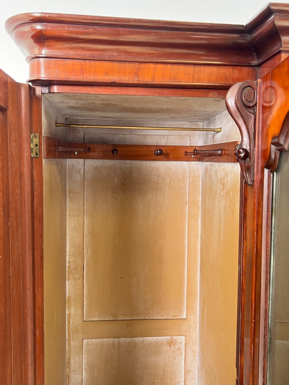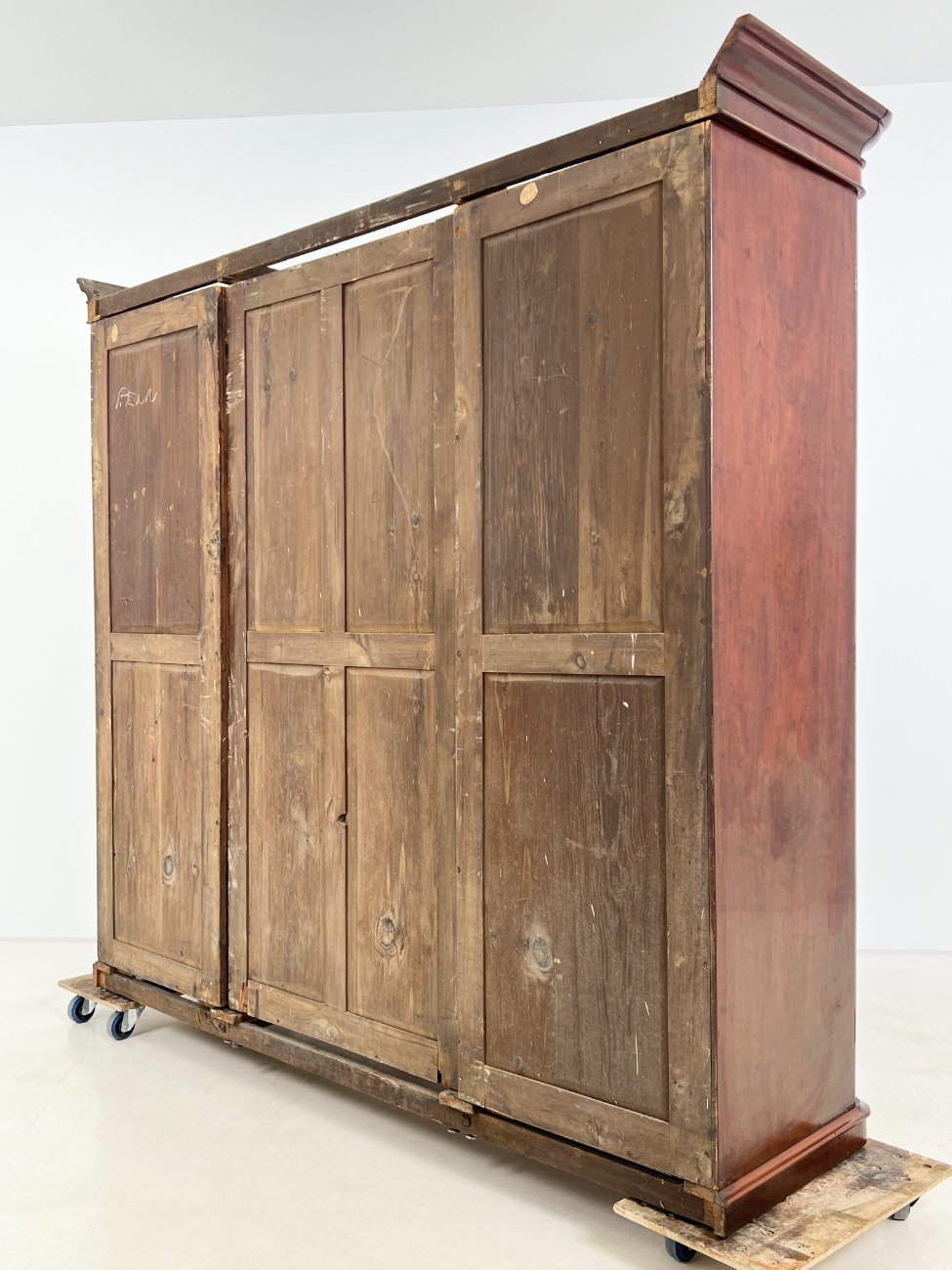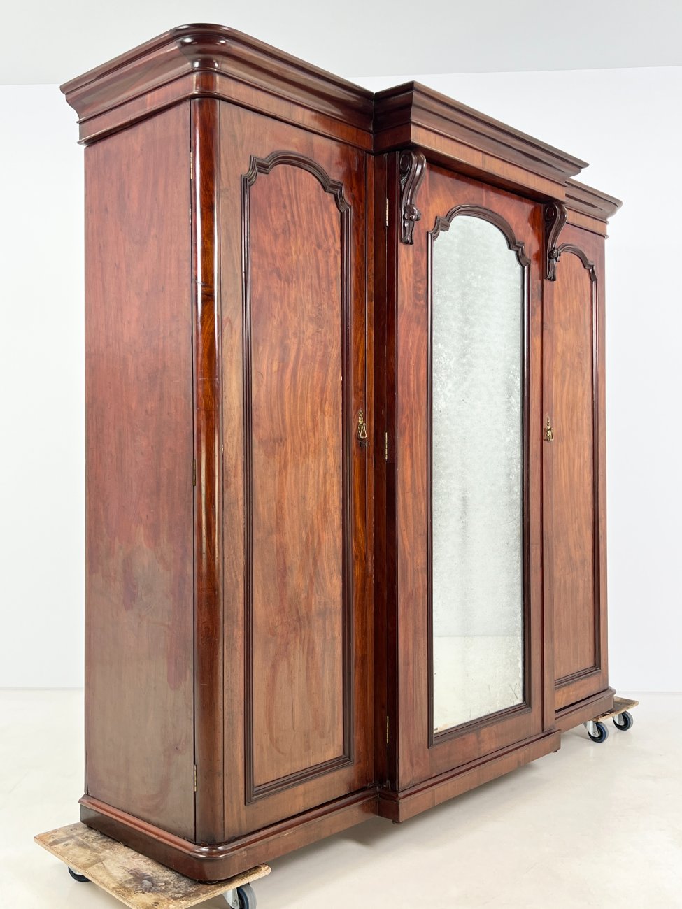 Trijų durų raudonmedžio rūbų spinta su veidrodžiu