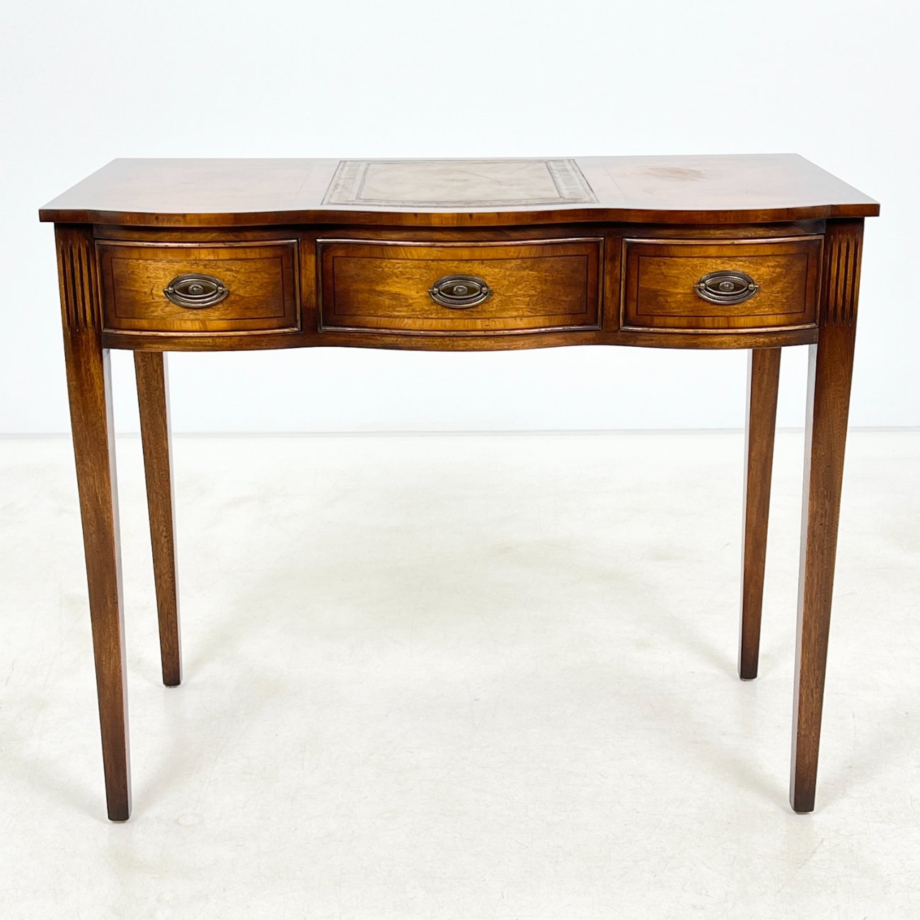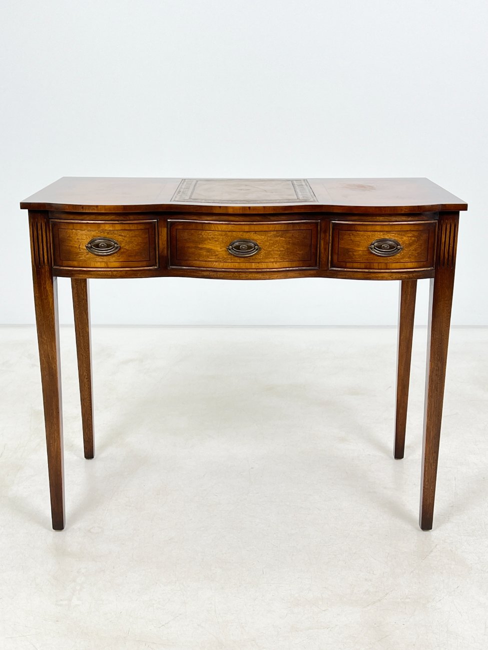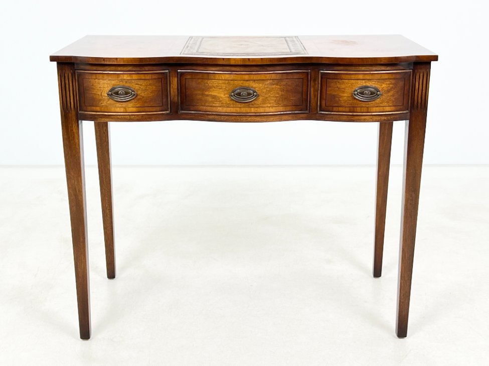 Angliško stiliaus trijų stalčių raudonmedžio rašomasis stalas.
