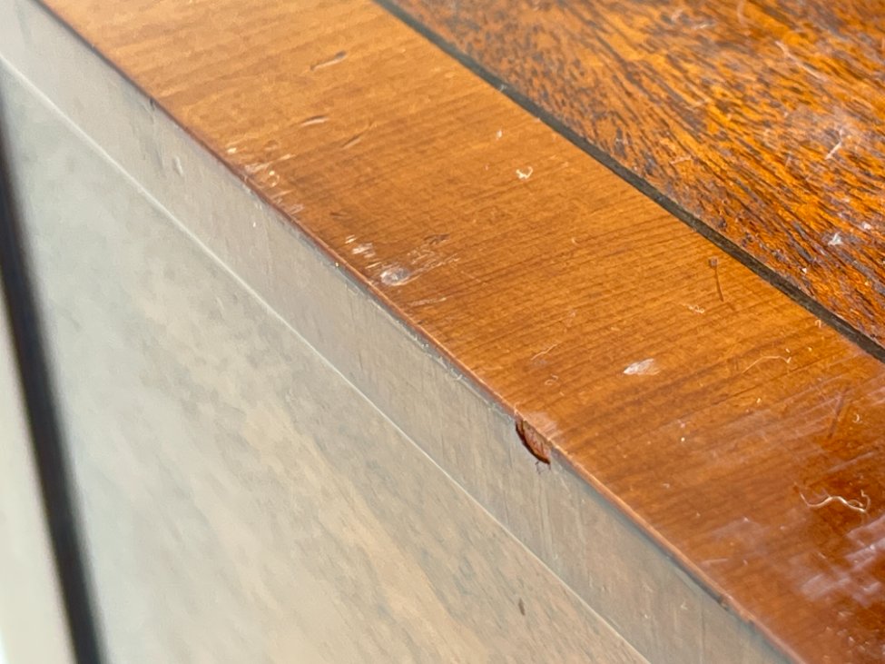 | Papildoma informacija | Ant stalviršio yra dėmių, dešinėje stalviršio pusėje matomas lako pažeidimas. Vietomis pablukusi medienos spalva. Per visą paviršių yra pabraižymų ir įmušimų. |
