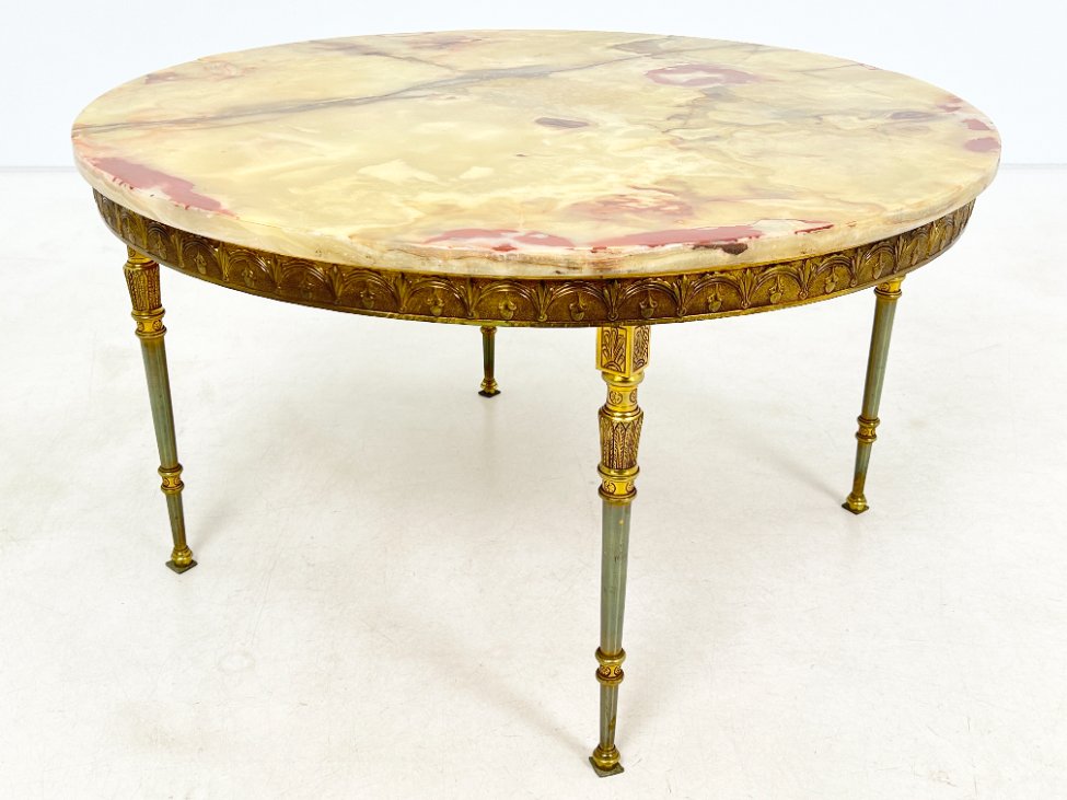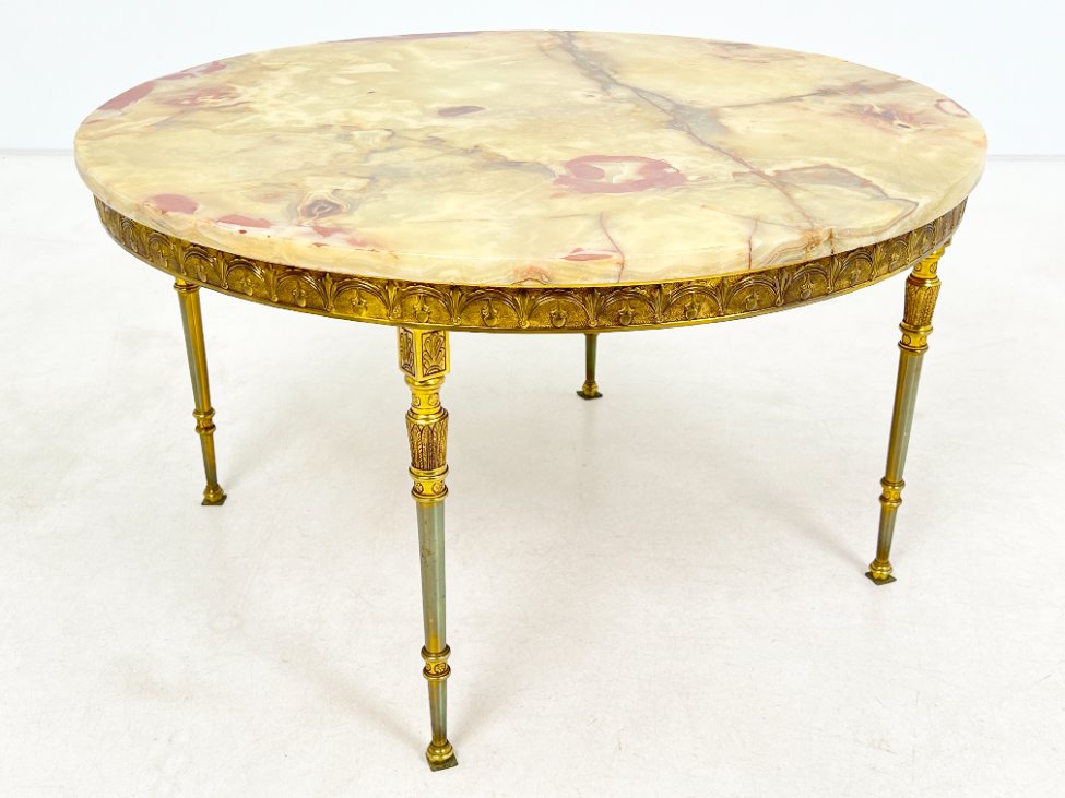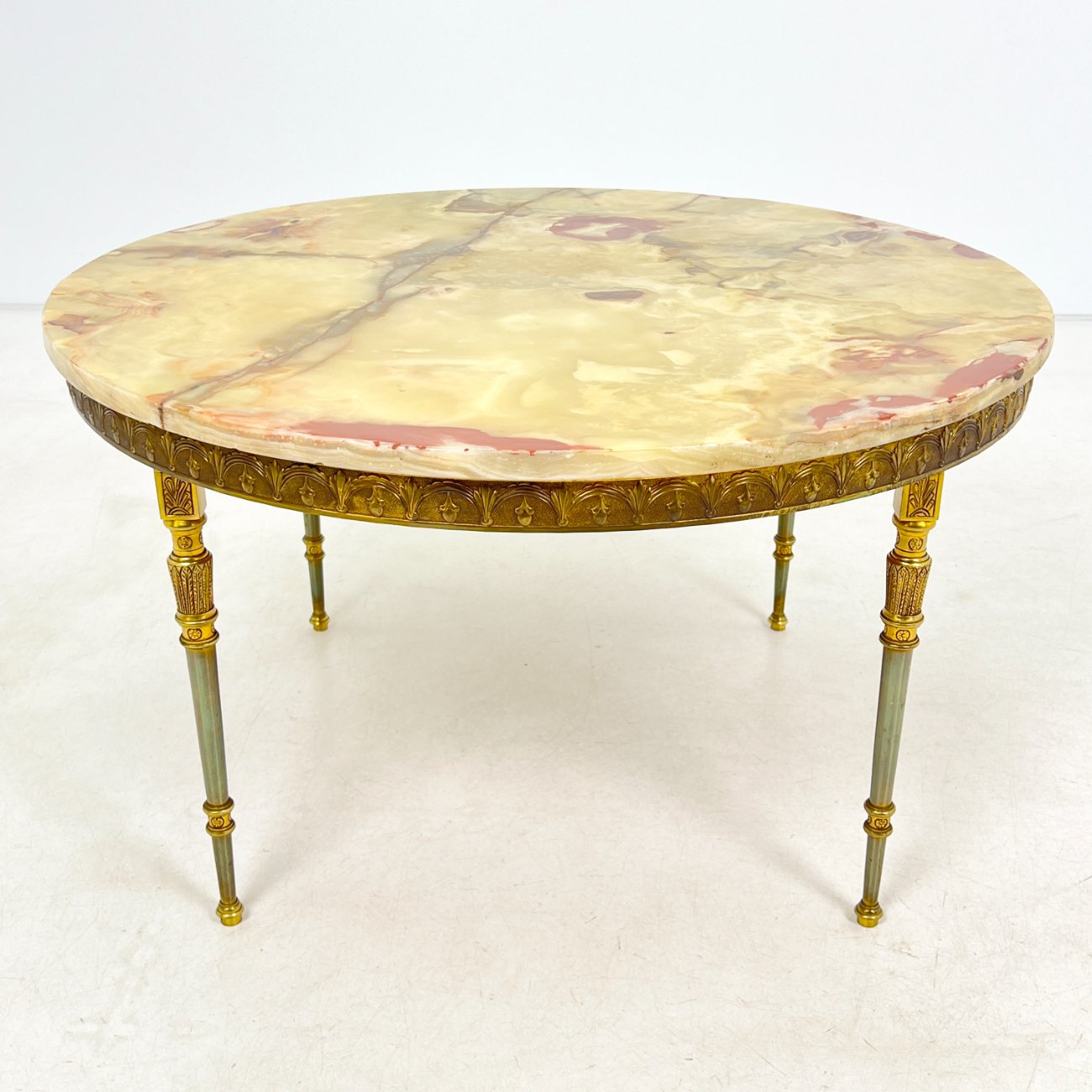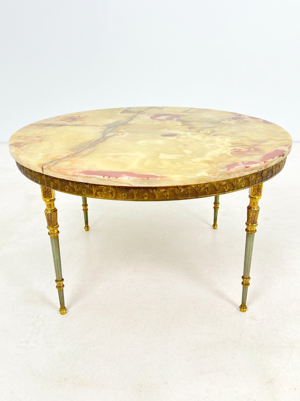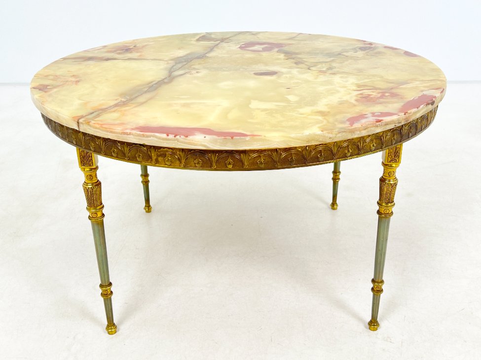 Apvalus žalvarinio rėmo staliukas su onikso stalviršiumi.