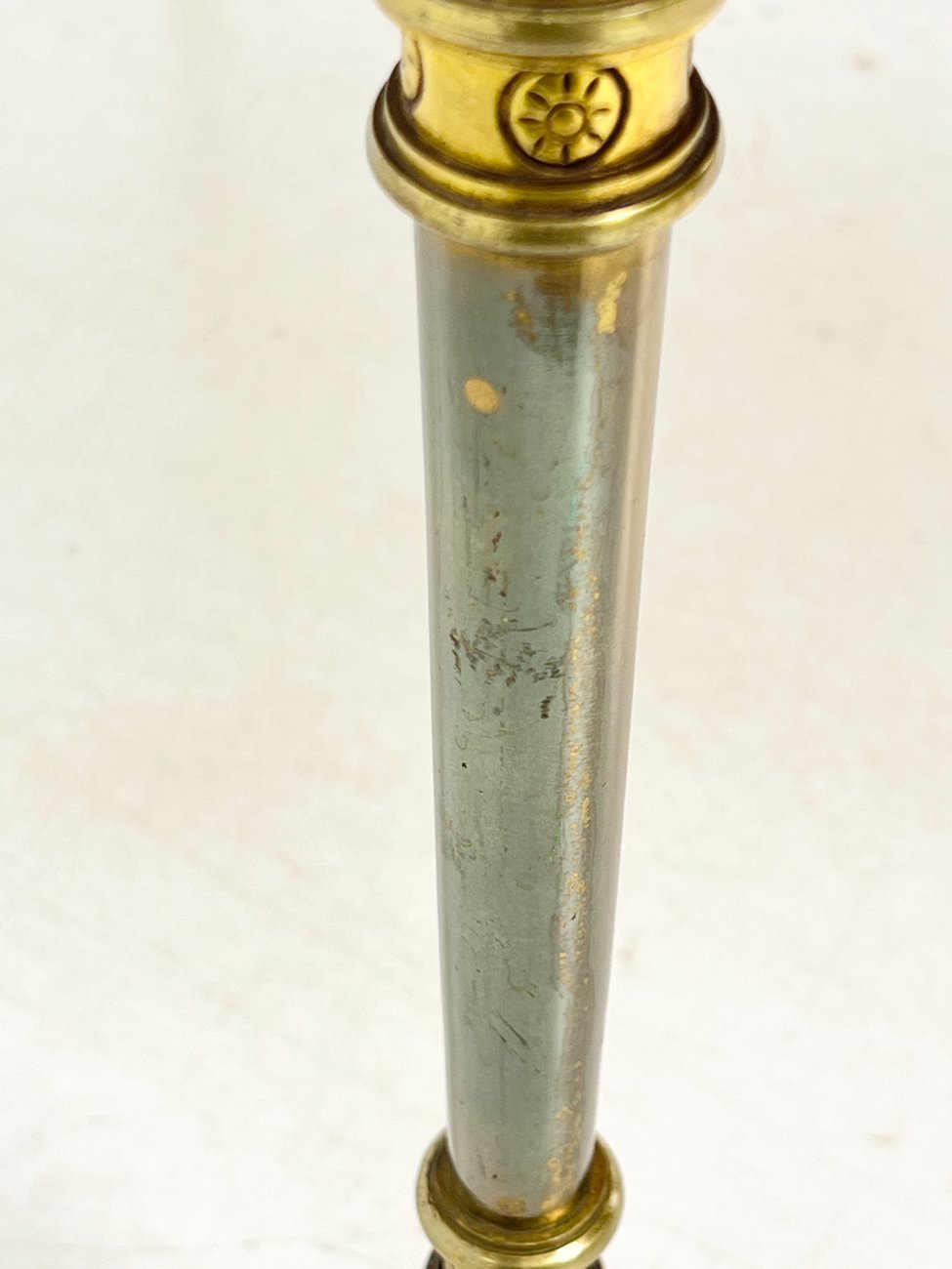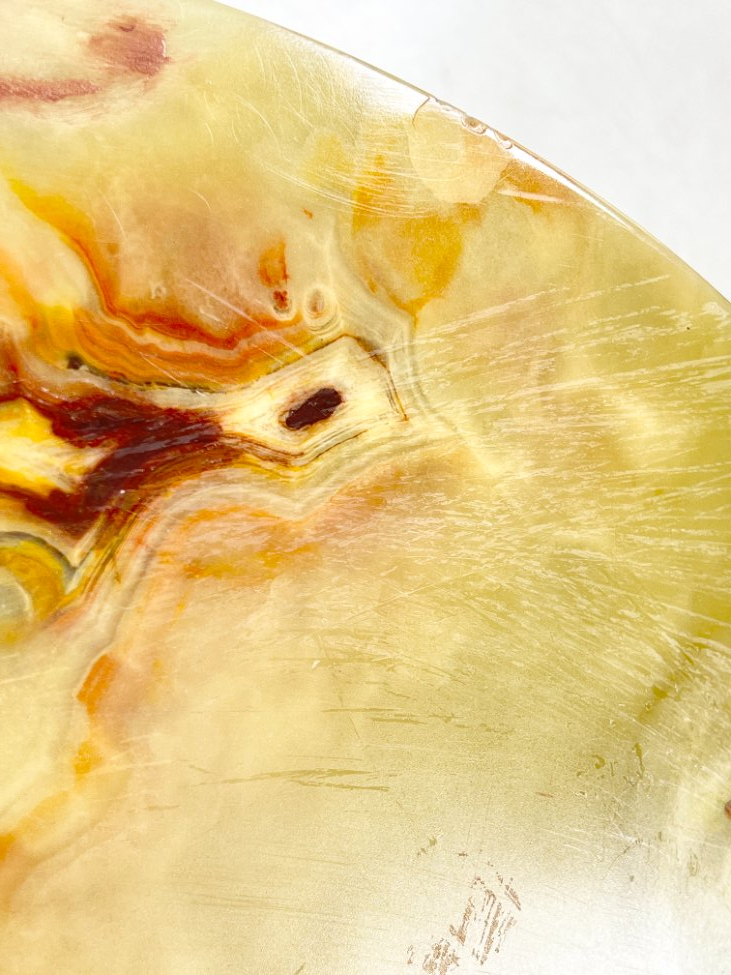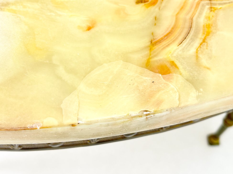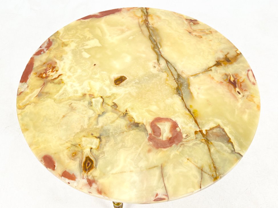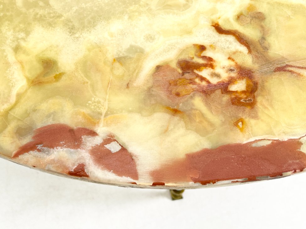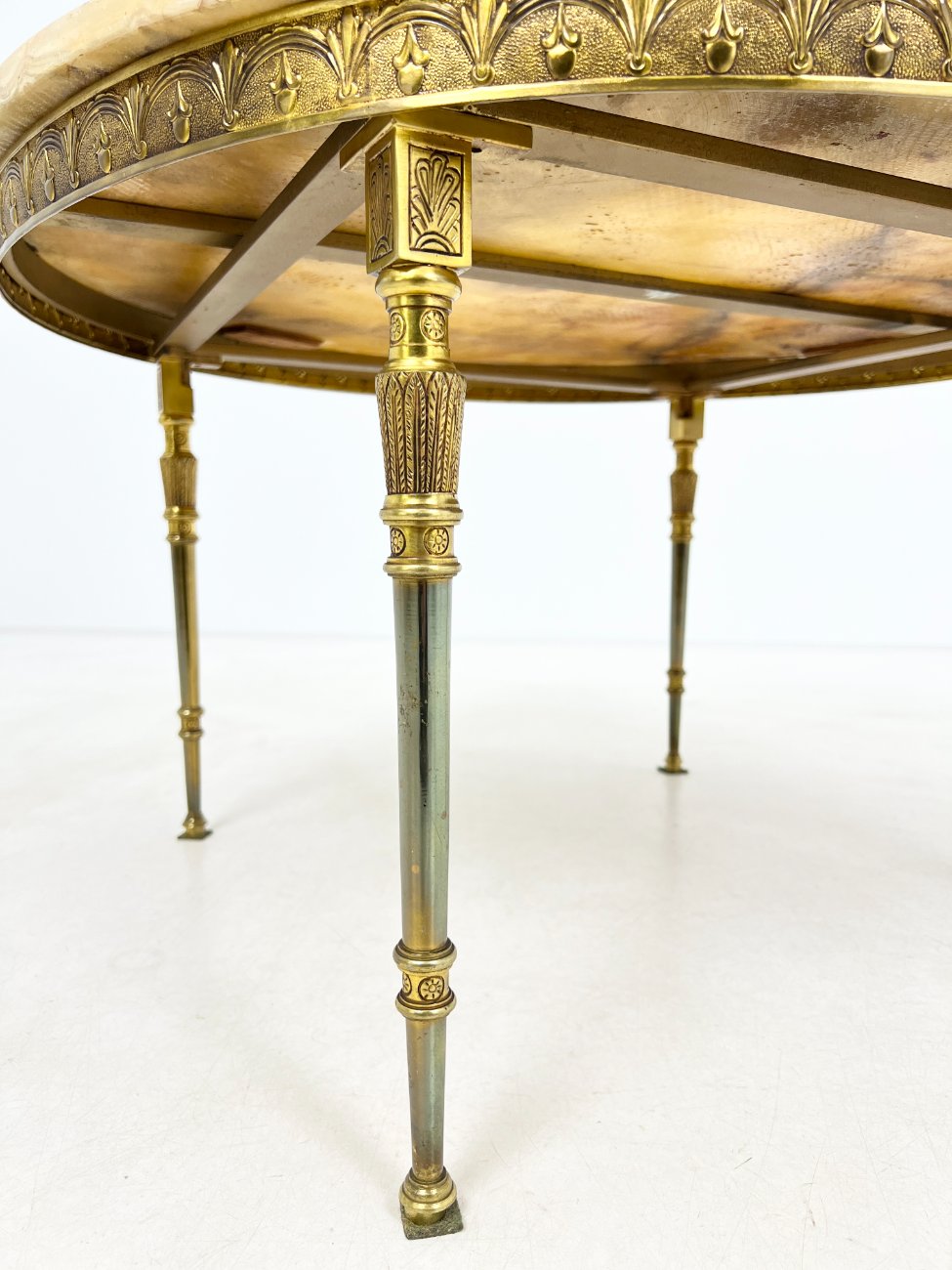 Apvalus žalvarinio rėmo staliukas su onikso stalviršiumi.