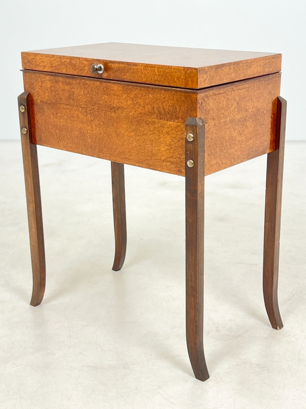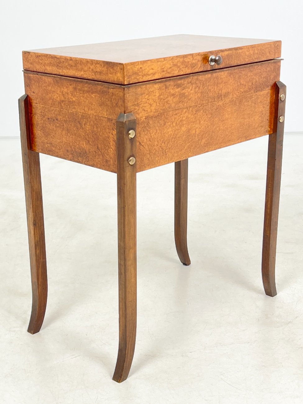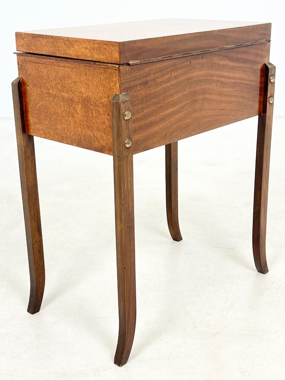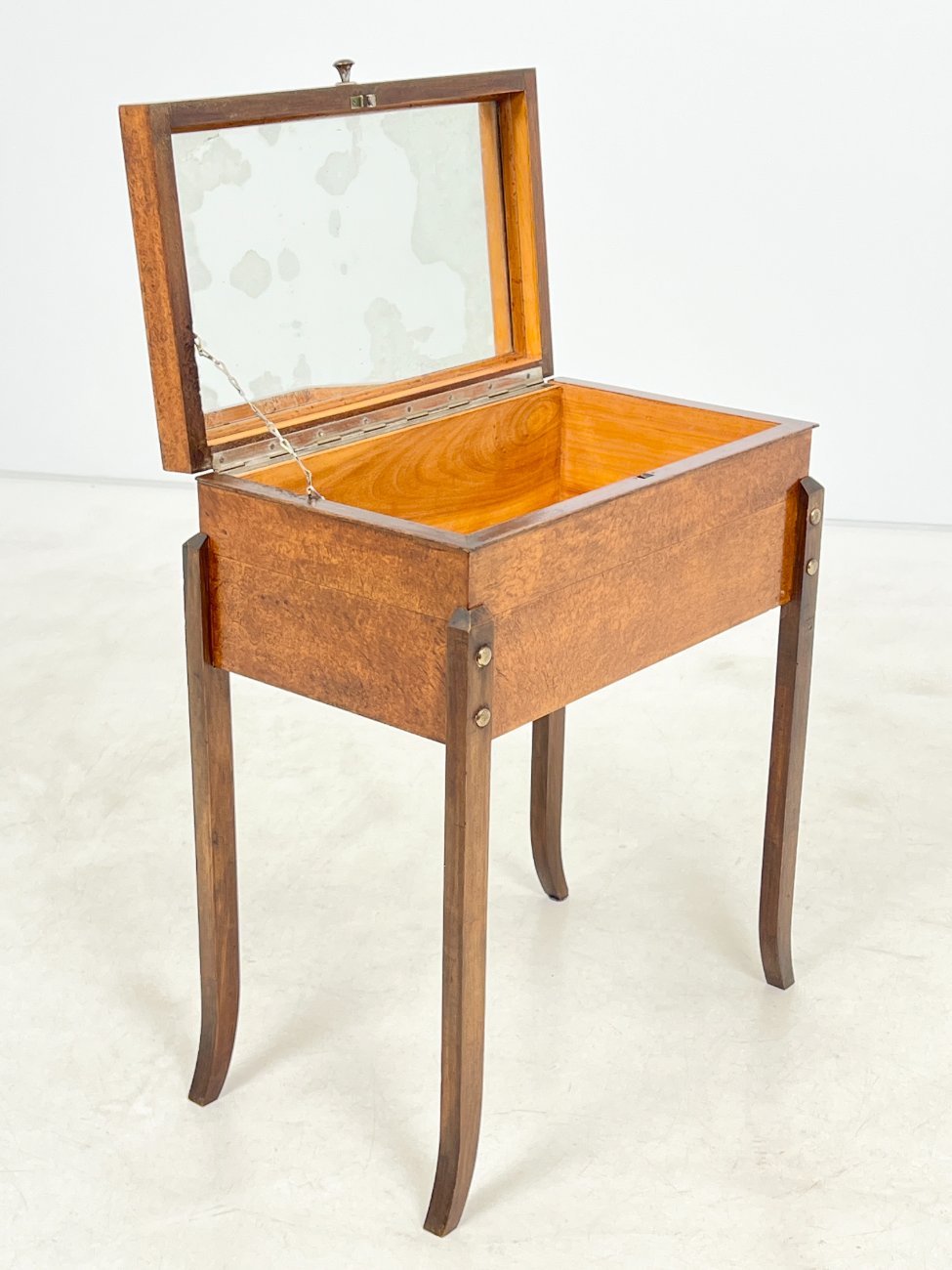 Art Deco riešutmedžio siuvinėjimo staliukas atveriamu stalviršiumi su veidrodžiu.
