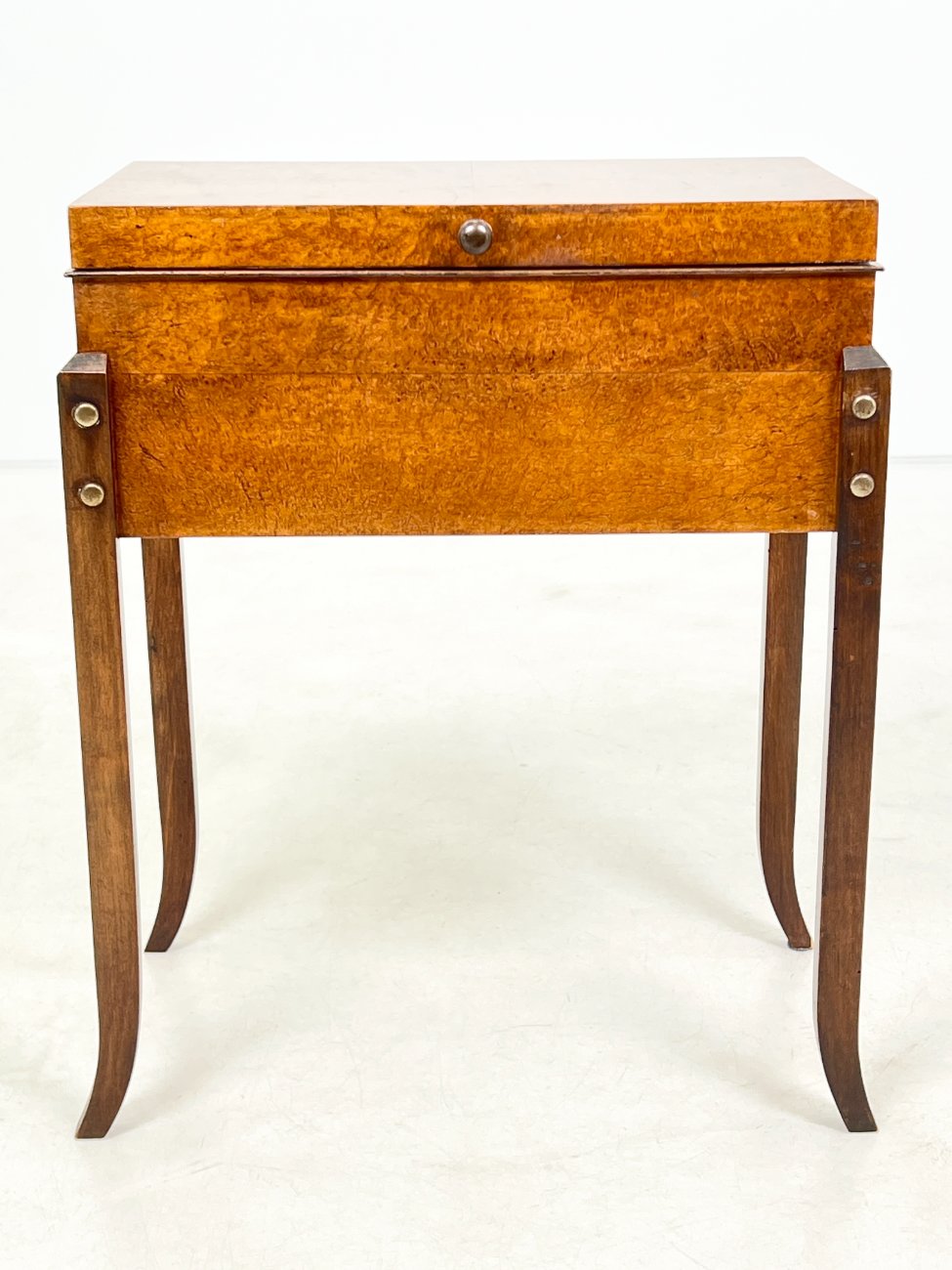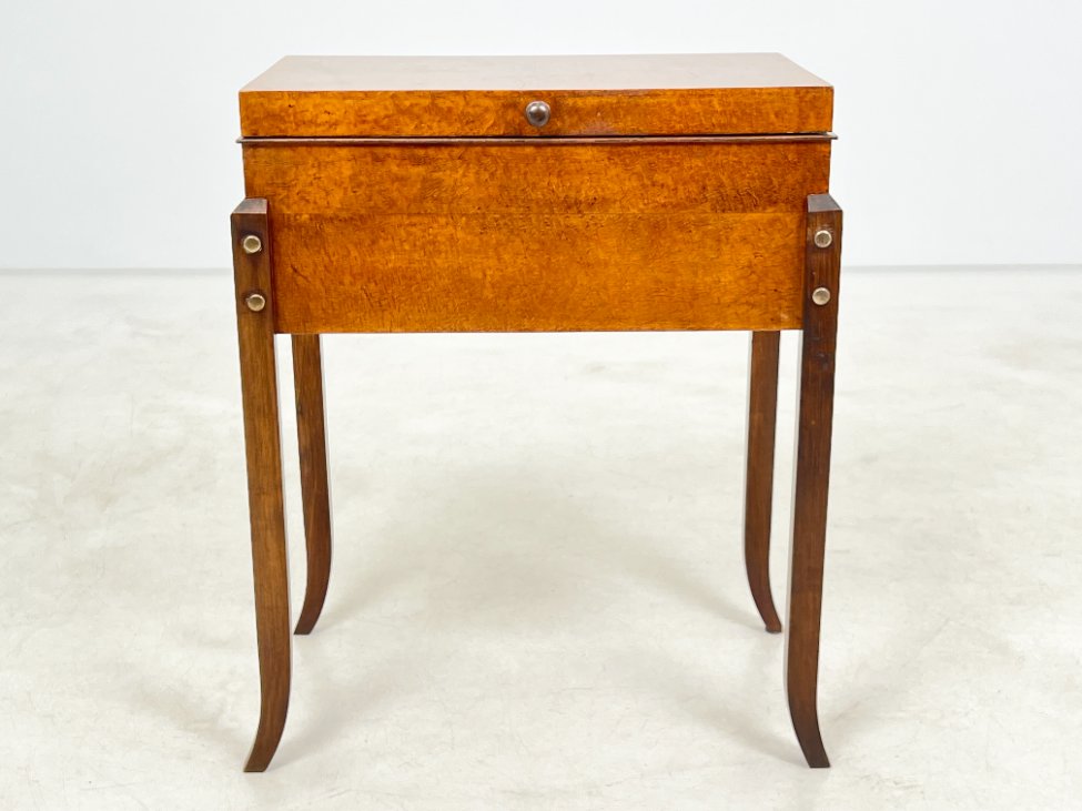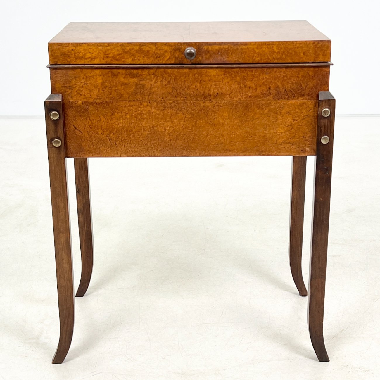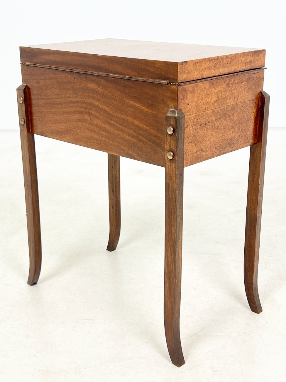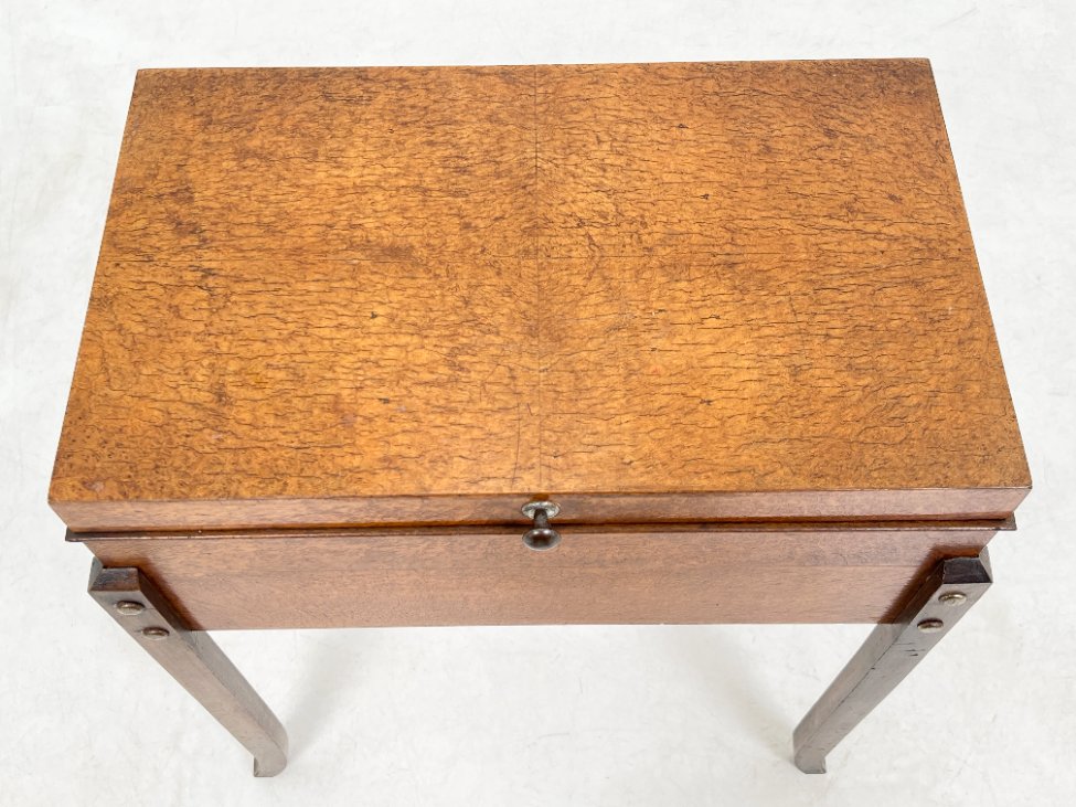 Art Deco riešutmedžio siuvinėjimo staliukas atveriamu stalviršiumi su veidrodžiu.