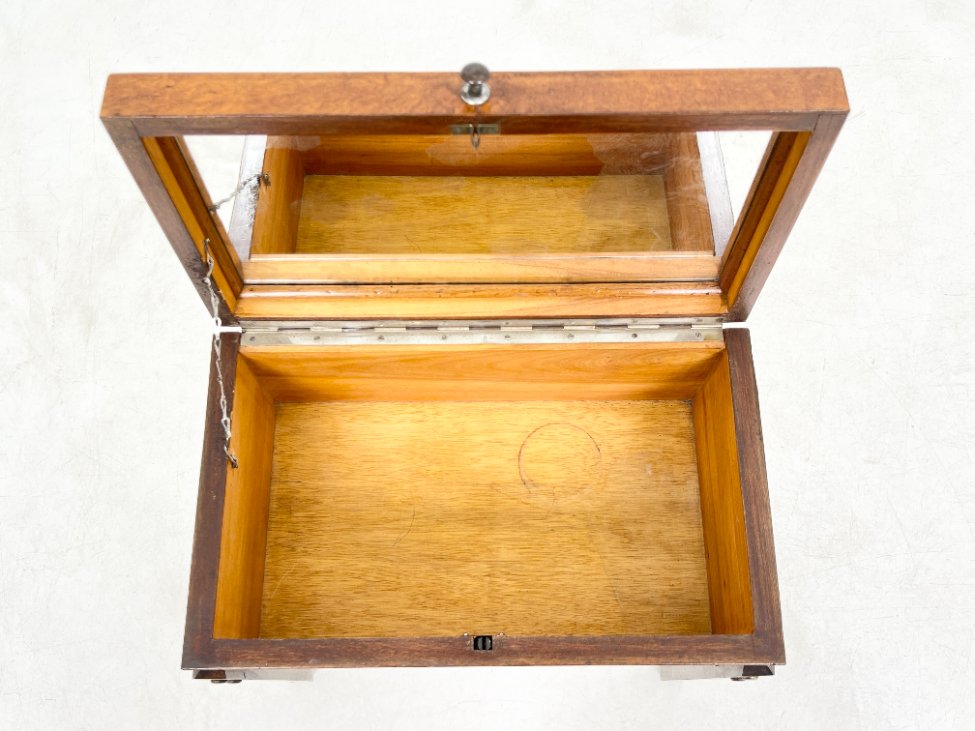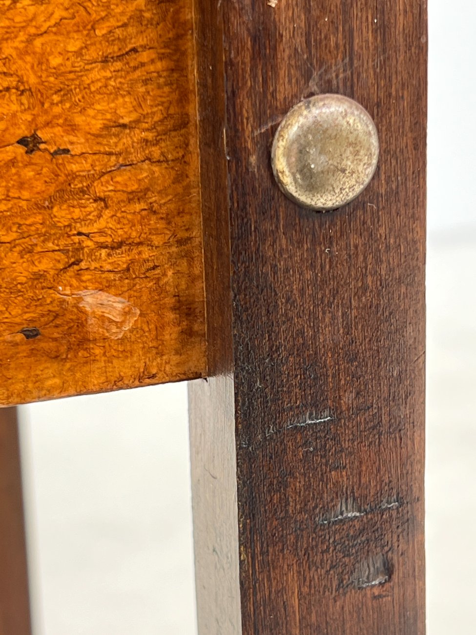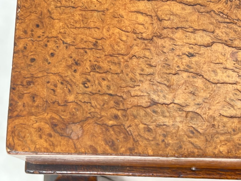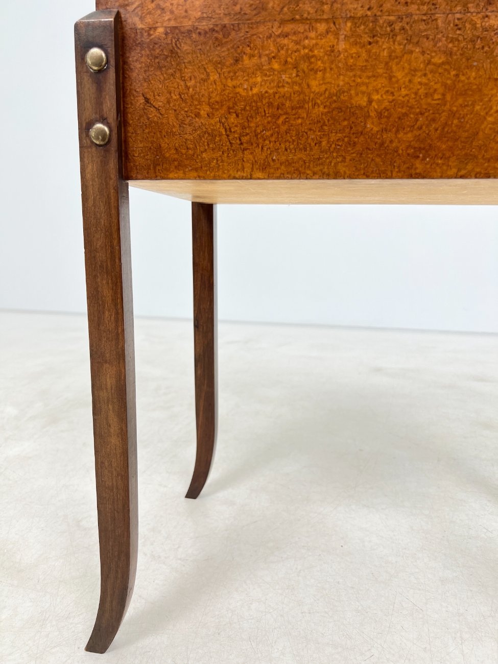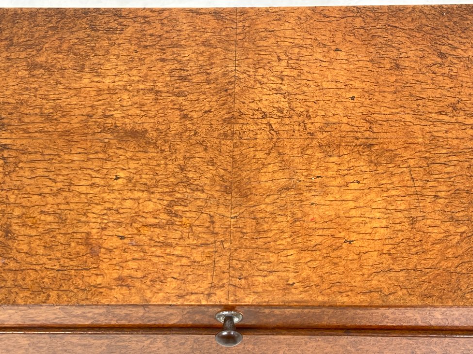 Art Deco riešutmedžio siuvinėjimo staliukas atveriamu stalviršiumi su veidrodžiu.