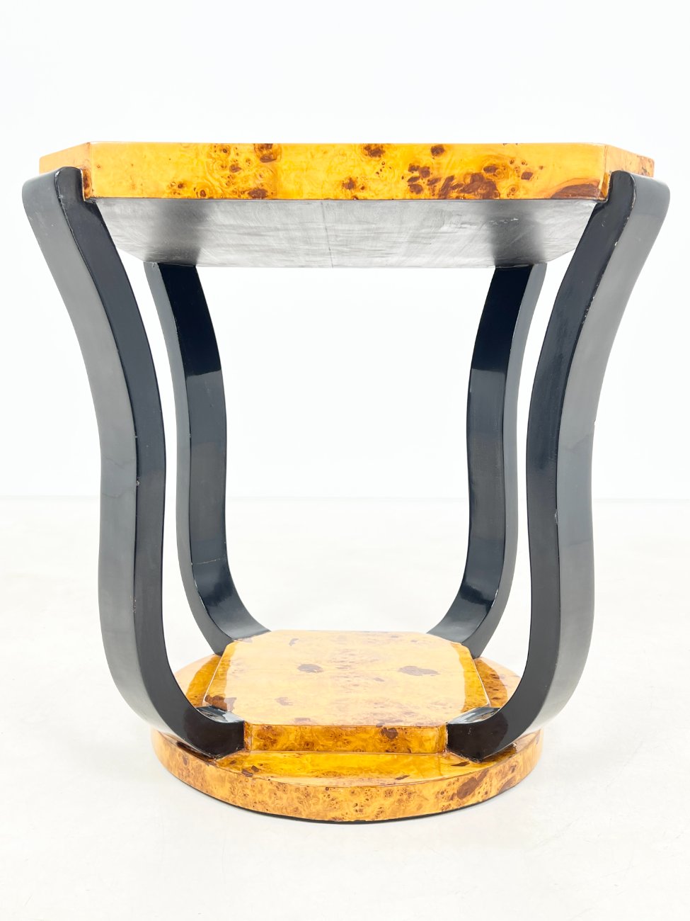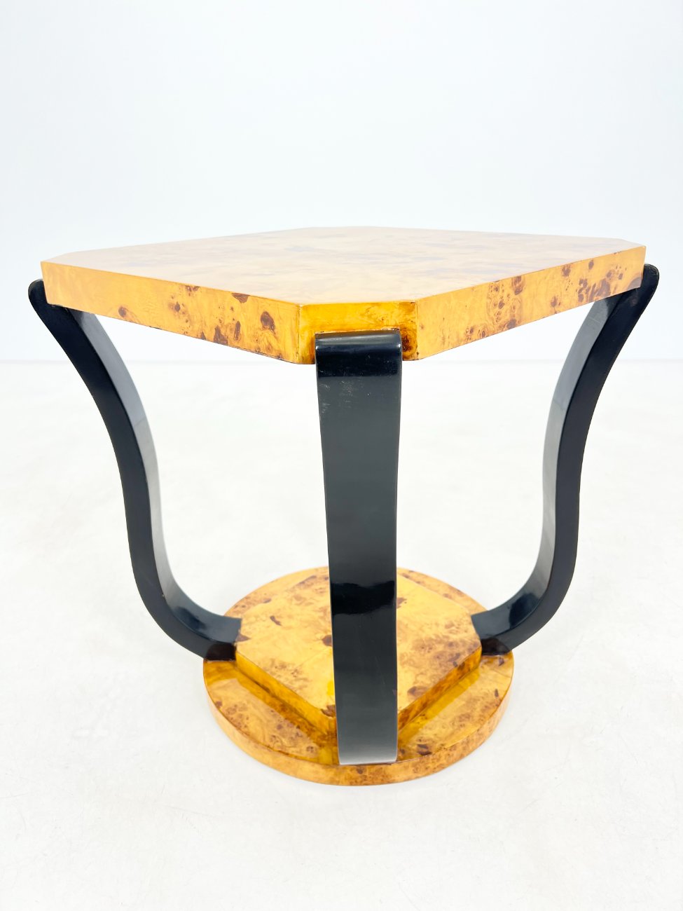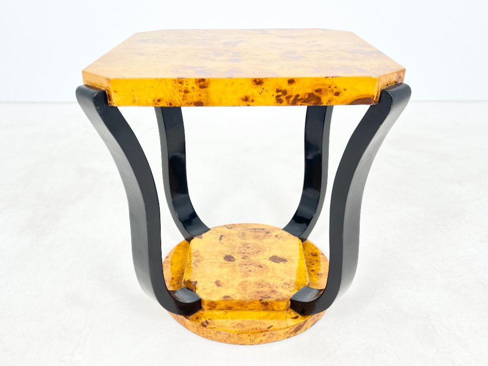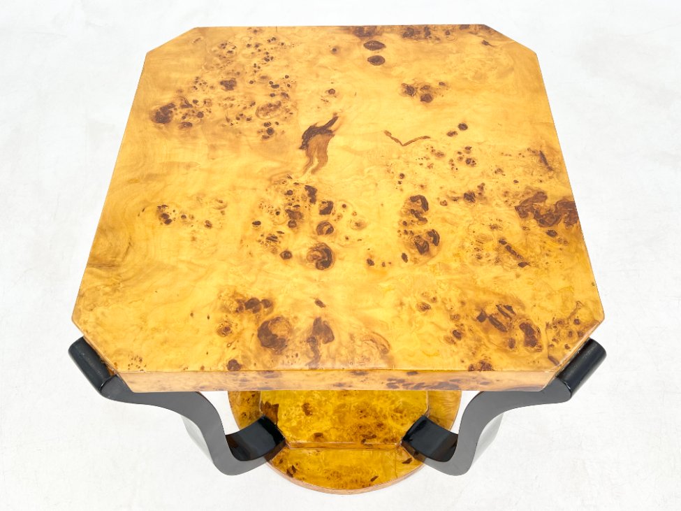 Art deco stiliaus kvadratinis riešutmedžio lukšto staliukas