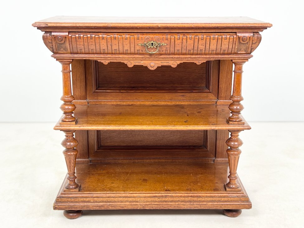 Ąžuolinė vieno stalčiaus konsolė su dviejomis lentynomis.