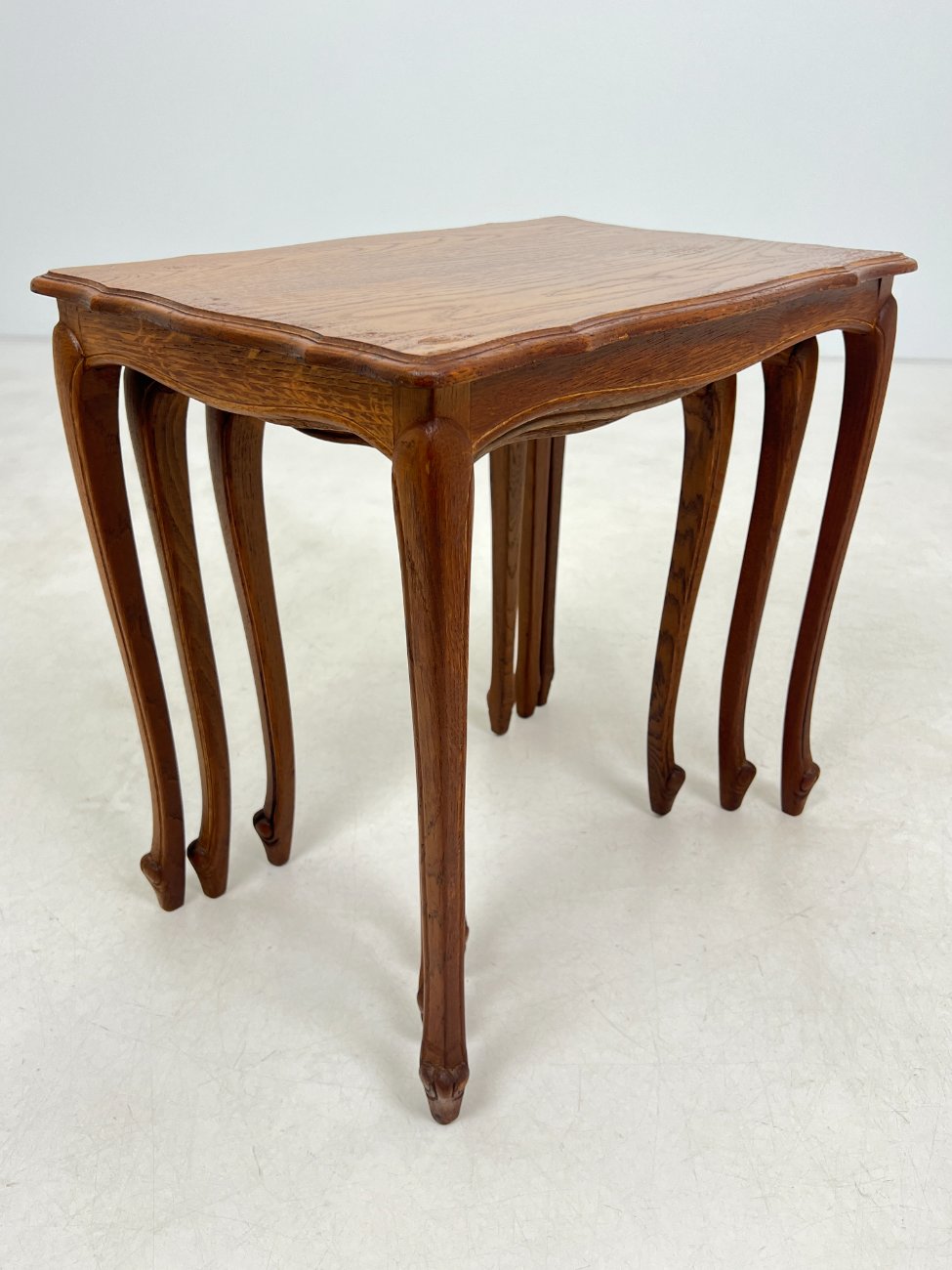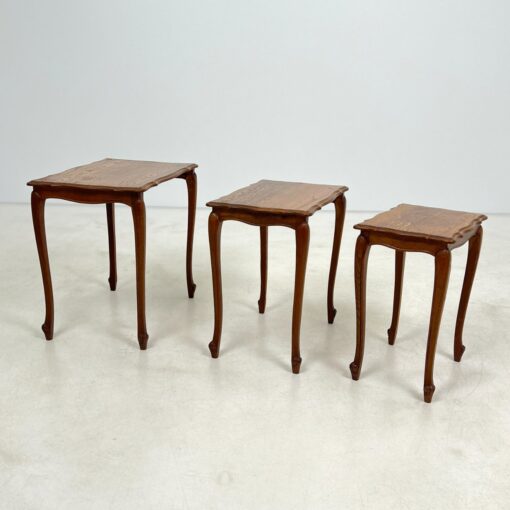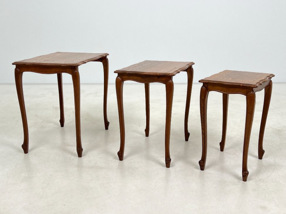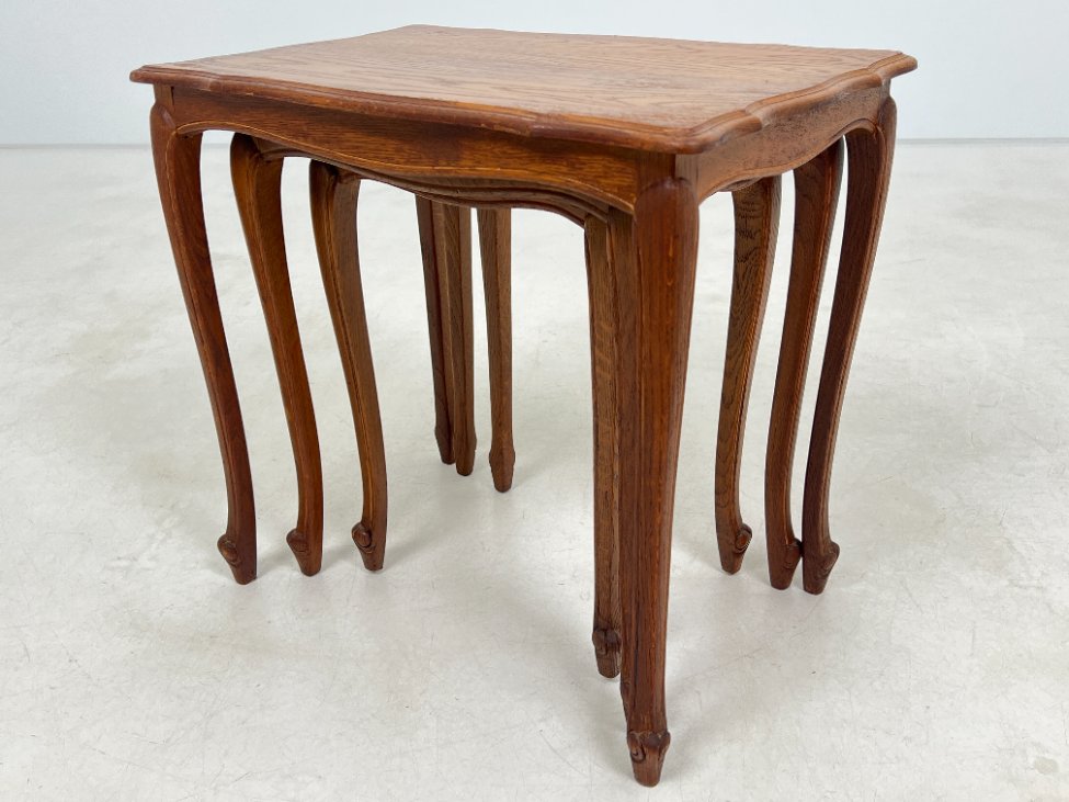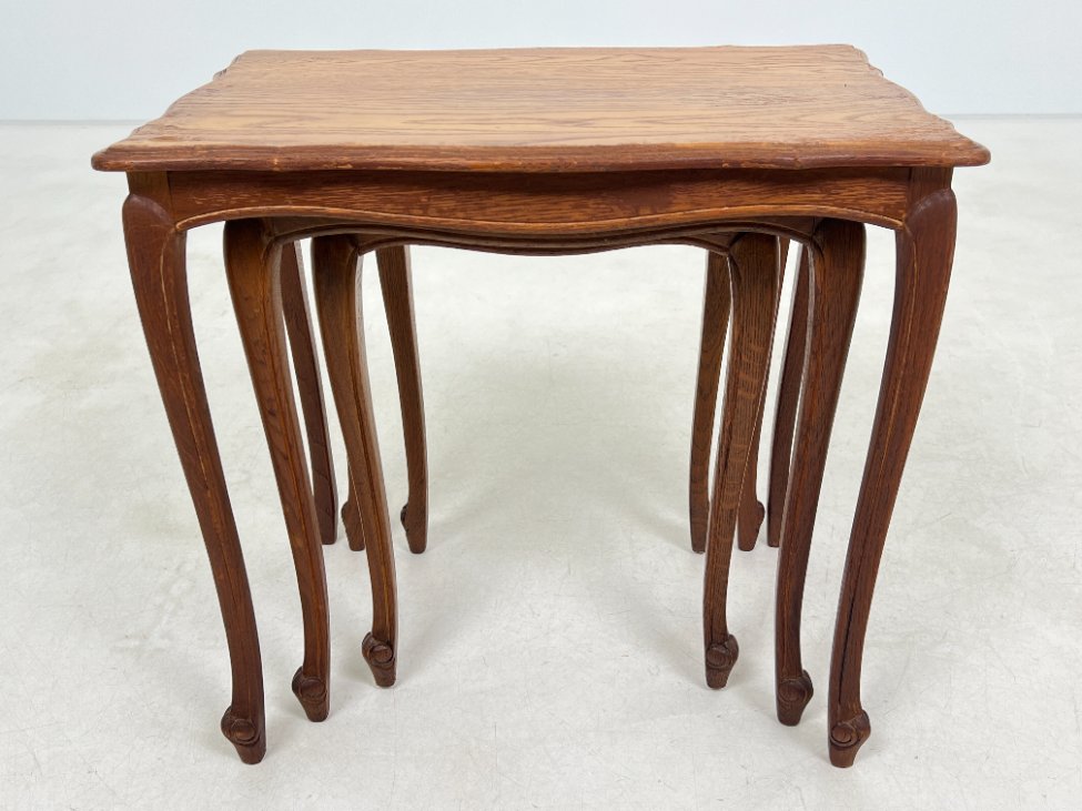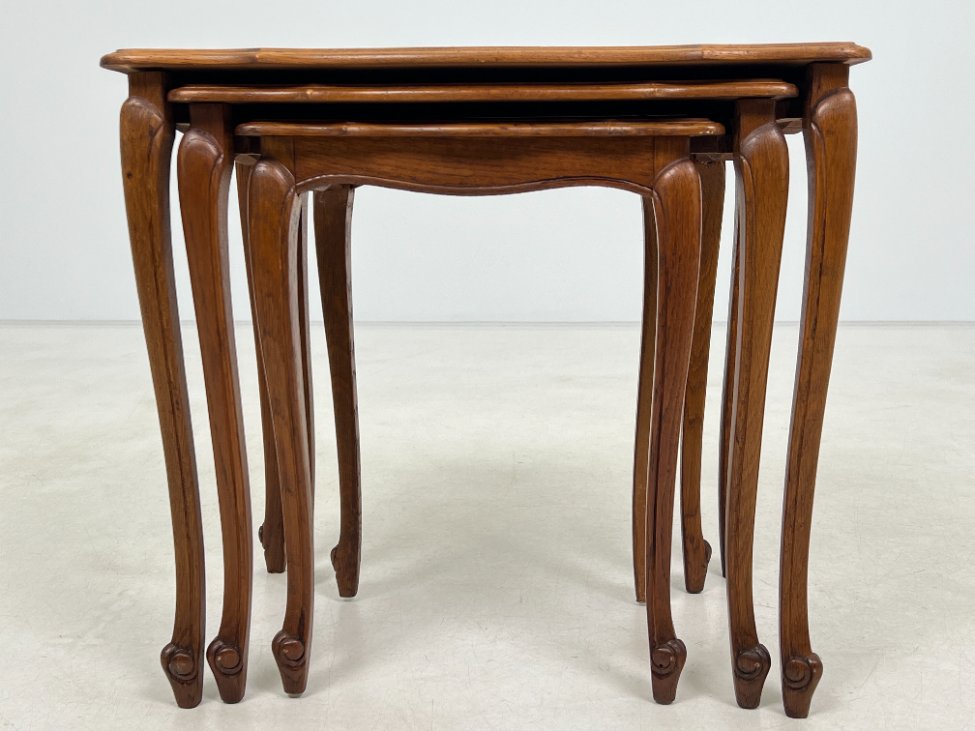 | Papildoma informacija | Matomos naudojimo žymės, ant visų staliukų yra pabraižymų ir dėmių. Ant viduriniojo staliuko stalviršio yra medienos įtrūkimas. Ant mažiausiojo staliuko rėmo yra medienos įtrūkimas. |