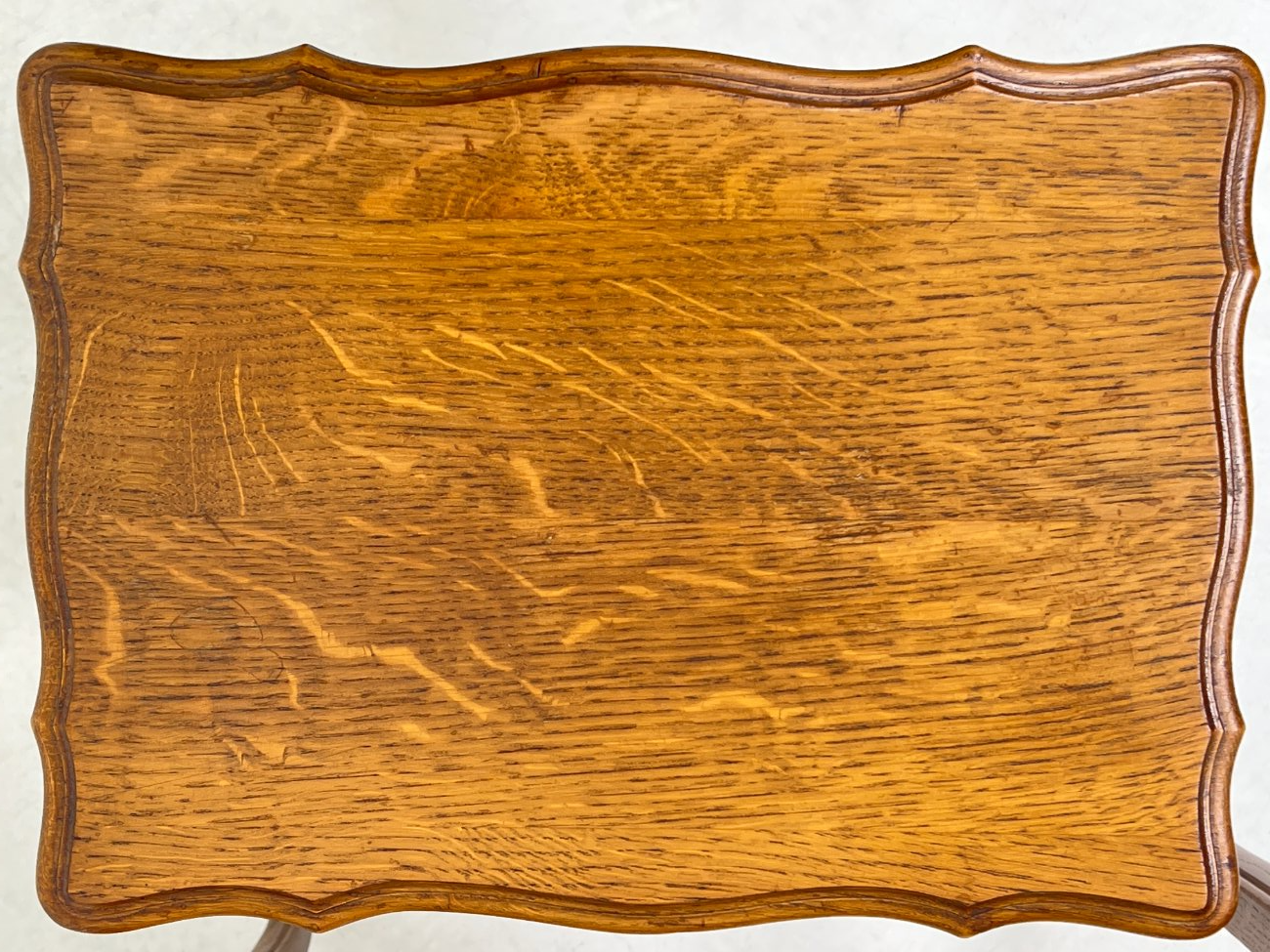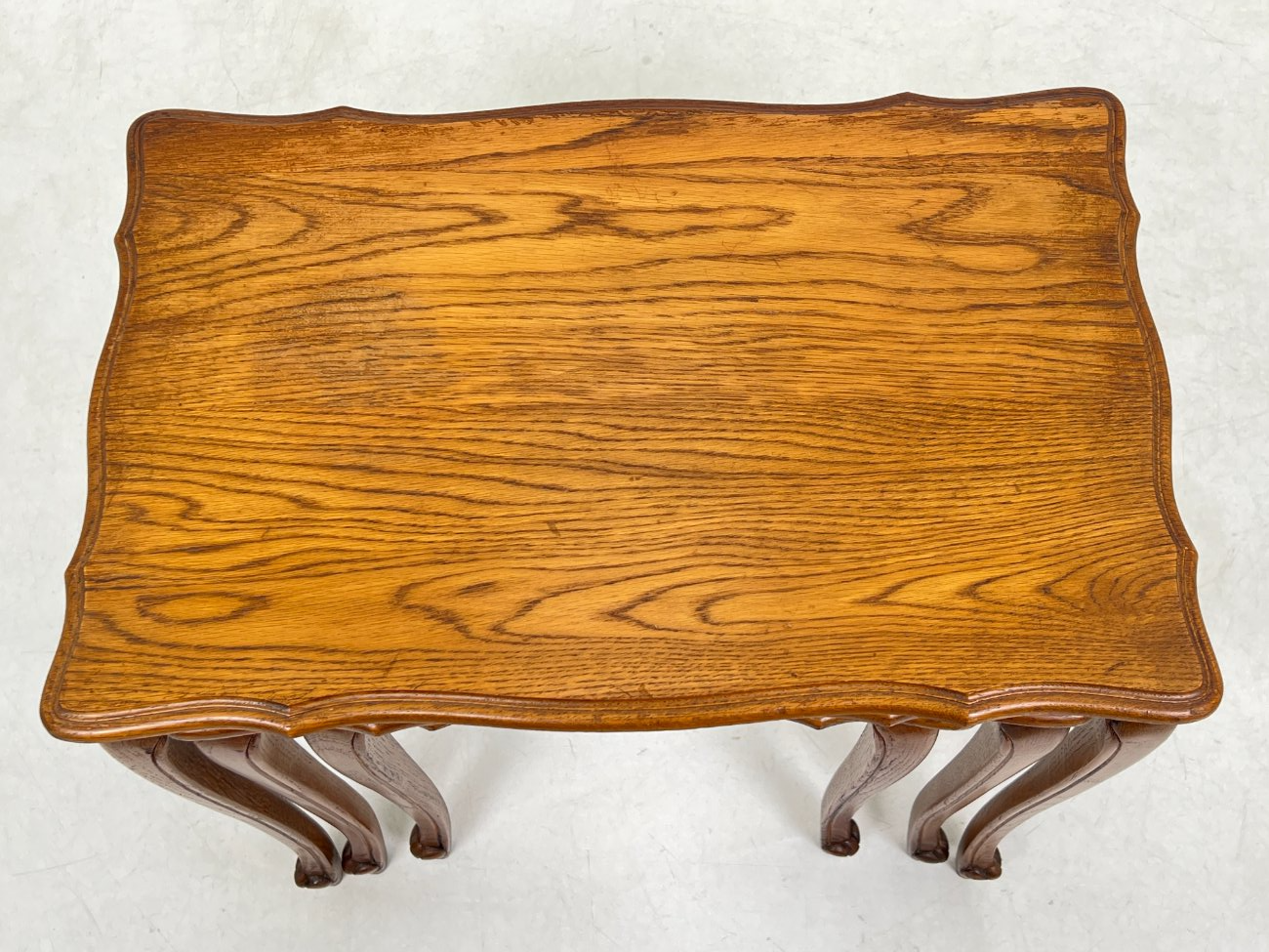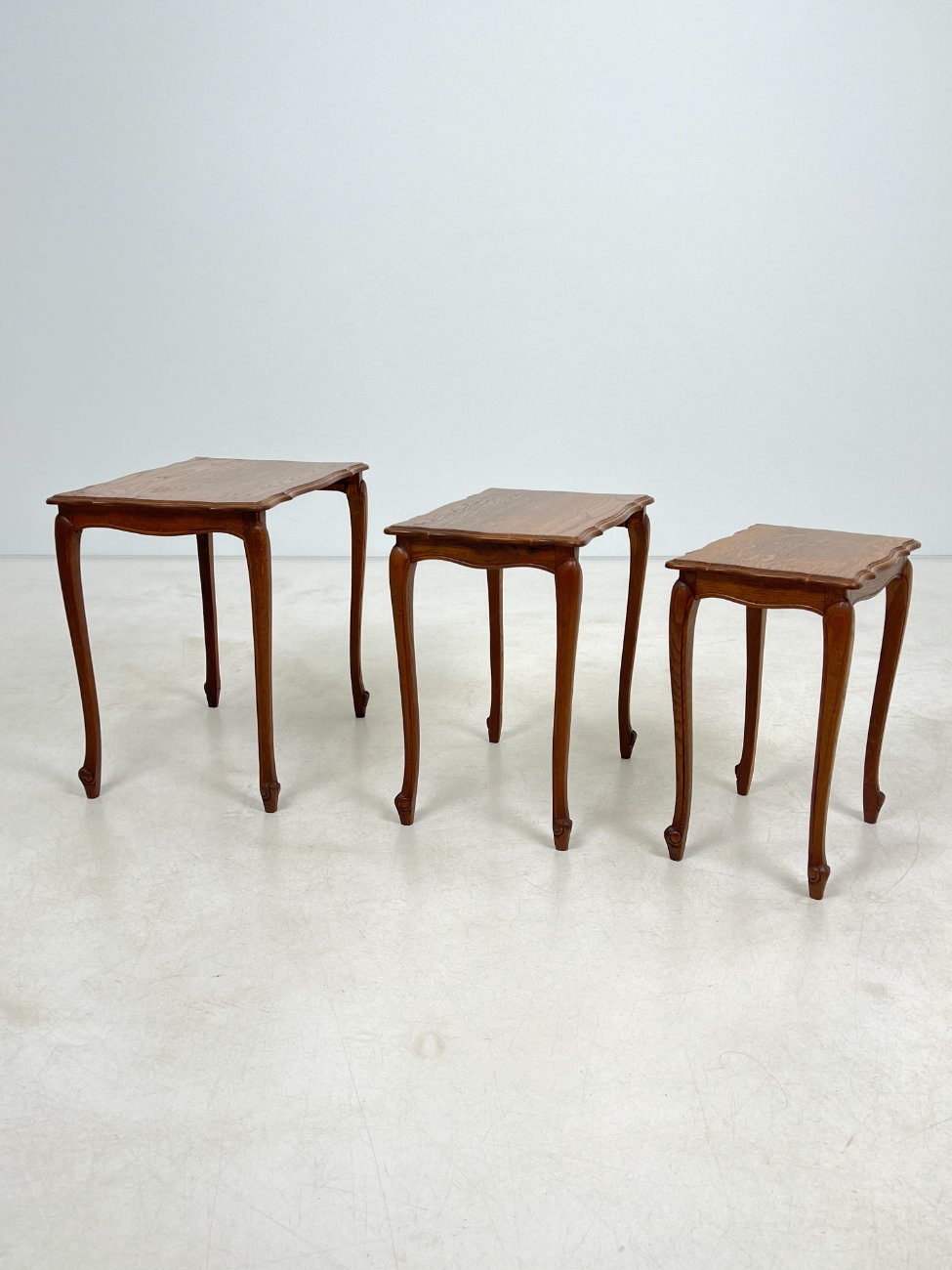 | Papildoma informacija | Matomos naudojimo žymės, ant visų staliukų yra pabraižymų ir dėmių. Ant viduriniojo staliuko stalviršio yra medienos įtrūkimas. Ant mažiausiojo staliuko rėmo yra medienos įtrūkimas. |