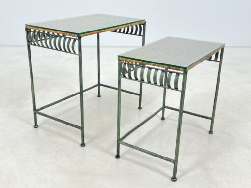 Metaliniai lizdiniai staliukai pintais šiaudiniai stalviršiais su uždedamu stiklu 2 vnt. komplektas.