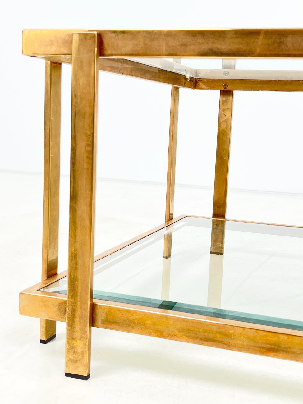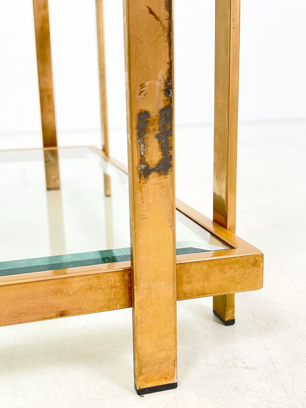 Metalinio rėmo staliukas stikliniais stalviršiumi ir lentyna.