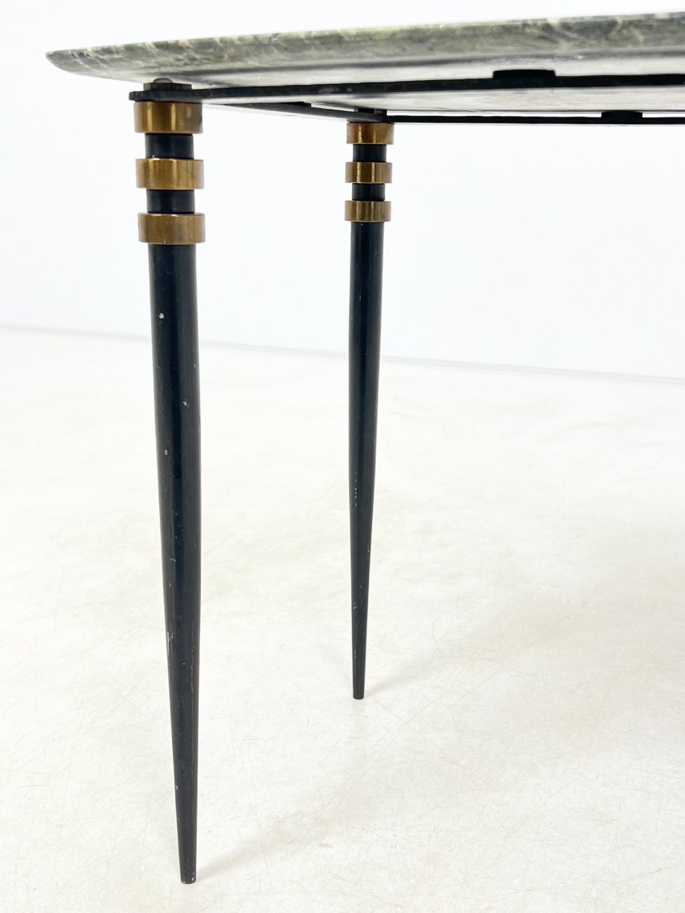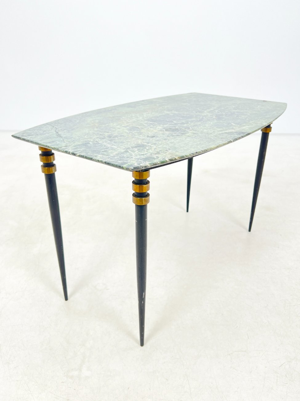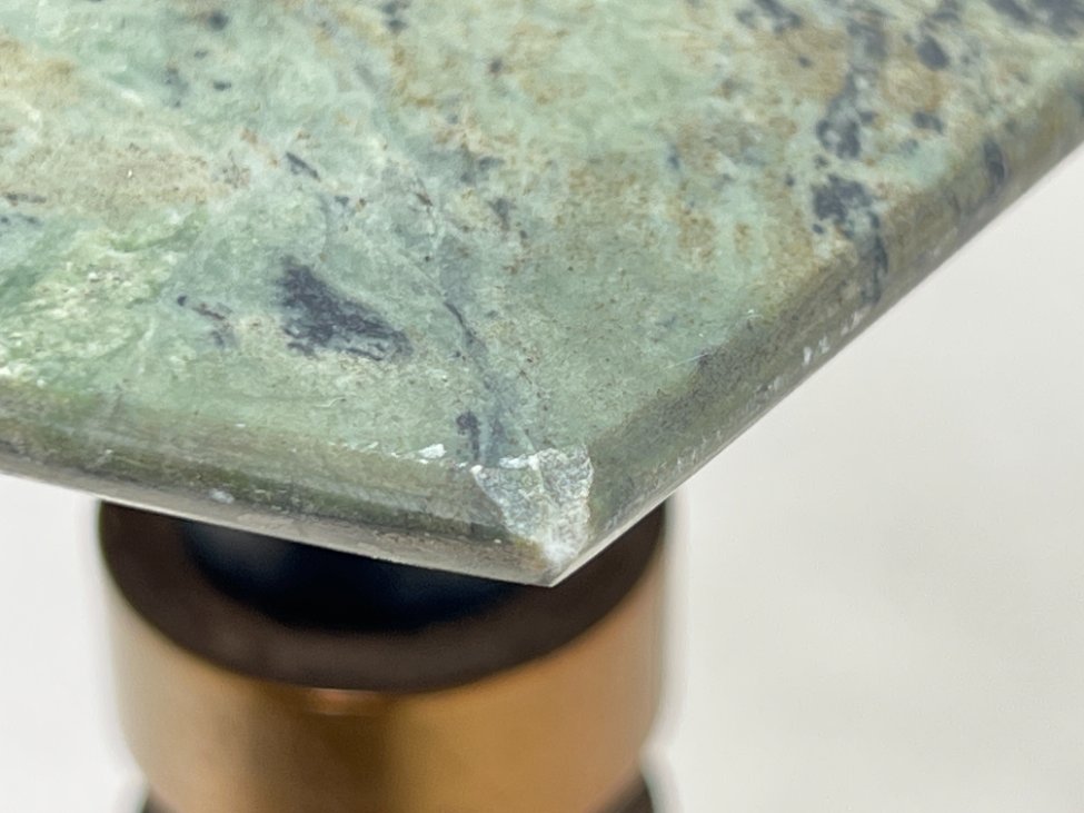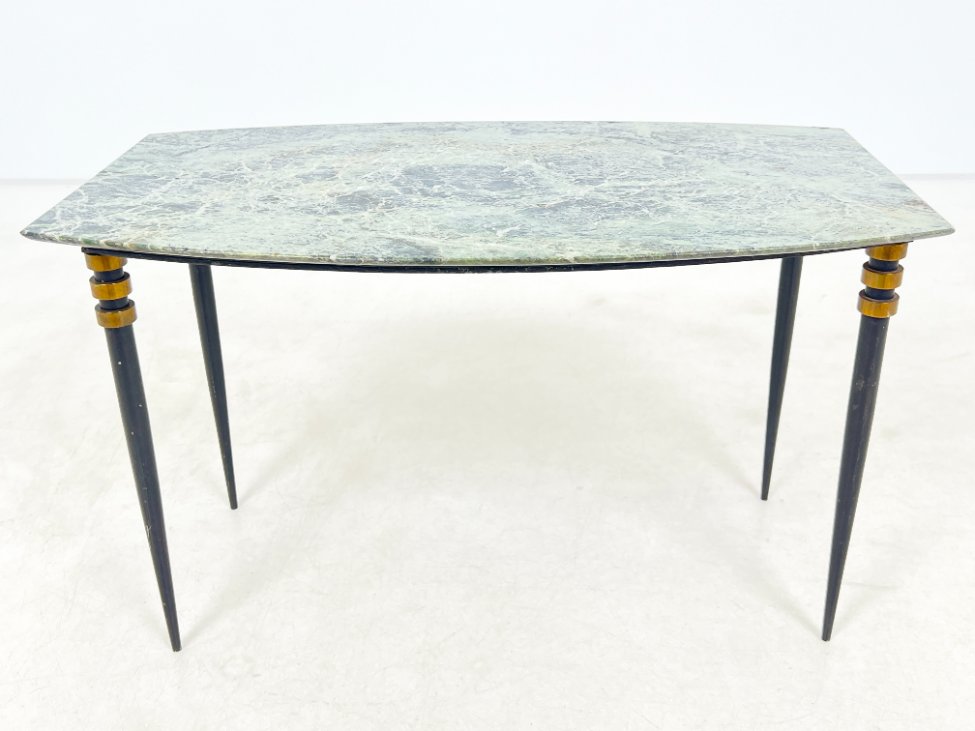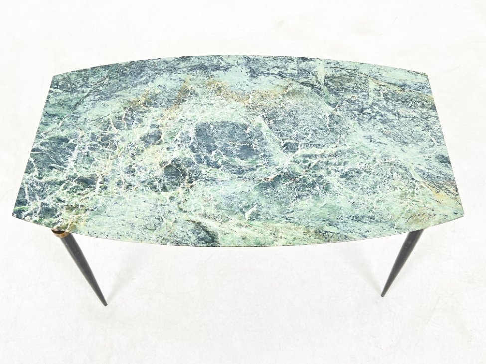 Metalinio rėmo staliukas su žalio marmuro stalviršiumi.