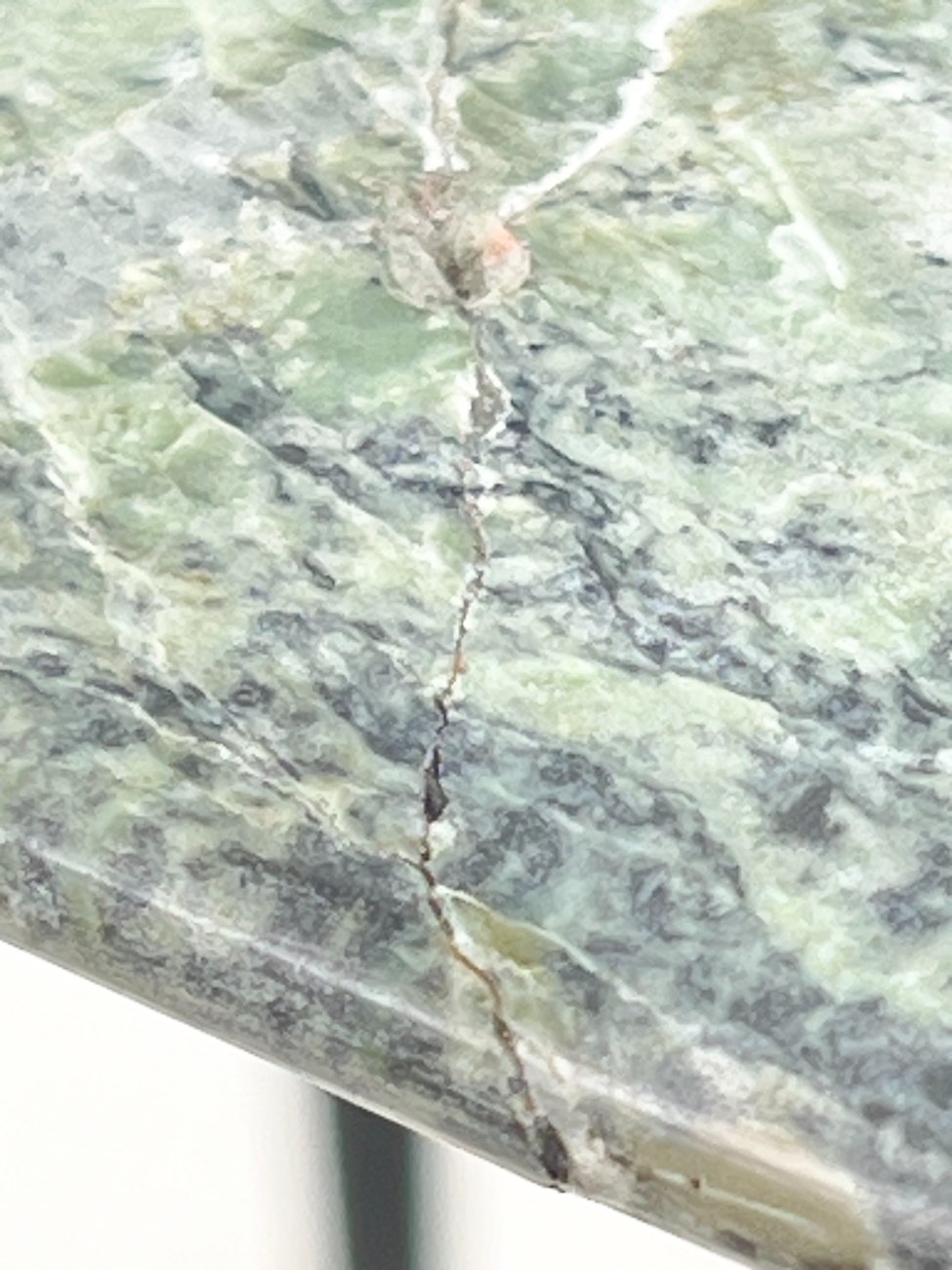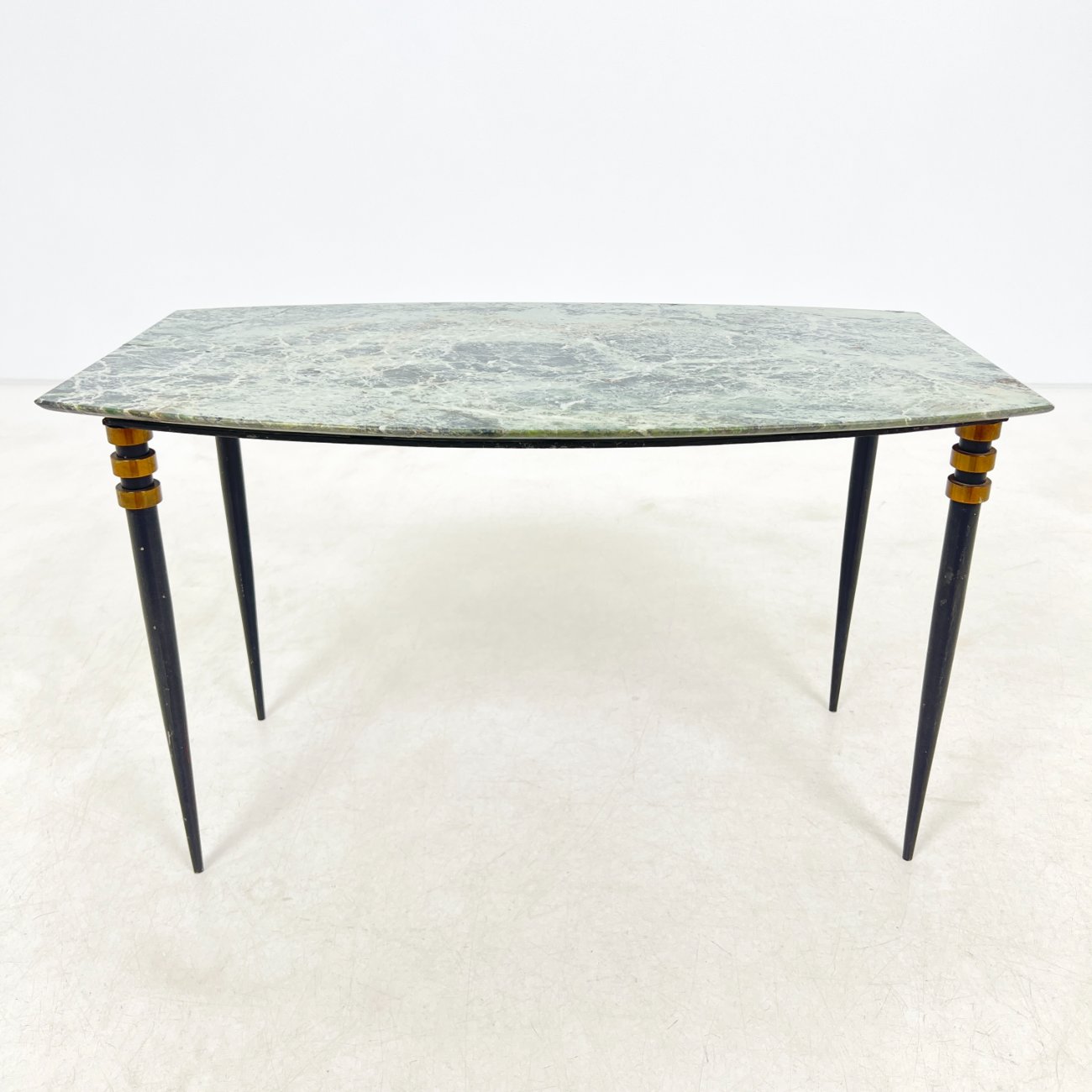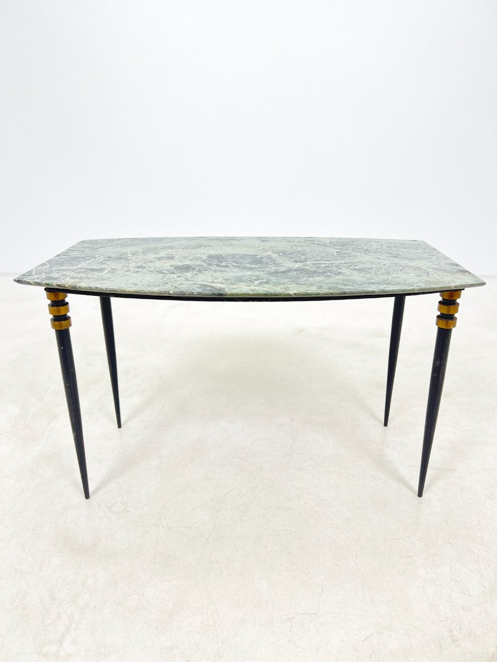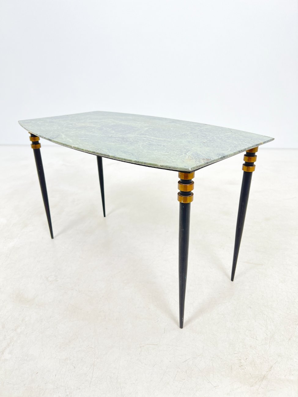 Metalinio rėmo staliukas su žalio marmuro stalviršiumi.