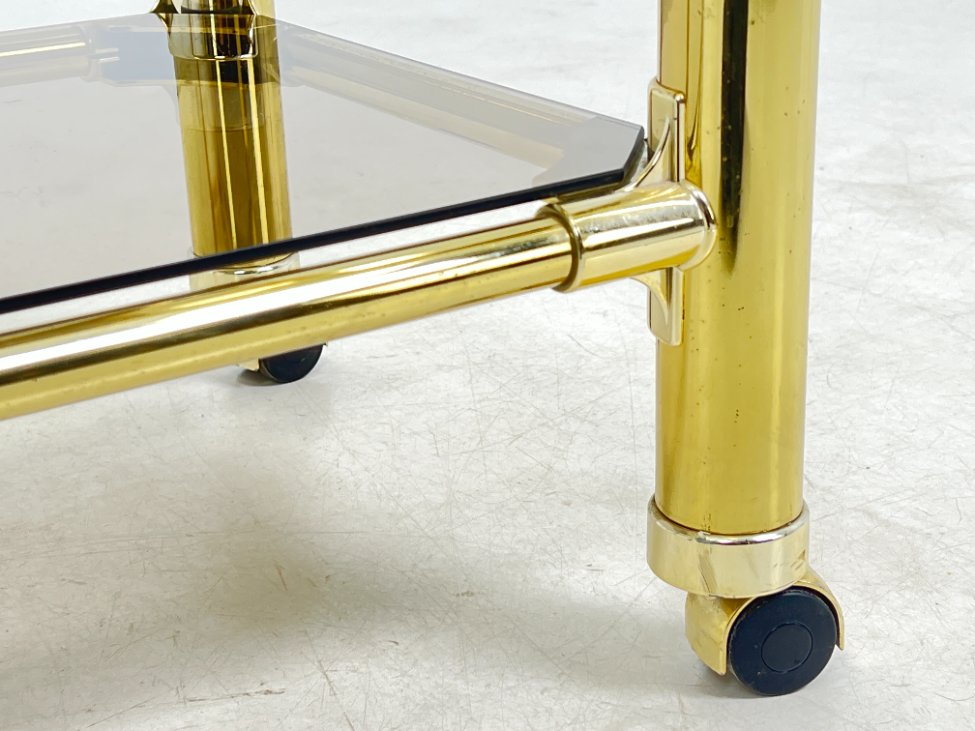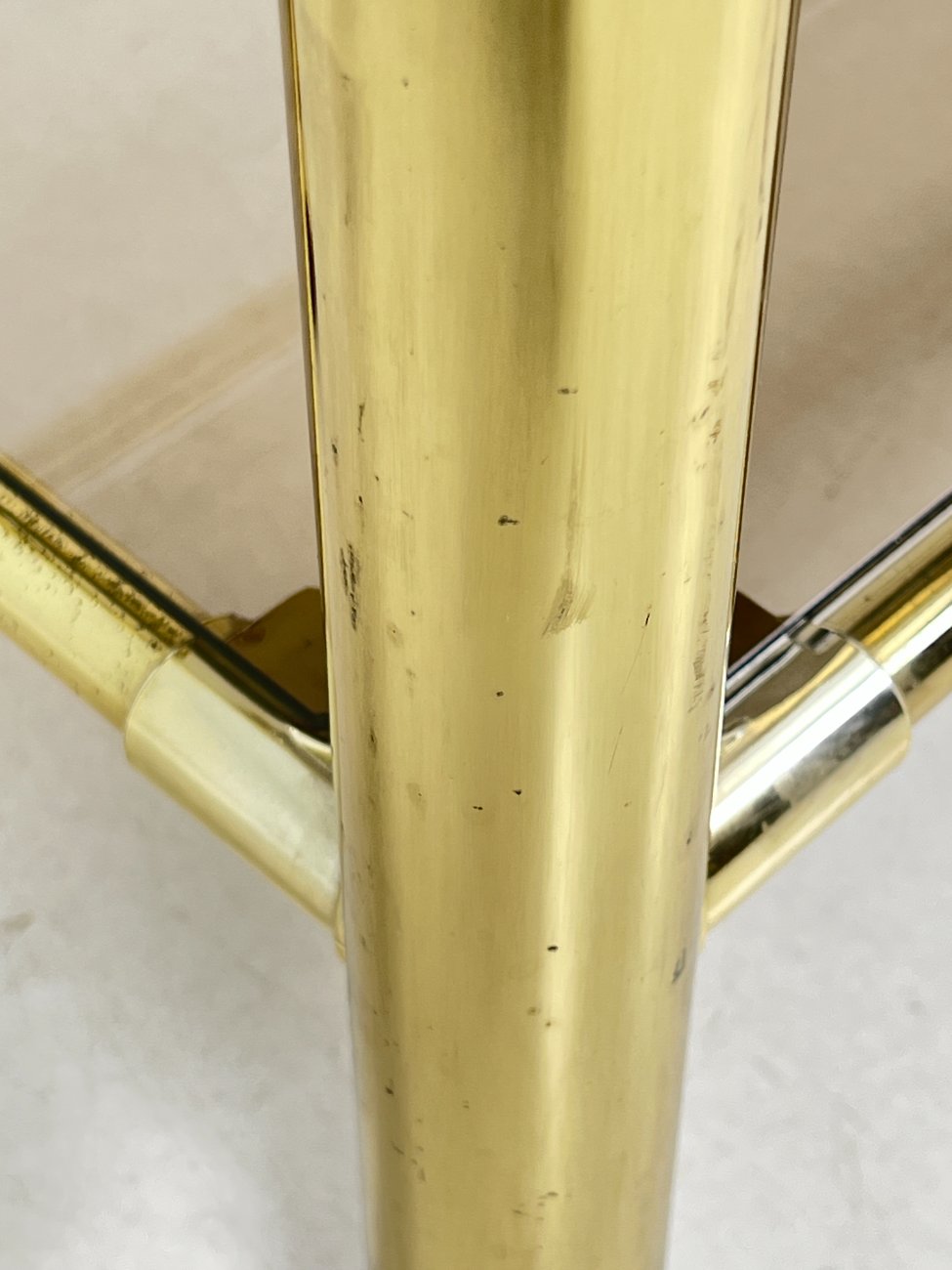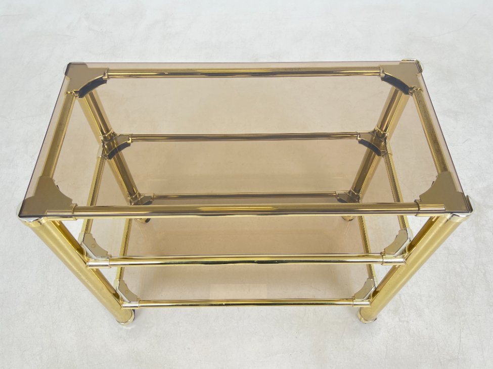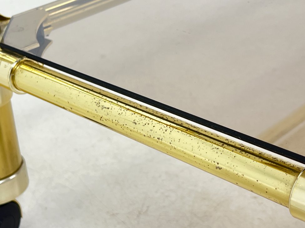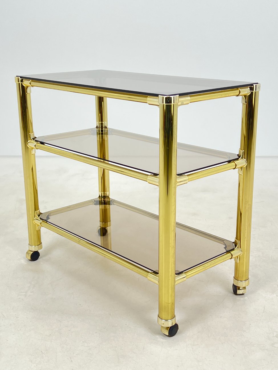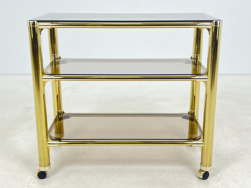 Auksinės spalvos metalinio rėmo trijų aukštų serviravimo staliukas su stiklinėmis lentynomis ir ratukais.