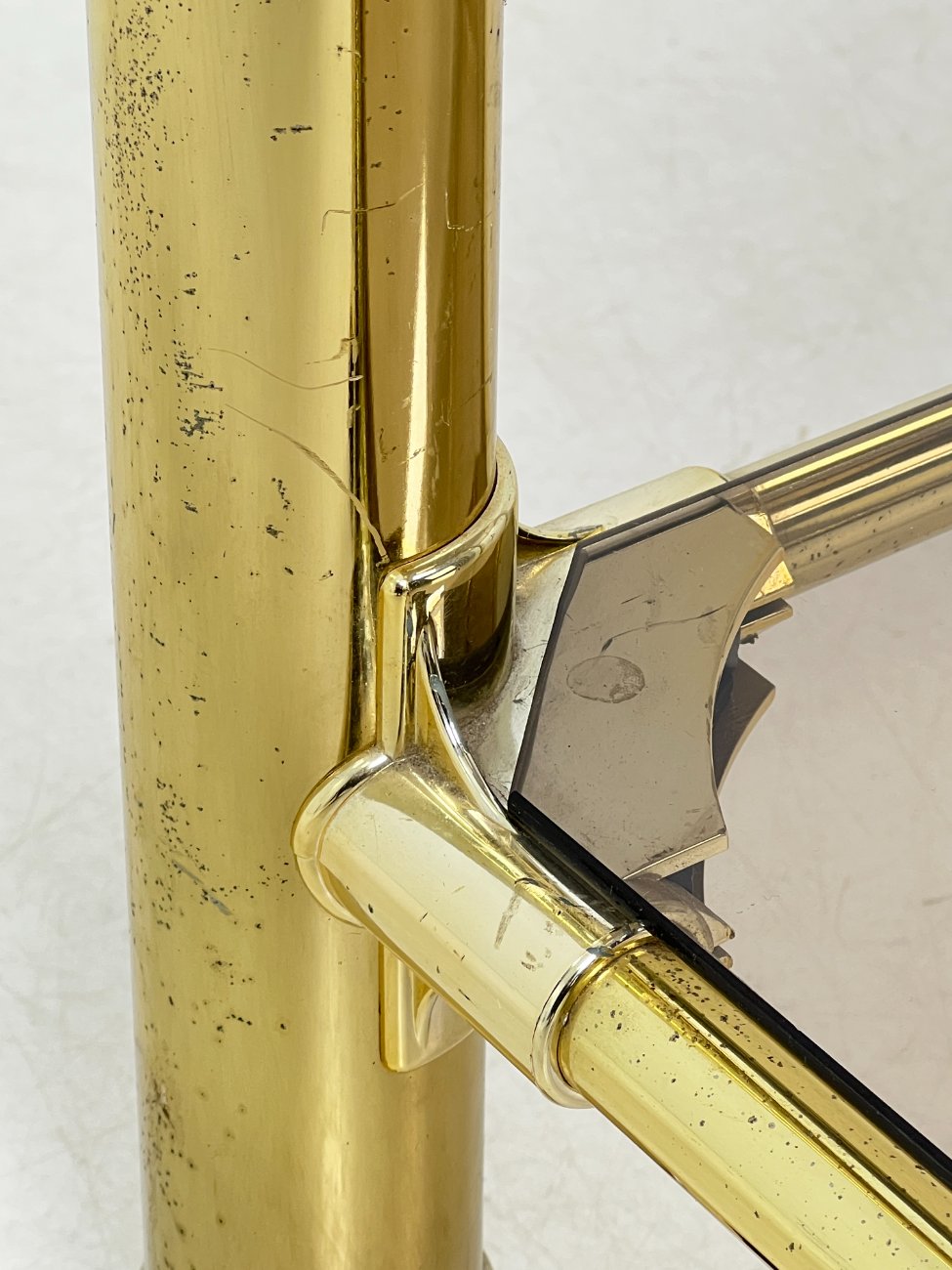 | Papildoma informacija | Vietomis apdaužytos dviejų stiklinių lentynų kraštinės. Ant metalinio rėmo yra pabraižymų, matoma metalo oksidacija. |