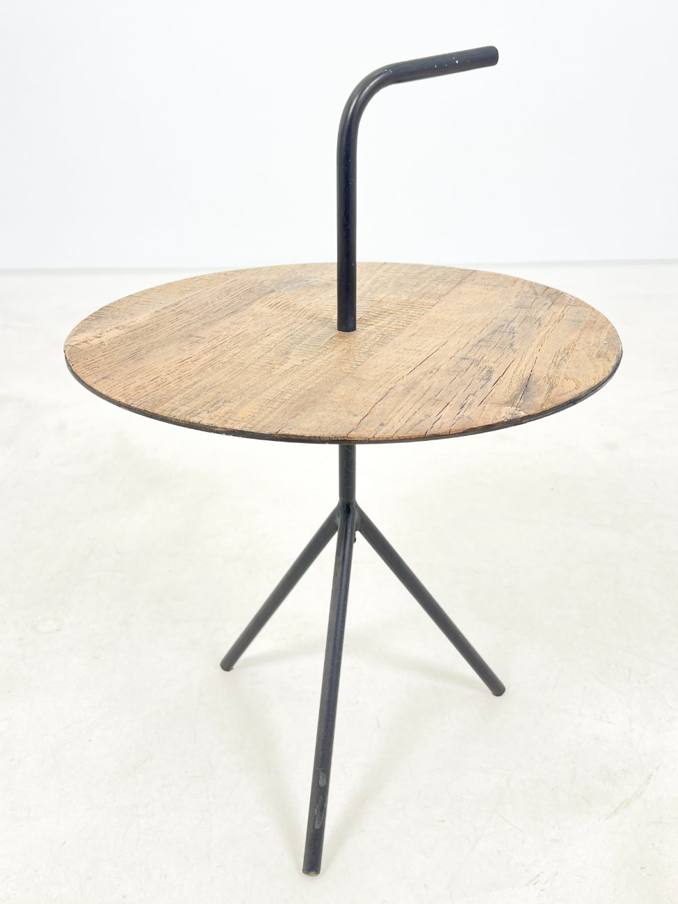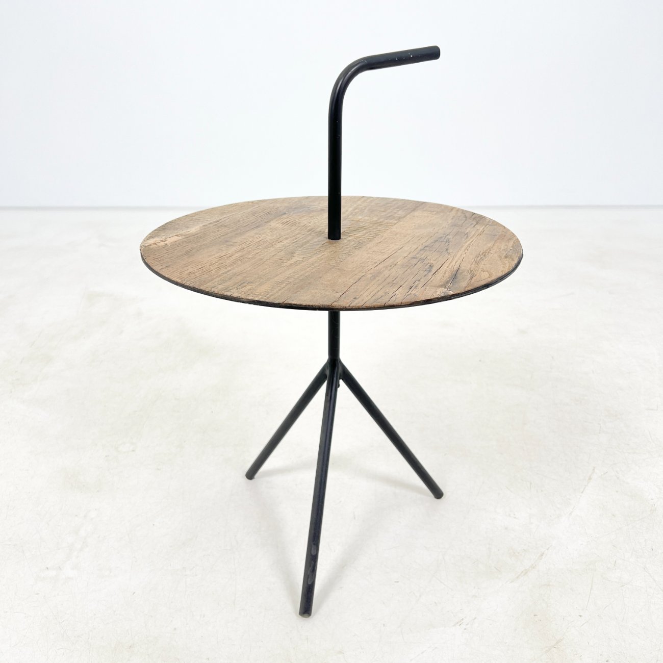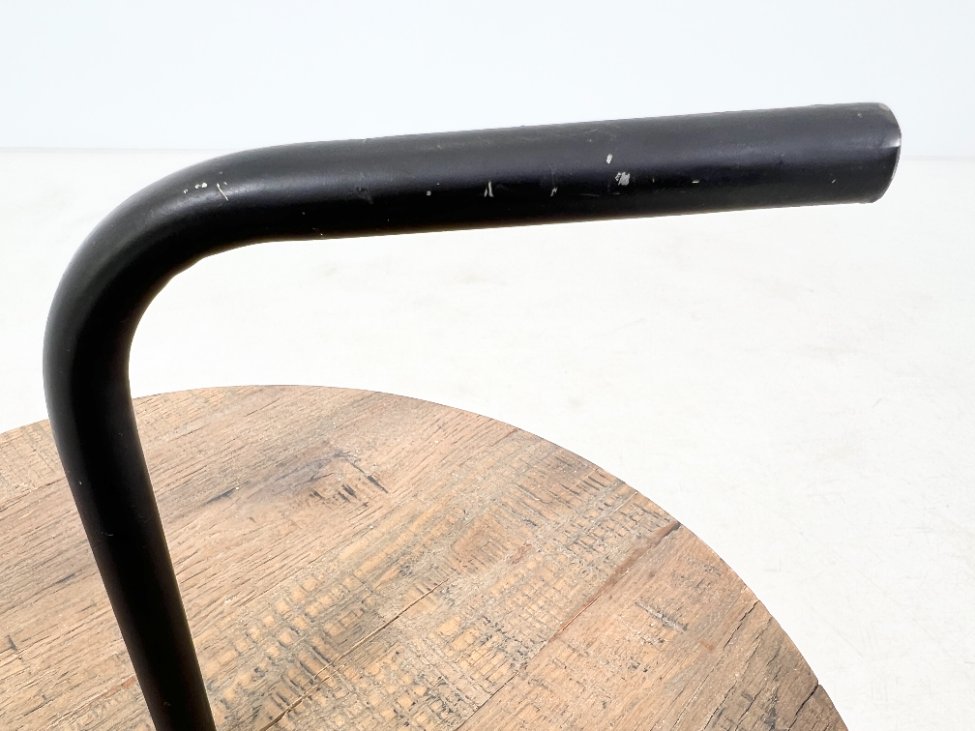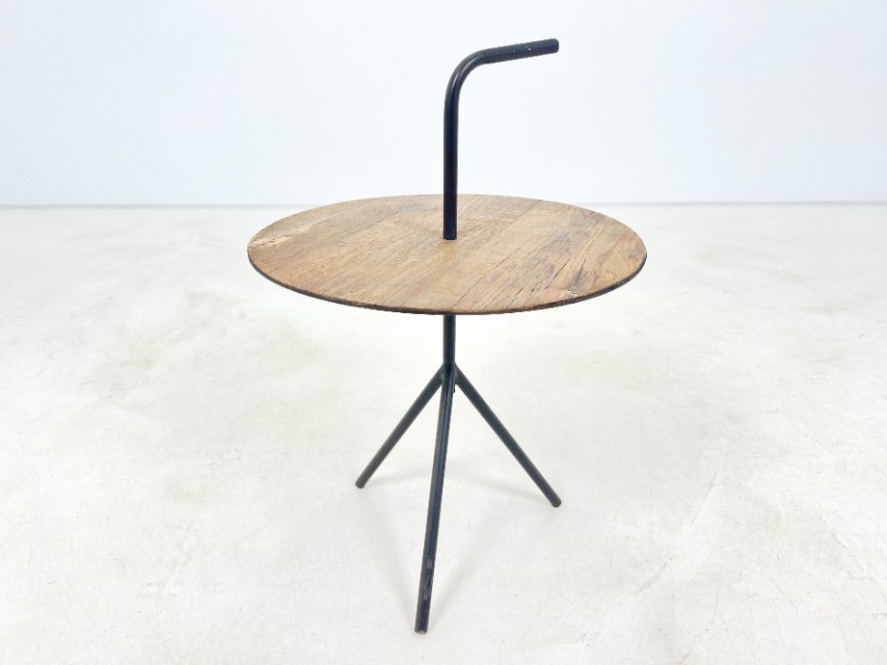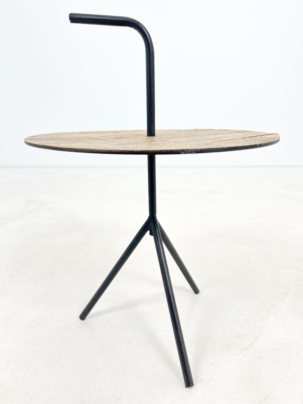 Modernus metalinis staliukas su medžio lukšto stalviršiumi.