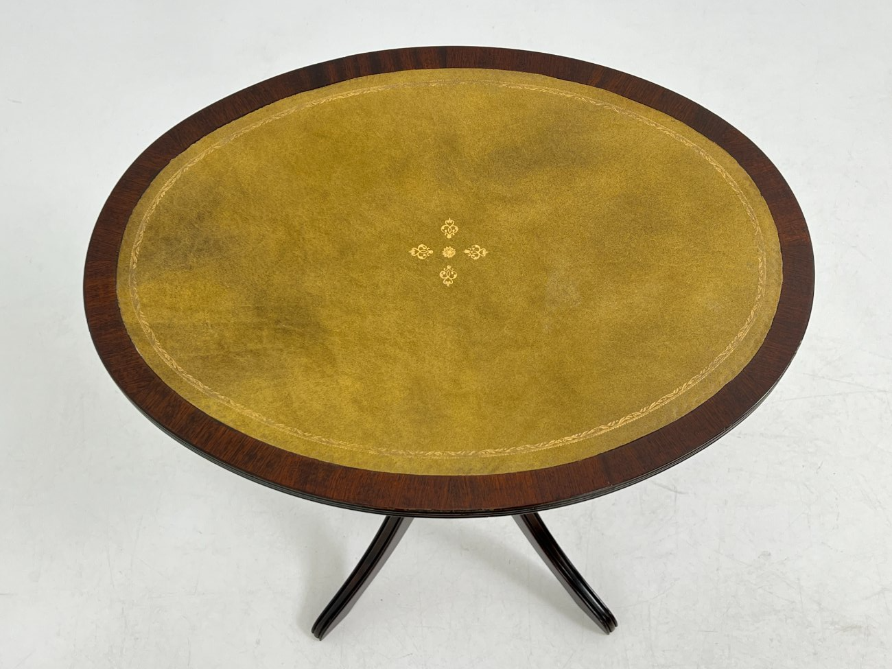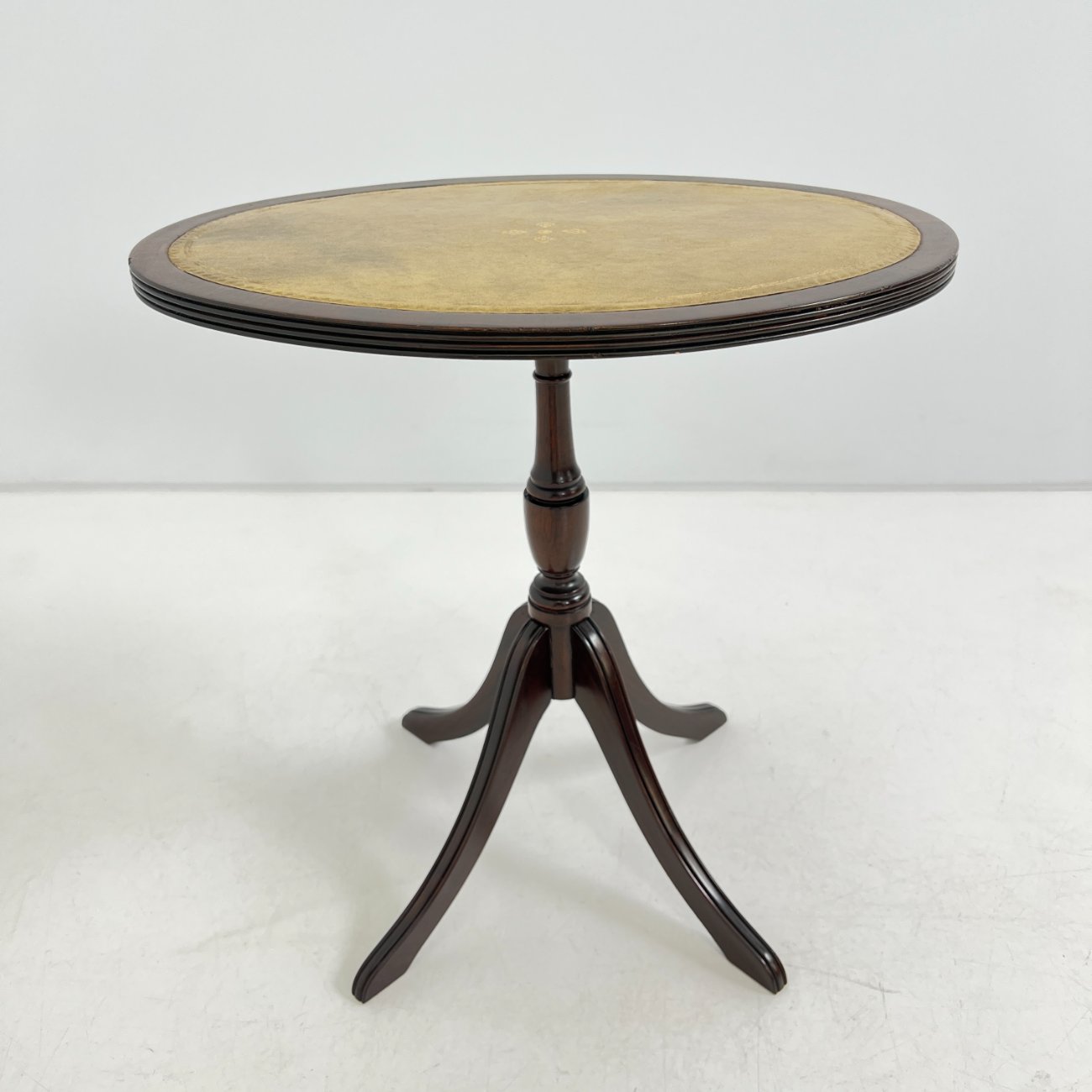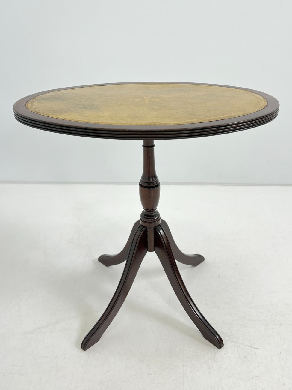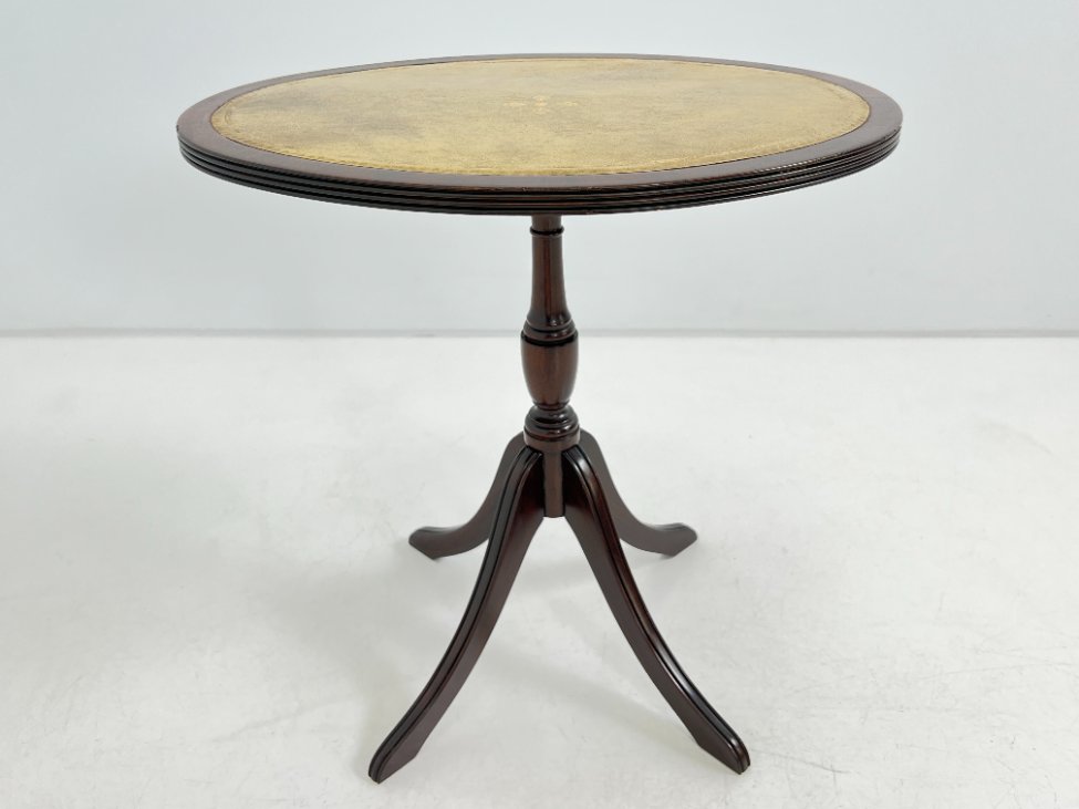Ovalus raudonmedžio staliukas odiniu stalviršiumi.
