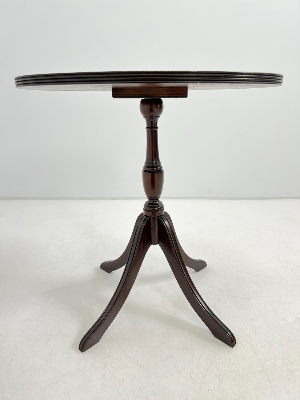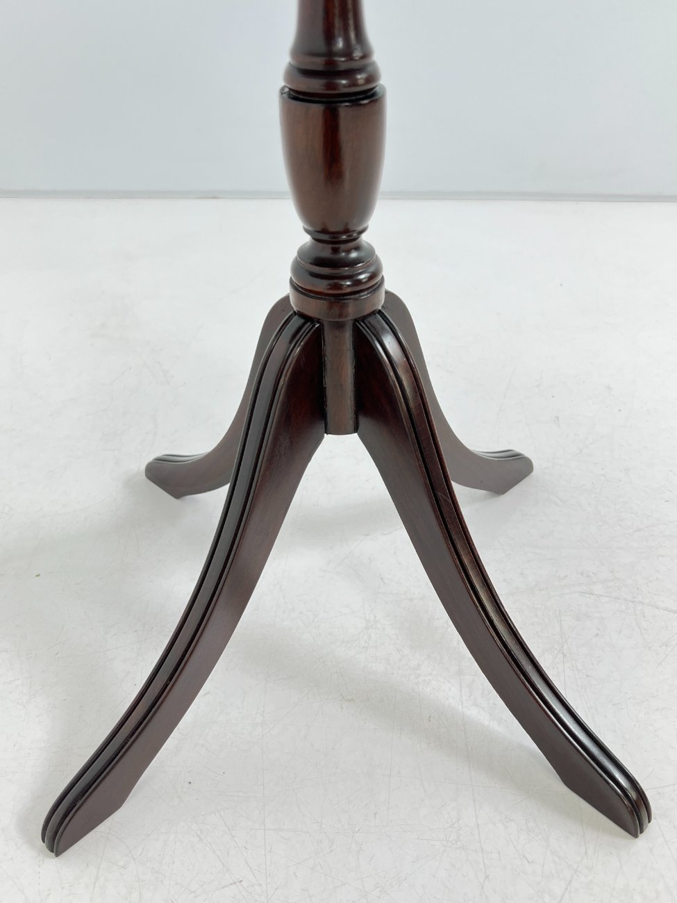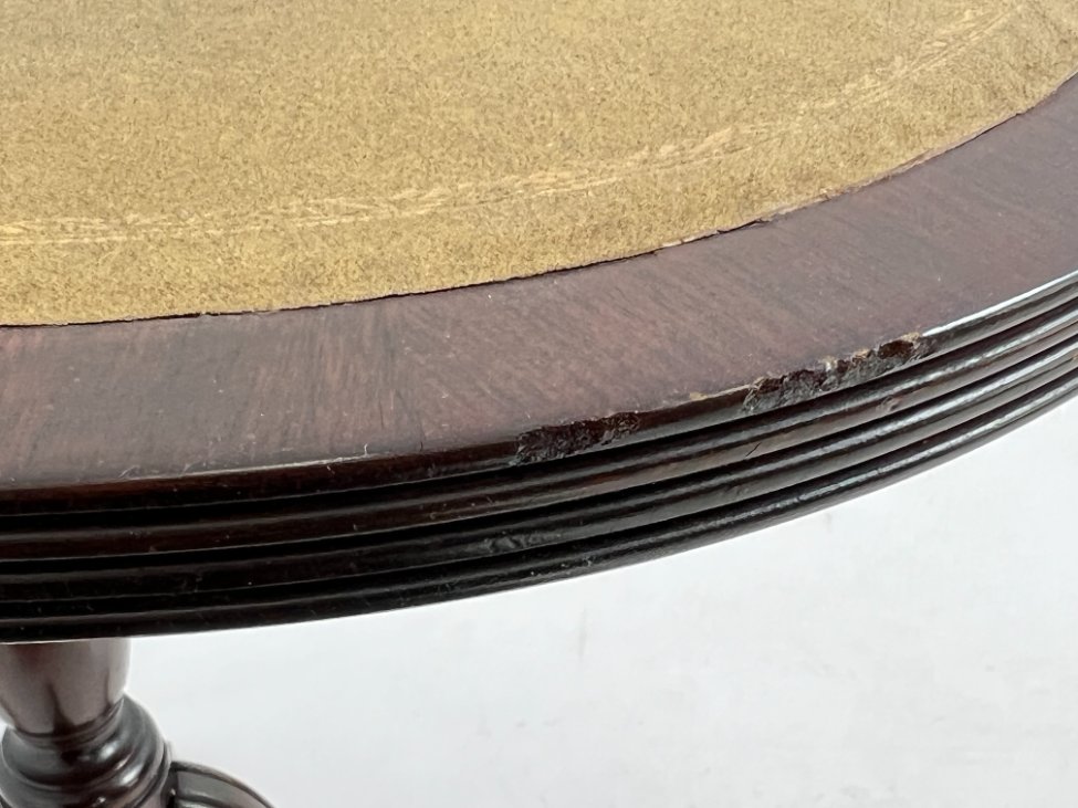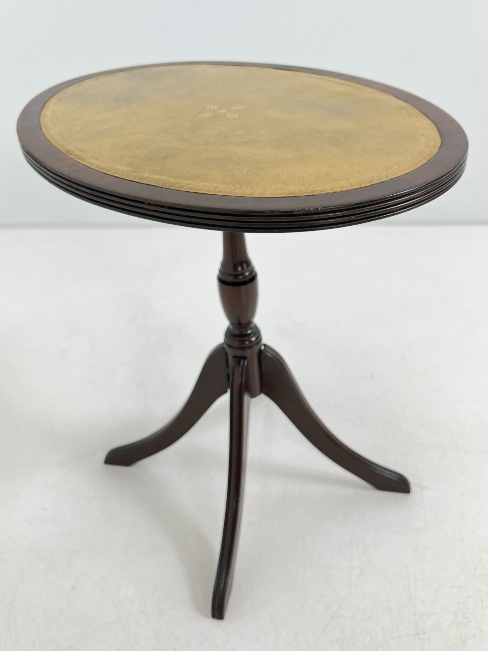 Ovalus raudonmedžio staliukas odiniu stalviršiumi.