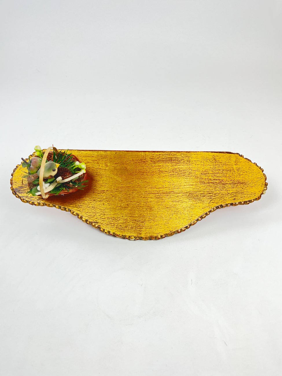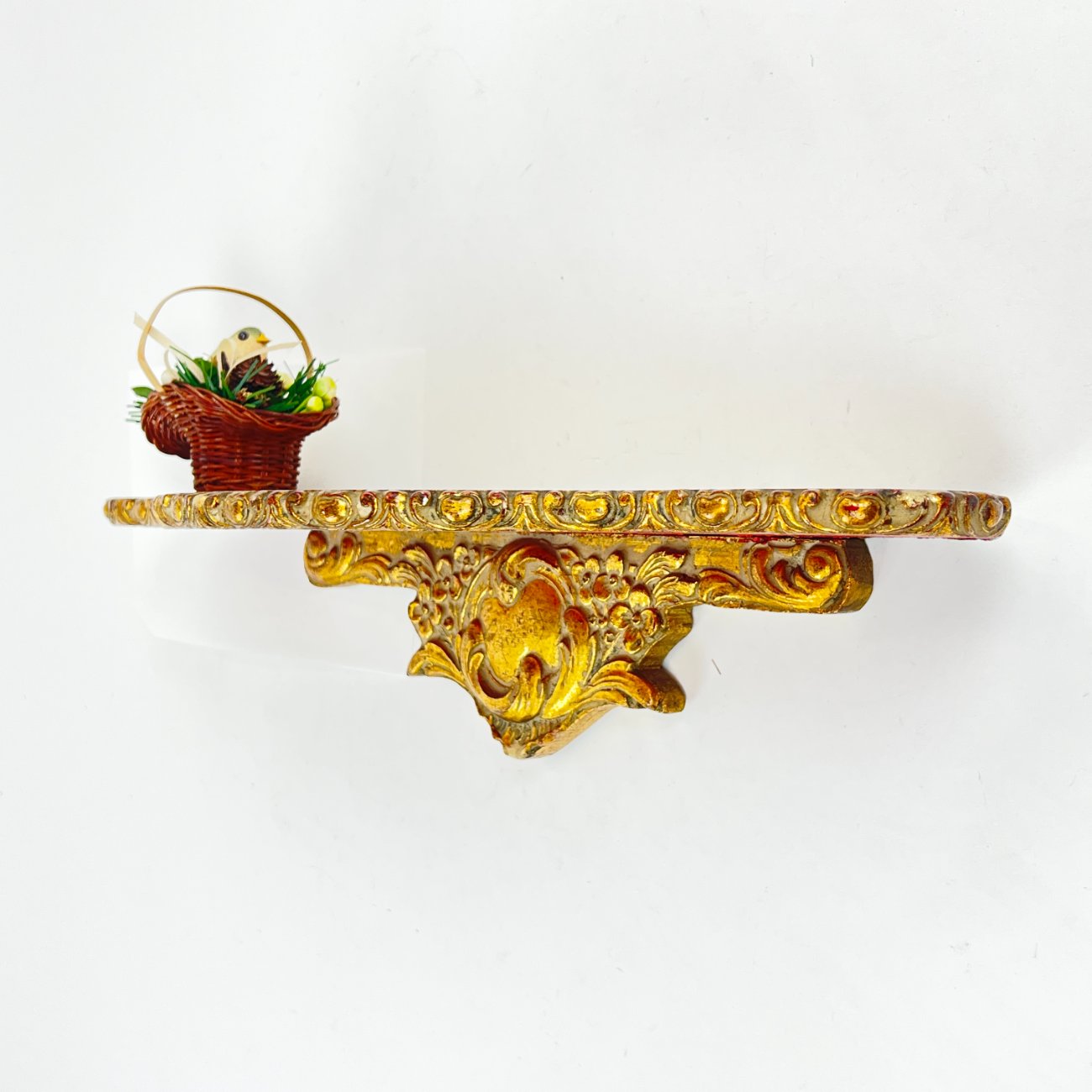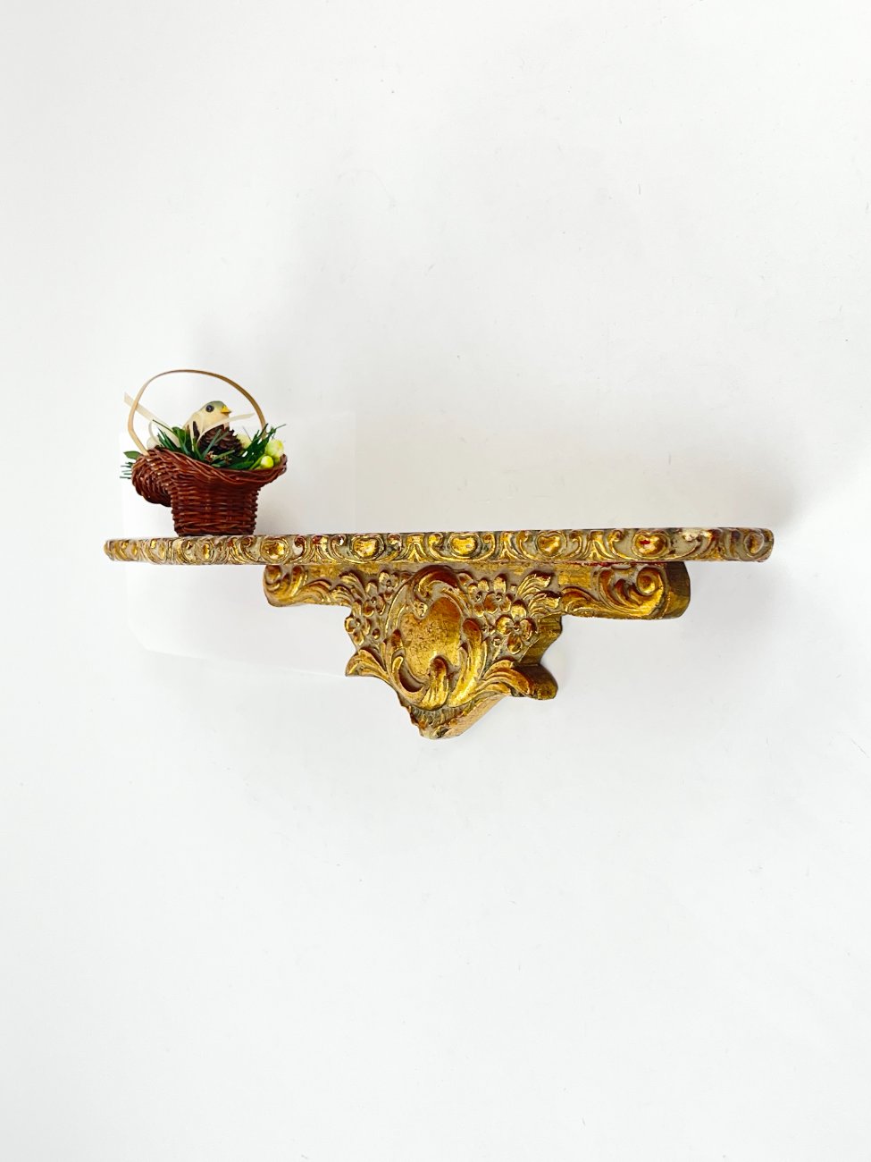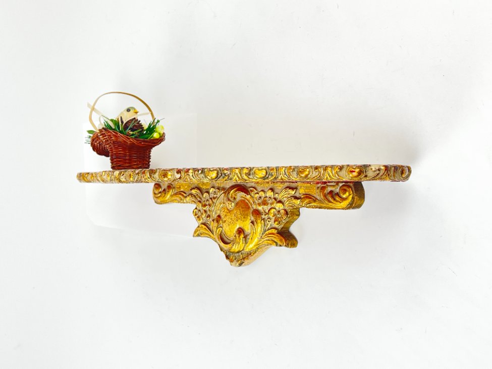 Pakabinama aukso spalvos konsolė su paukščio lizdo dekoracija.