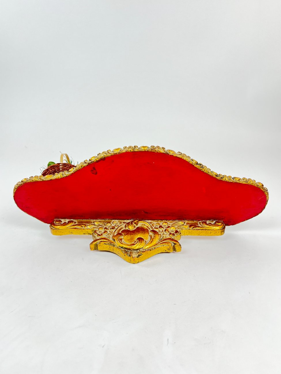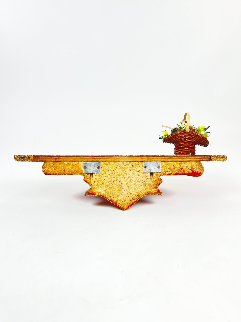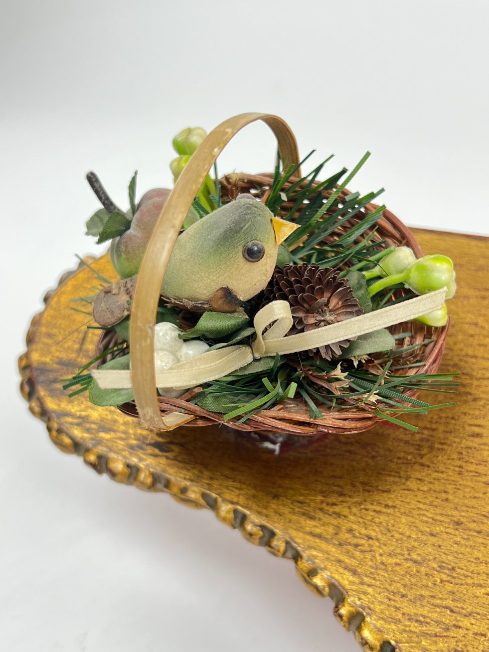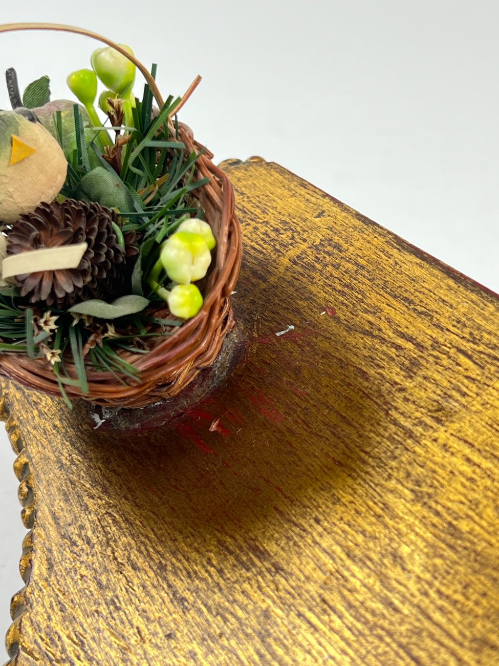 Pakabinama aukso spalvos konsolė su paukščio lizdo dekoracija.