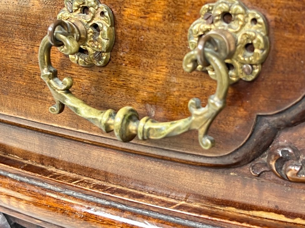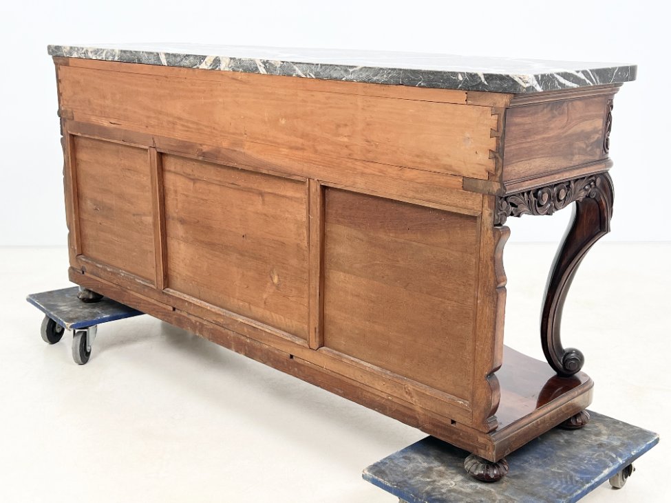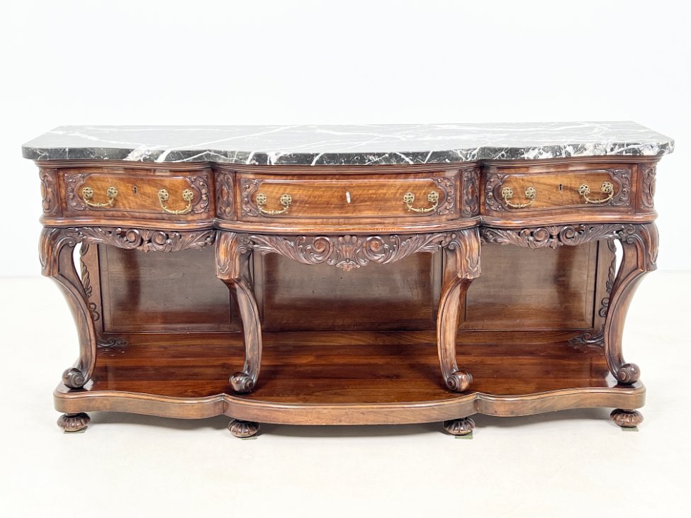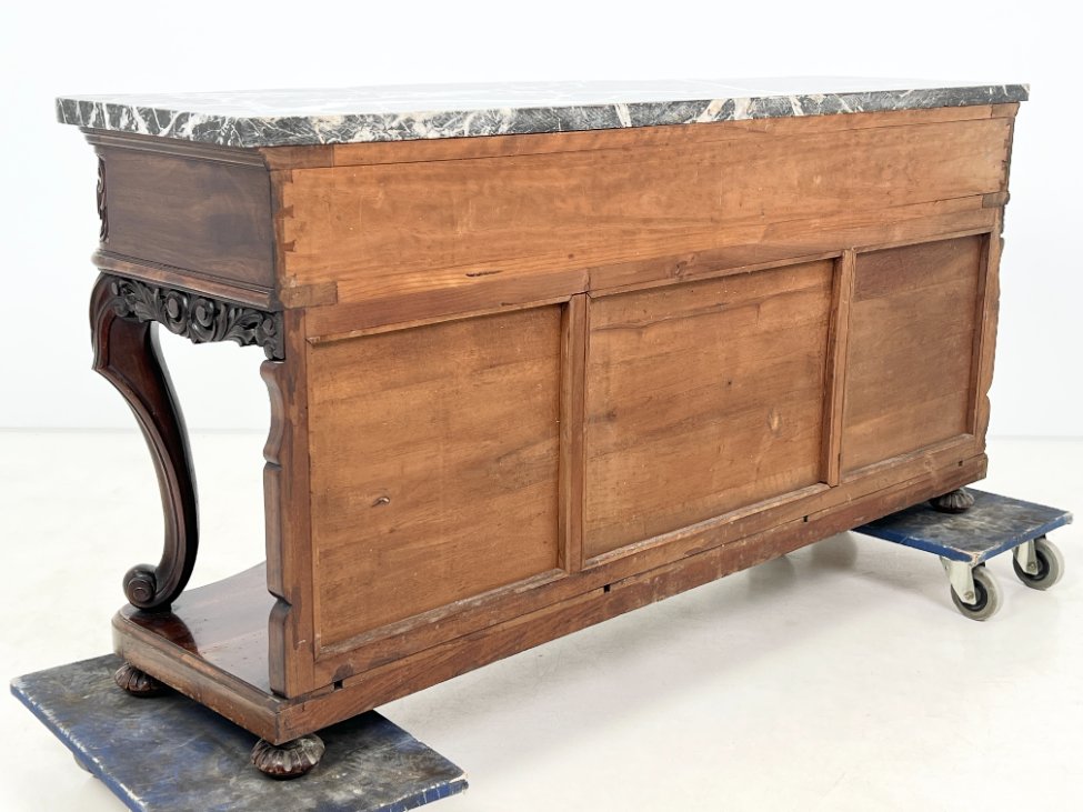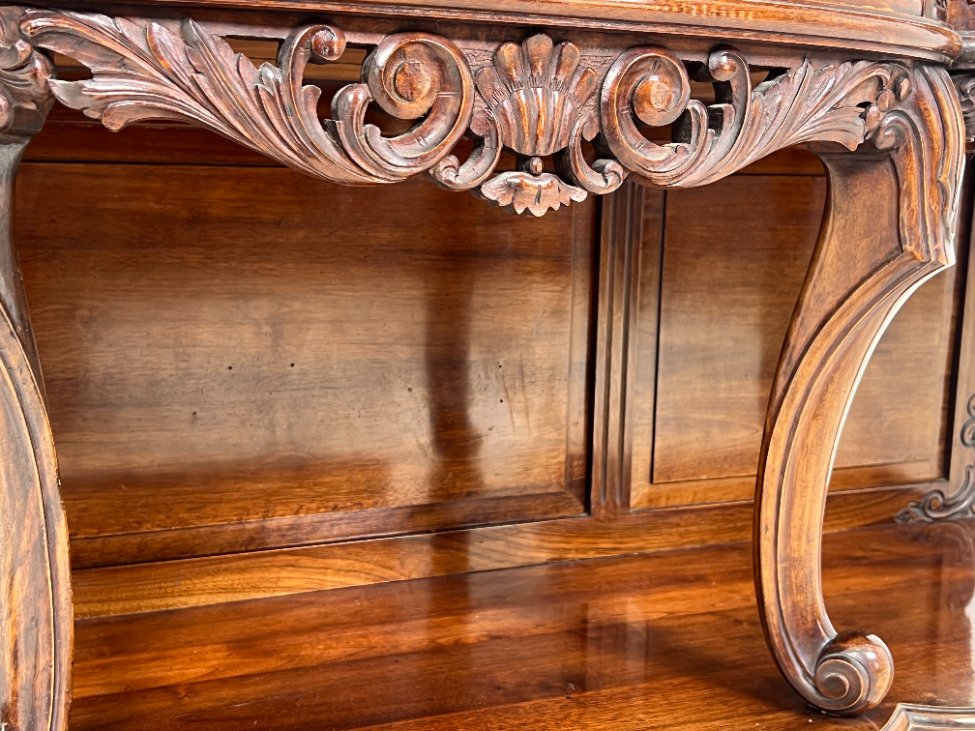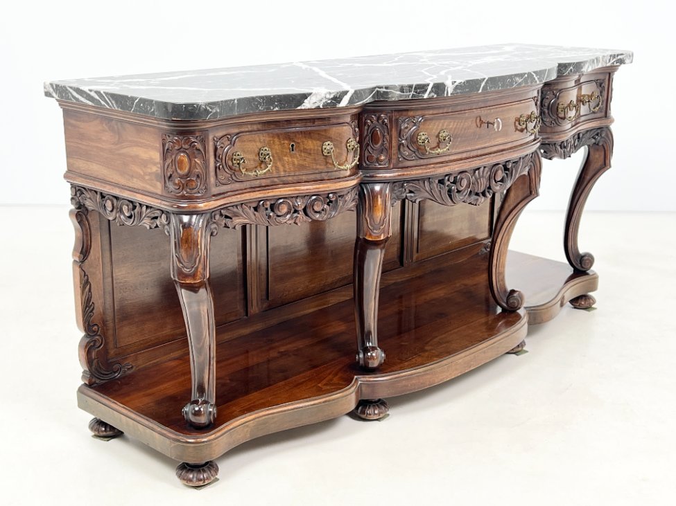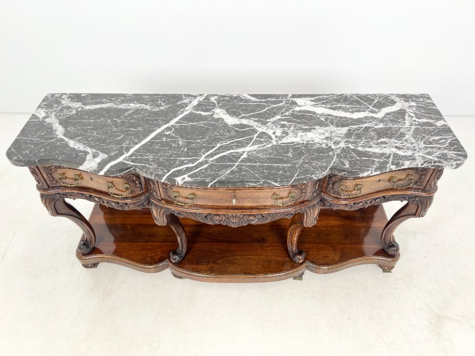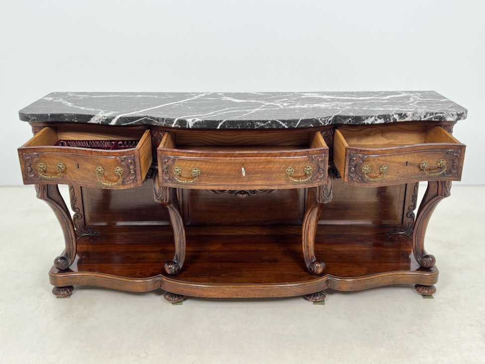Prabangi raudonmedžio konsolė marmuriniu stalviršiumi.