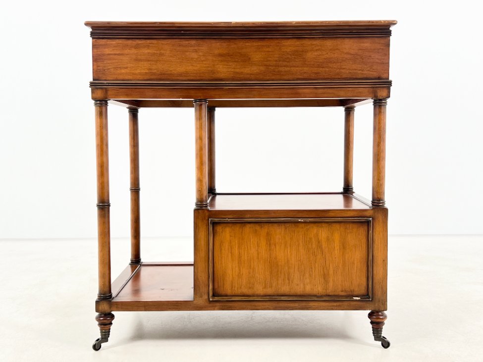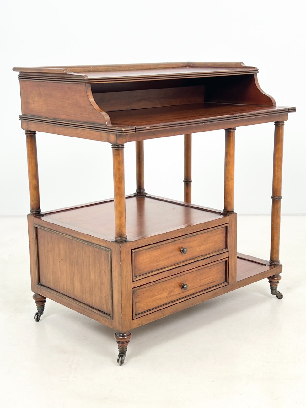 Riešutmedžio rašomasis stalas su ištraukiamu stalviršiumi, dviejais stalčiais ir ratukais.