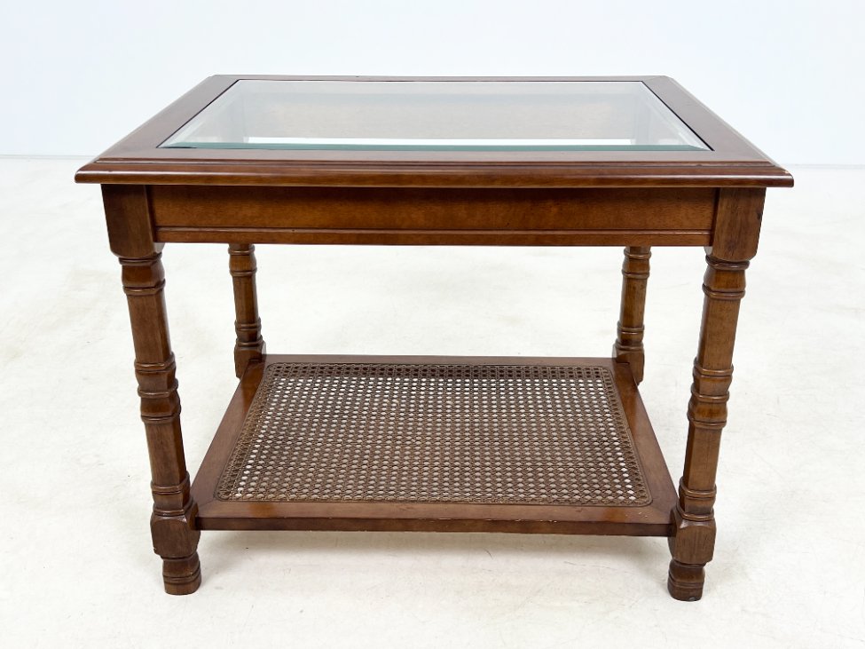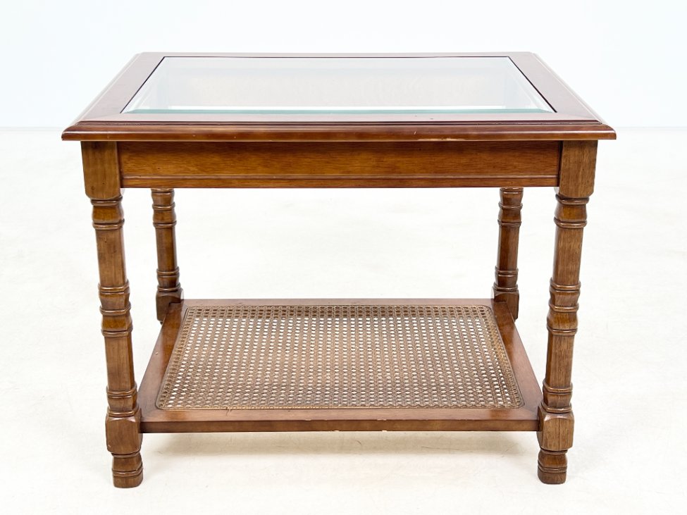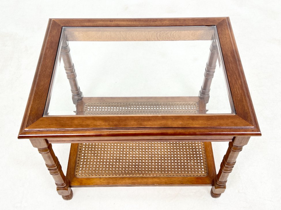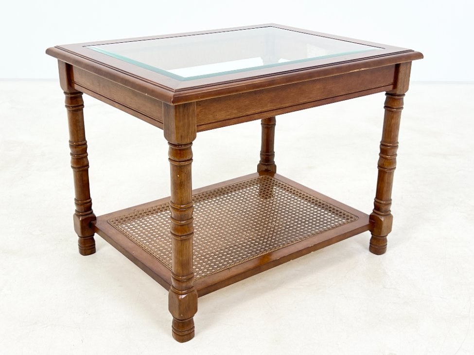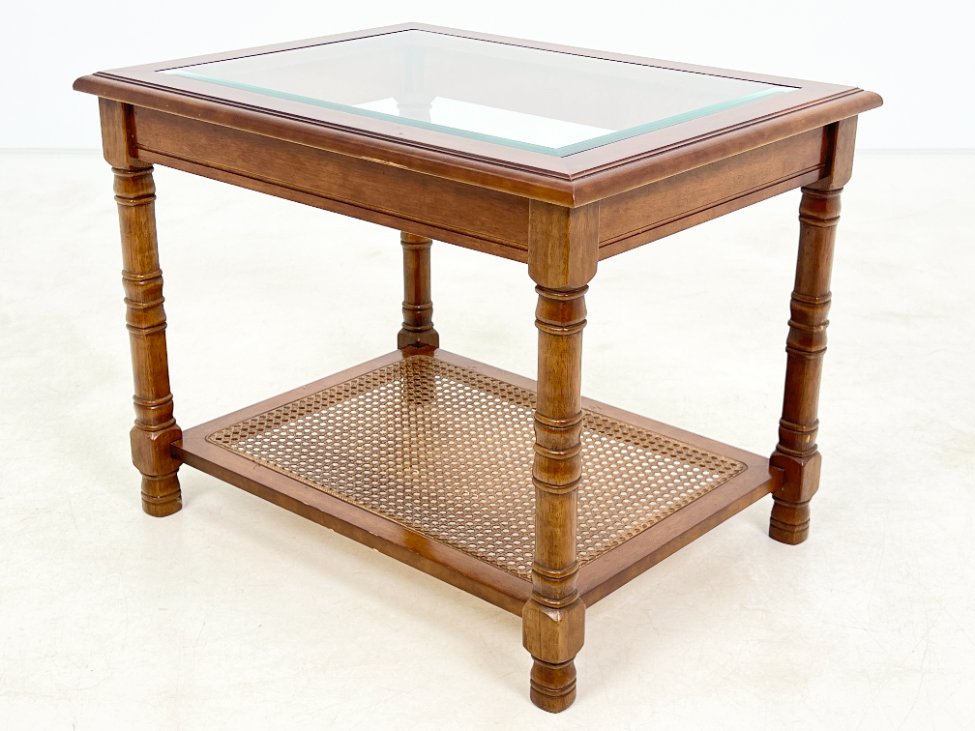 Riešutmedžio staliukas stikliniu stalviršiumi ir ratano lentynėle.