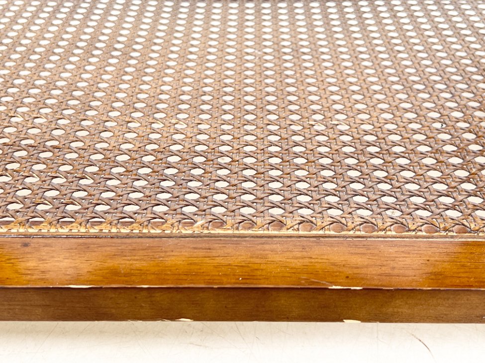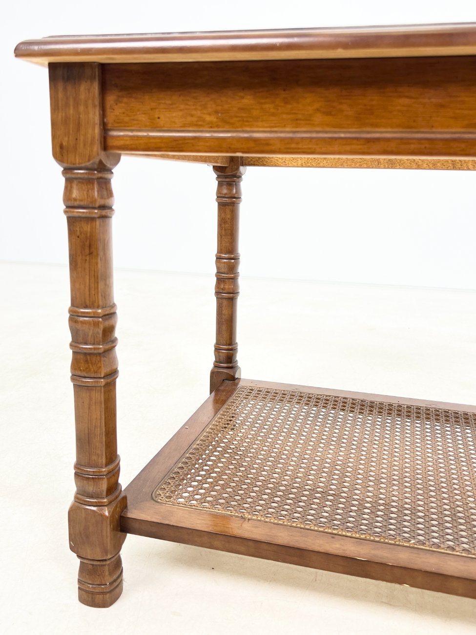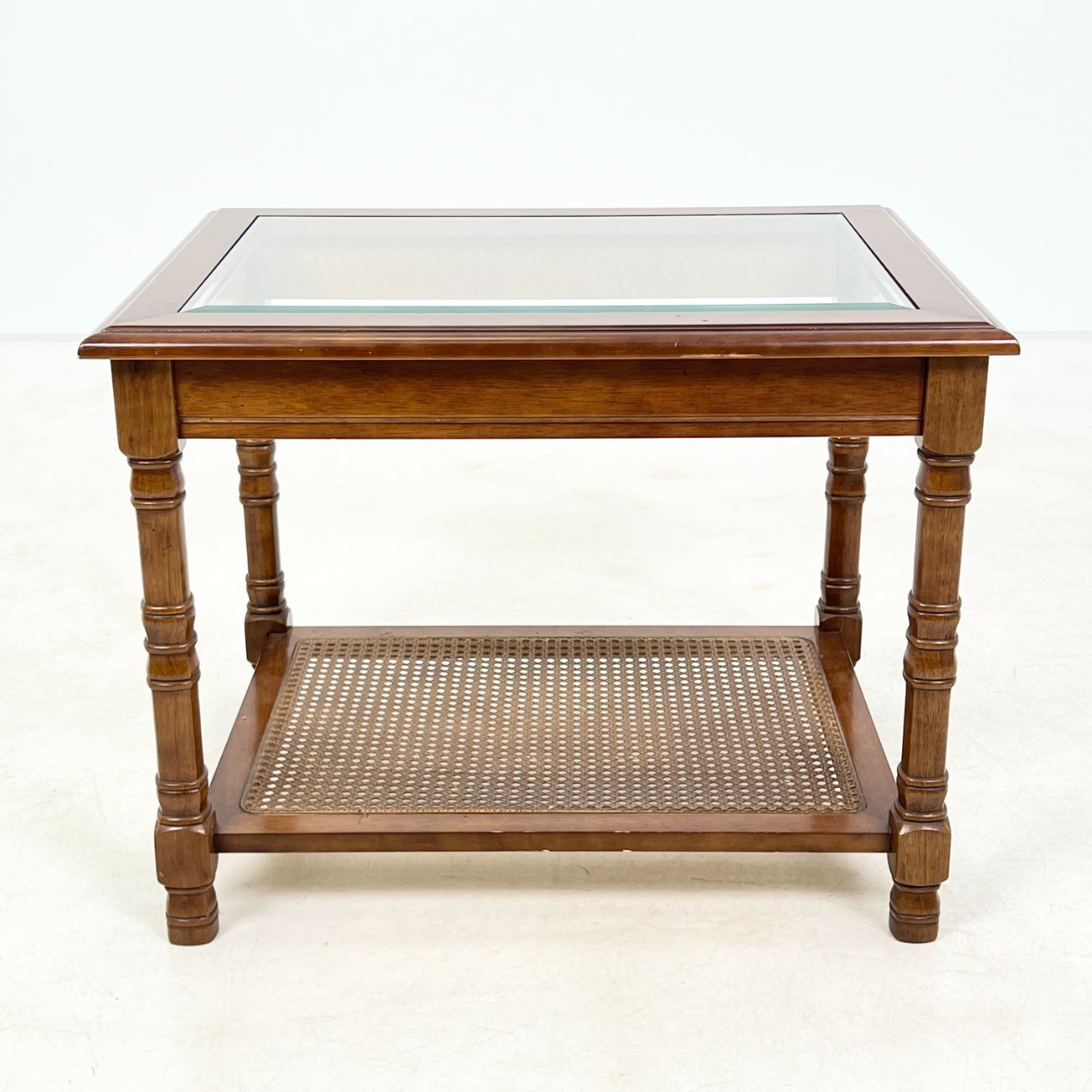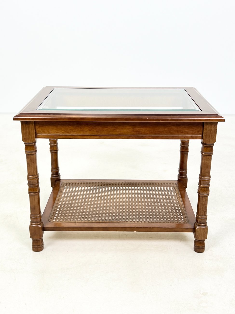 Riešutmedžio staliukas stikliniu stalviršiumi ir ratano lentynėle.