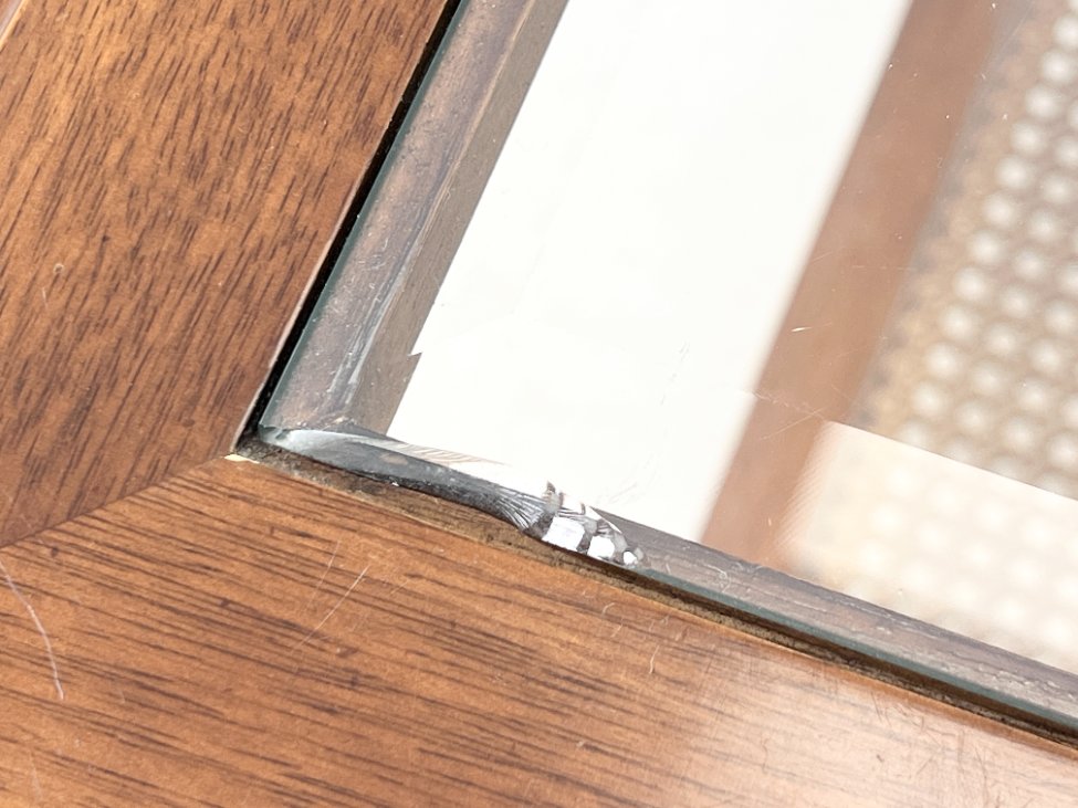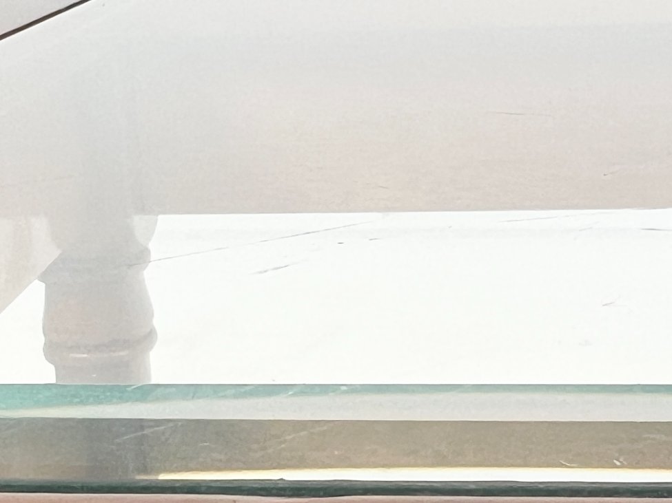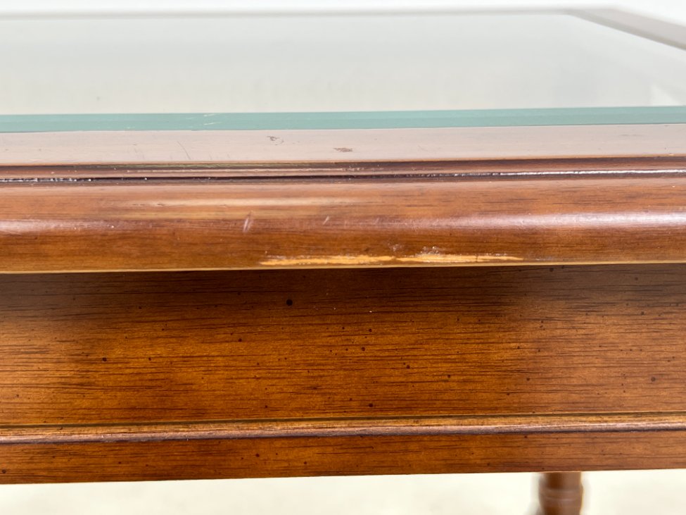 | Papildoma informacija | Matomos naudojimo žymės, per visą paviršių, tiek ant stiklo, tiek ant medinio rėmo, yra pabraižymų. Vienoje vietoje nuskelta stalviršio stiklo kraštinė. |
