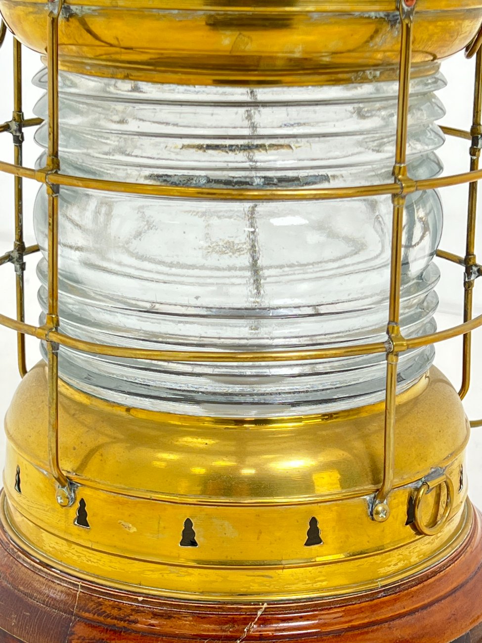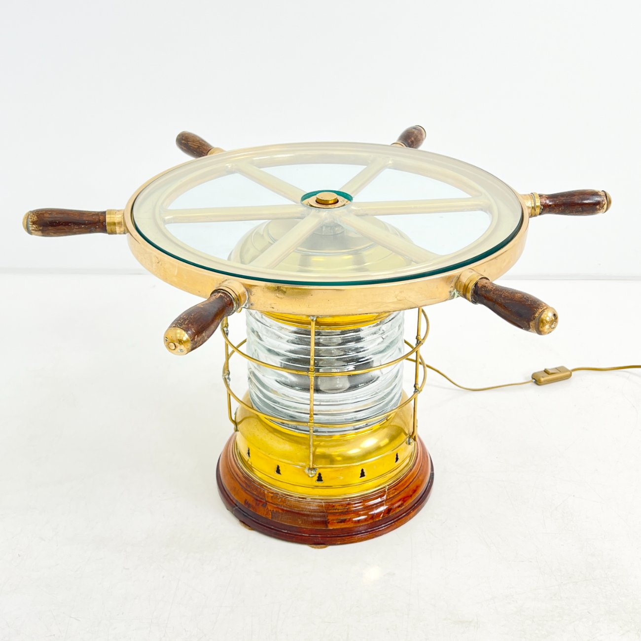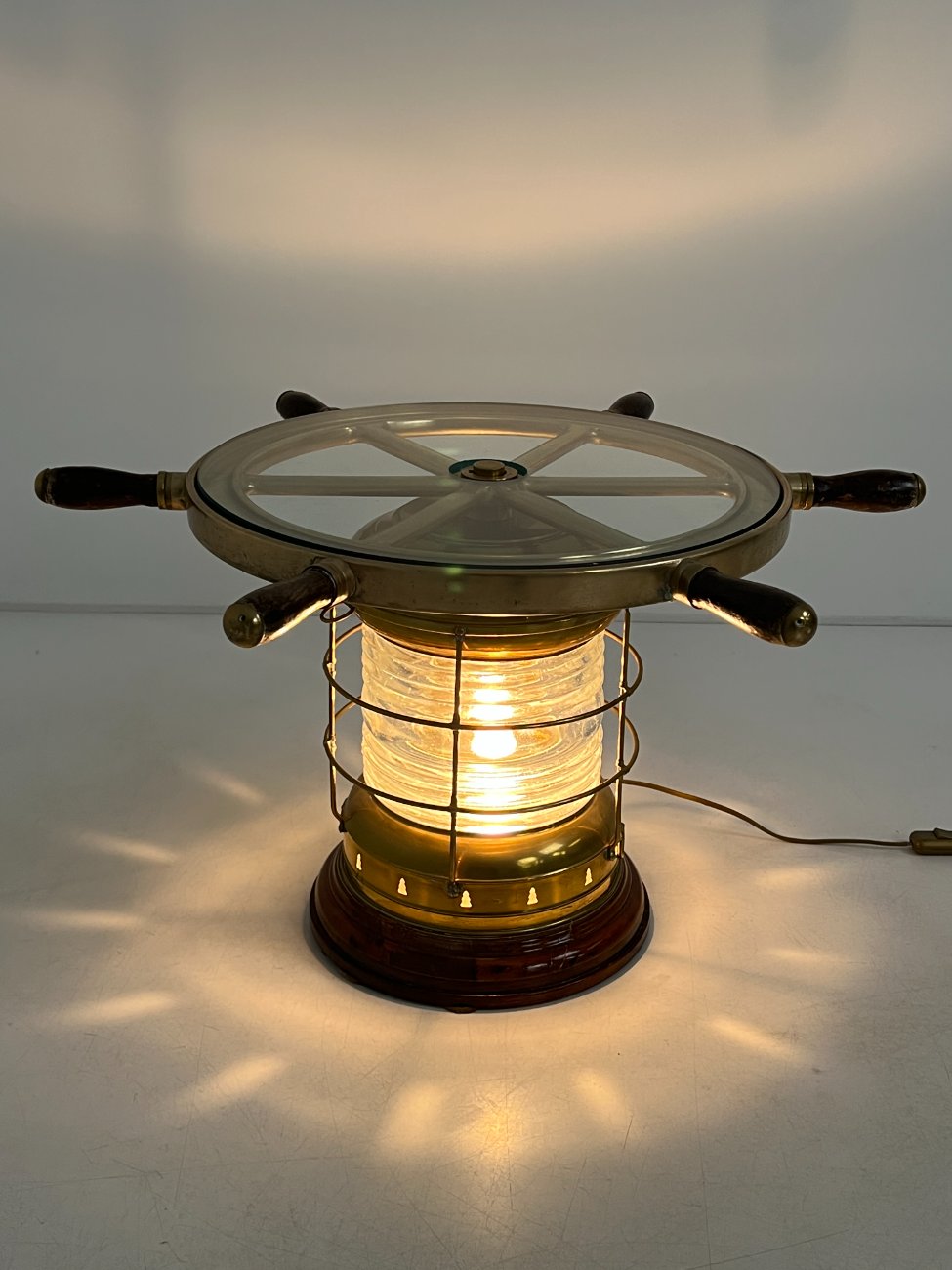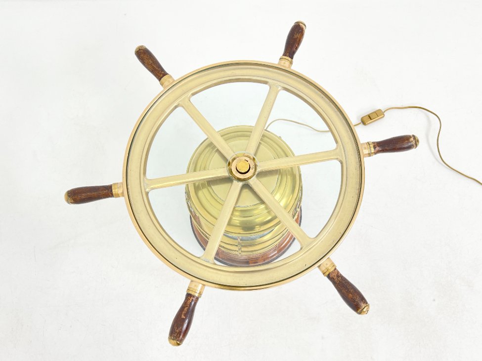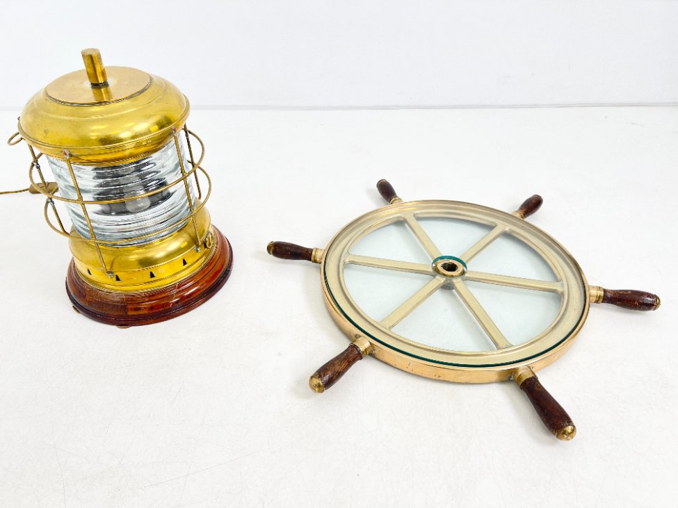 Staliukas iš jūrinio žibinto ir laivo vairo, su apšvietimu.