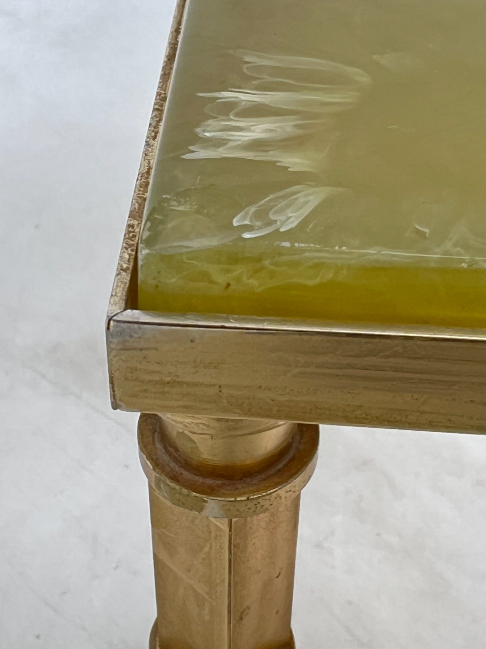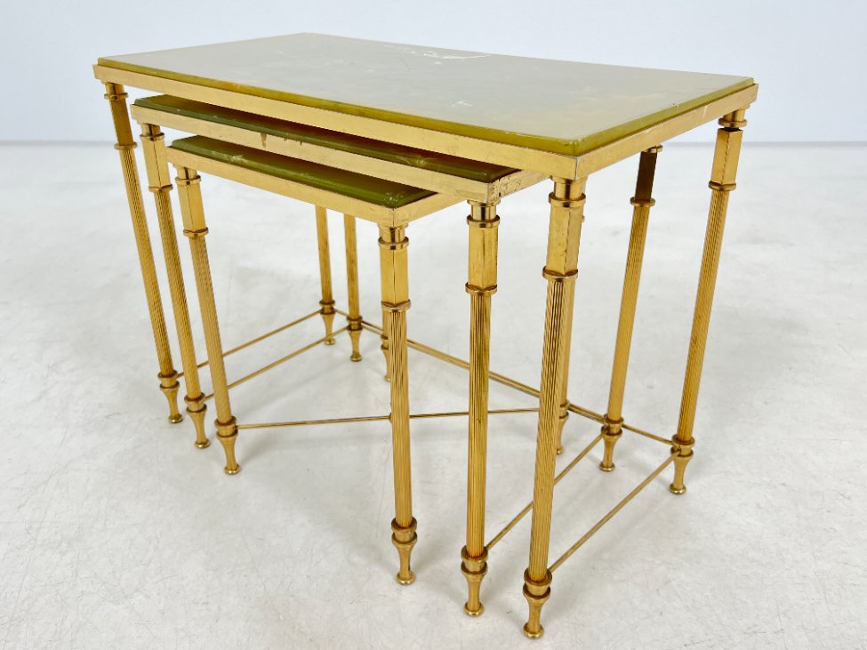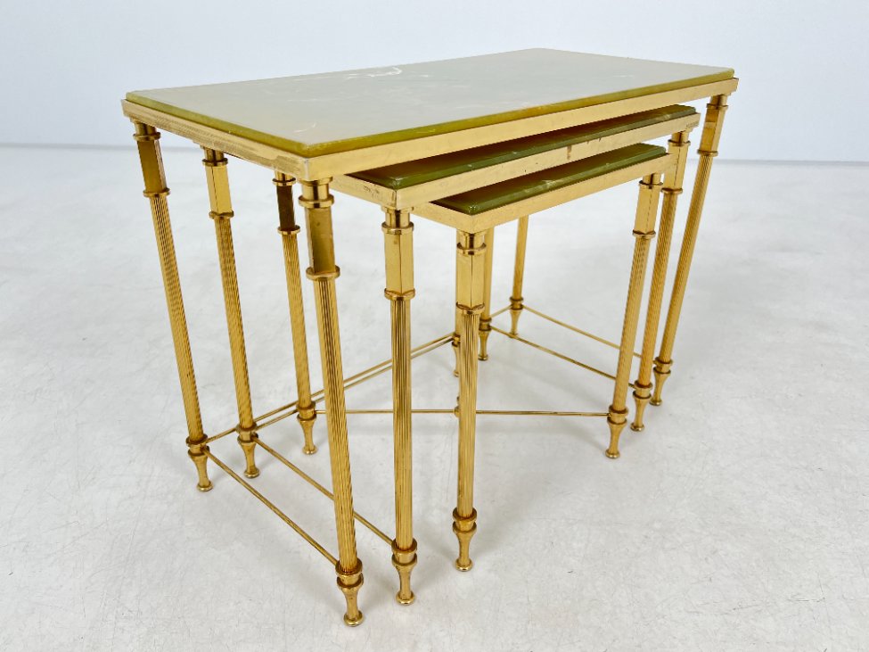 Žalvariniai lizdiniai staliukai su onikso imitacijos stalviršiais 3 vnt. komplektas.