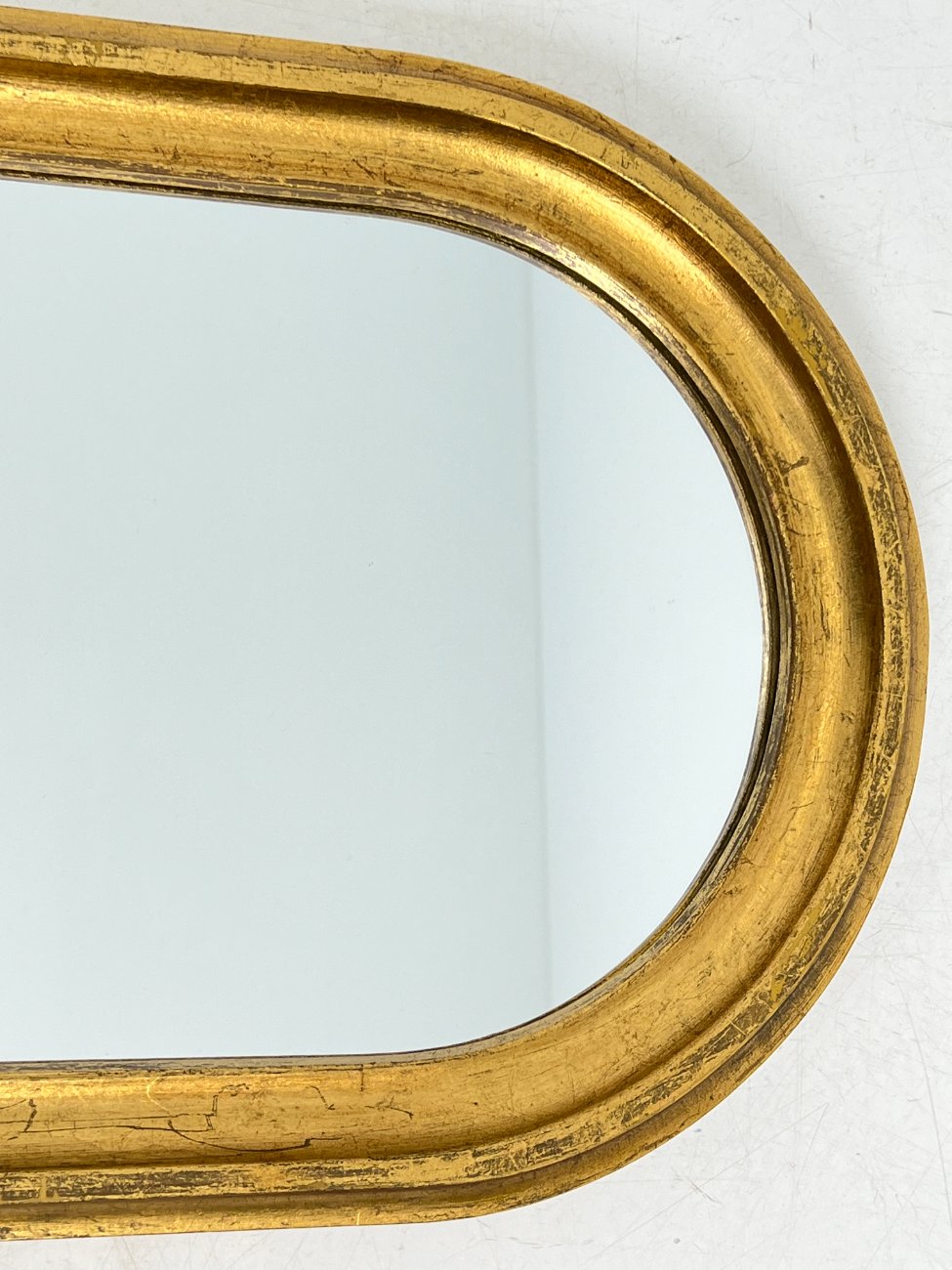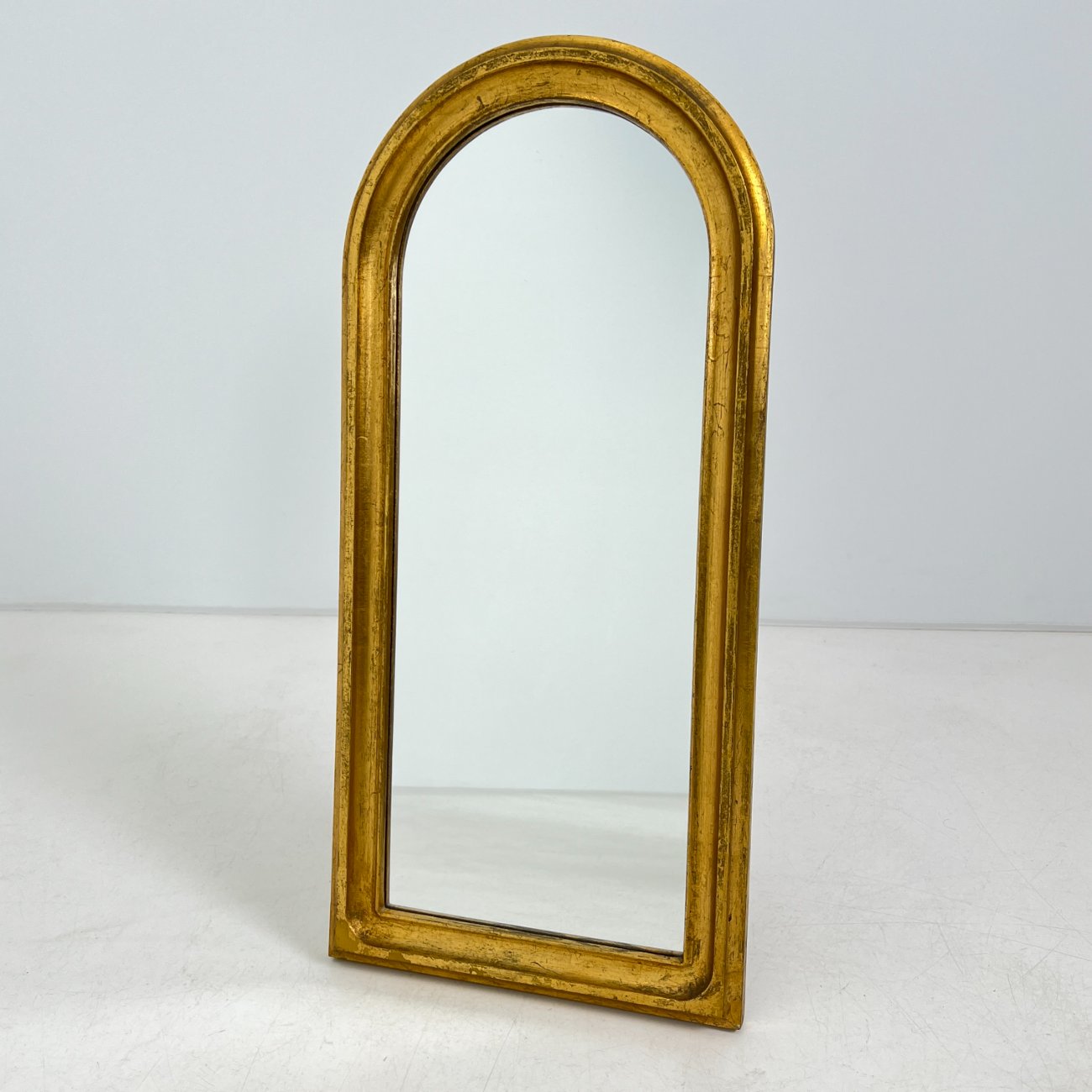 Arkos formos veidrodis sendintame aukso spalvos rėme.