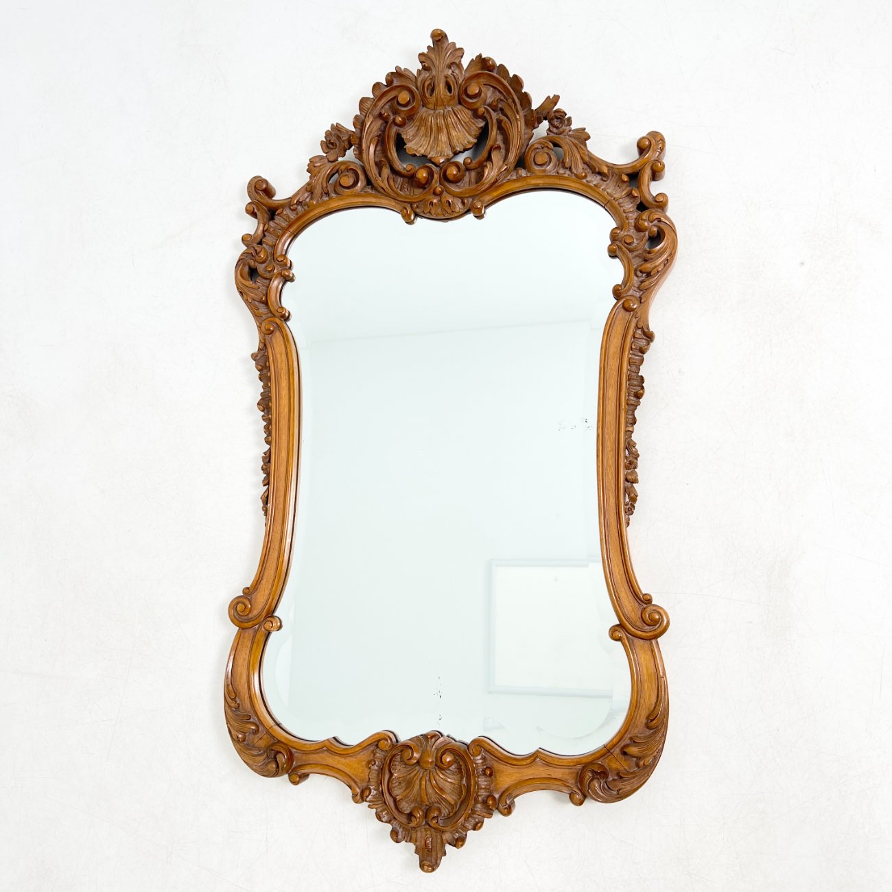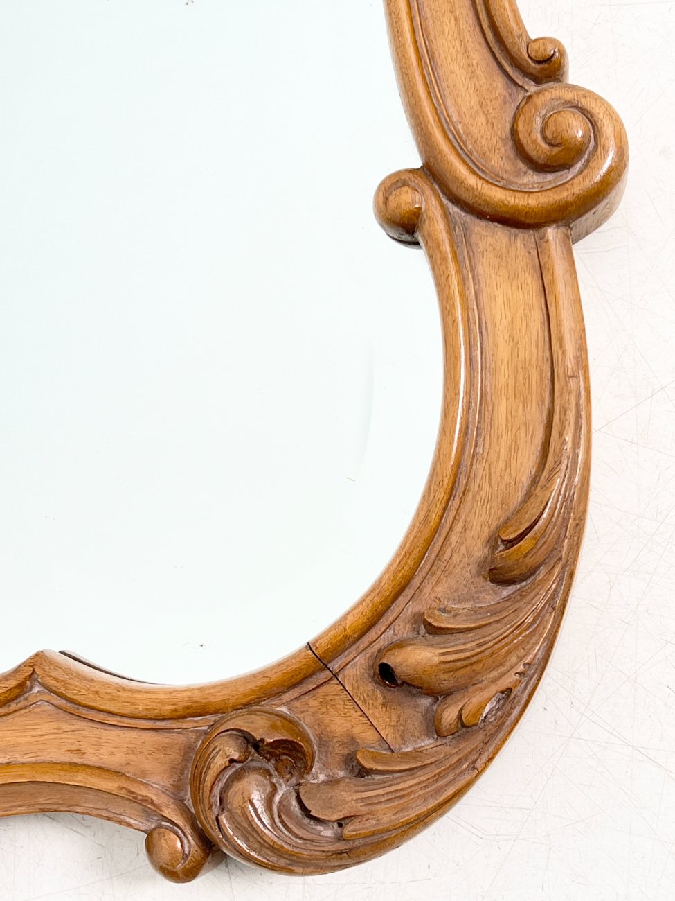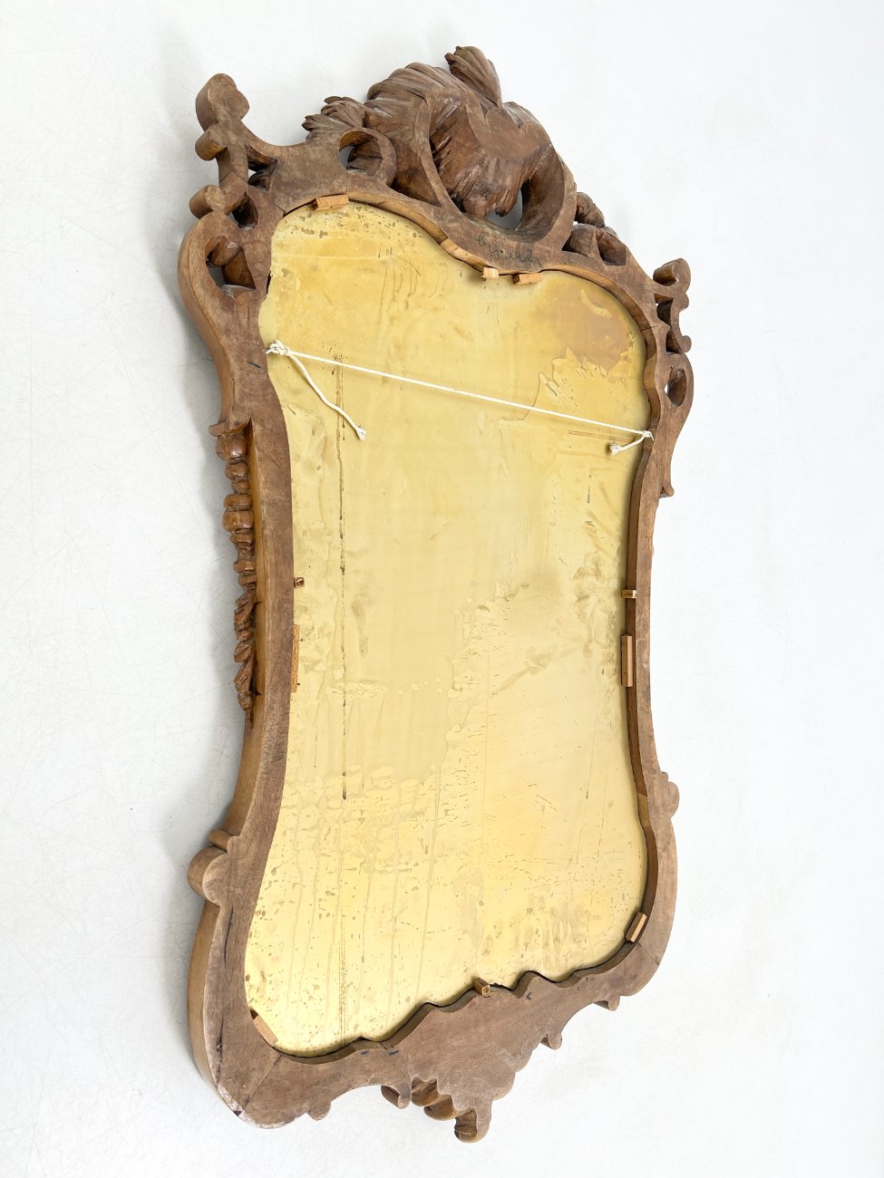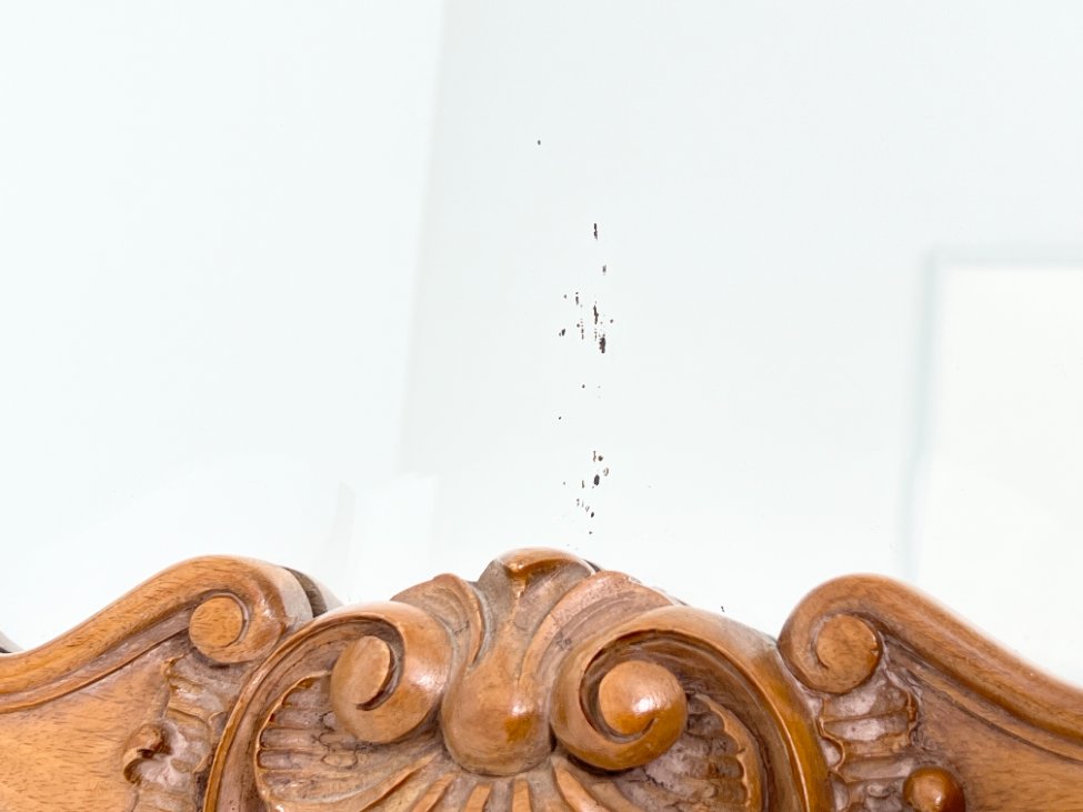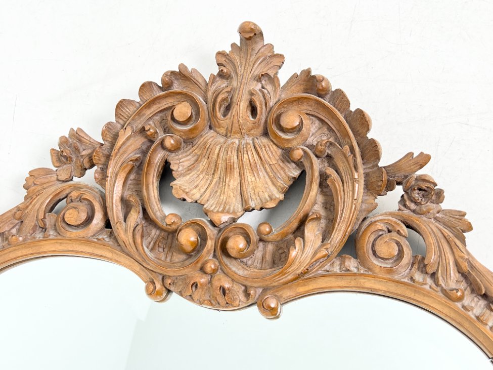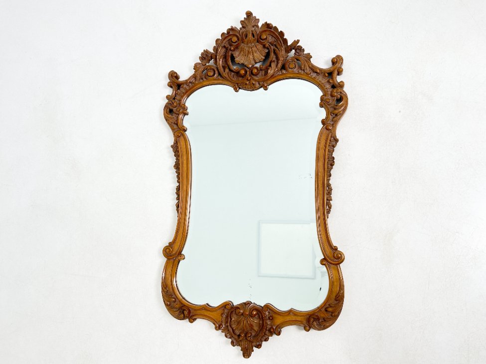 Barokinio stiliaus, drožinėto riešutmedžio rėmo pakabinamas veidrodis.