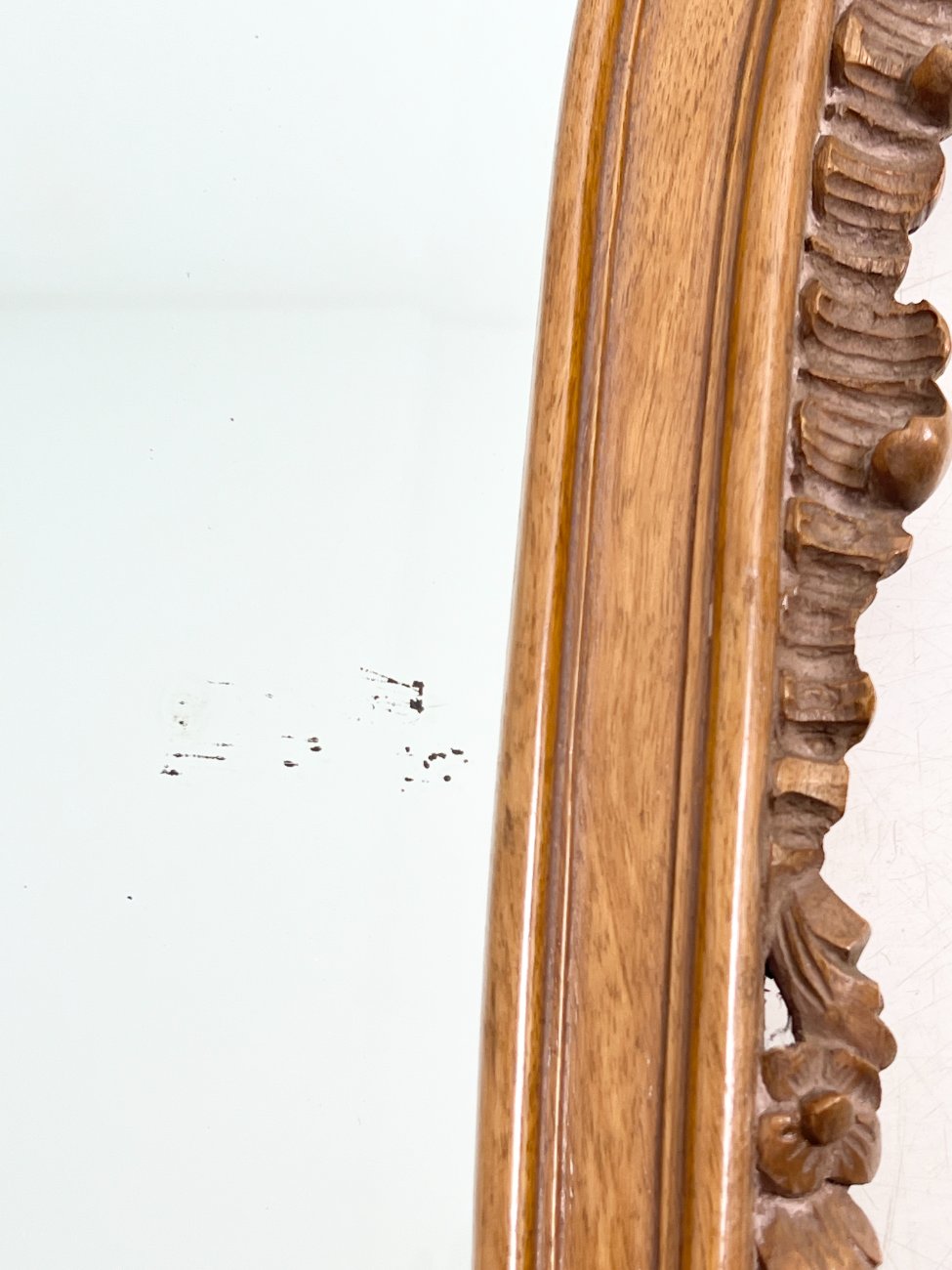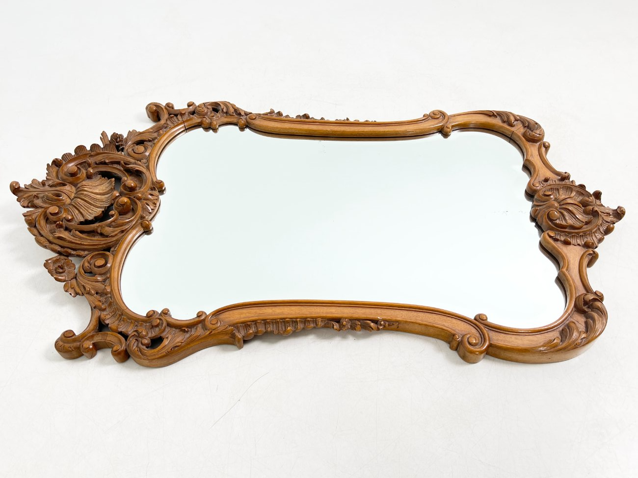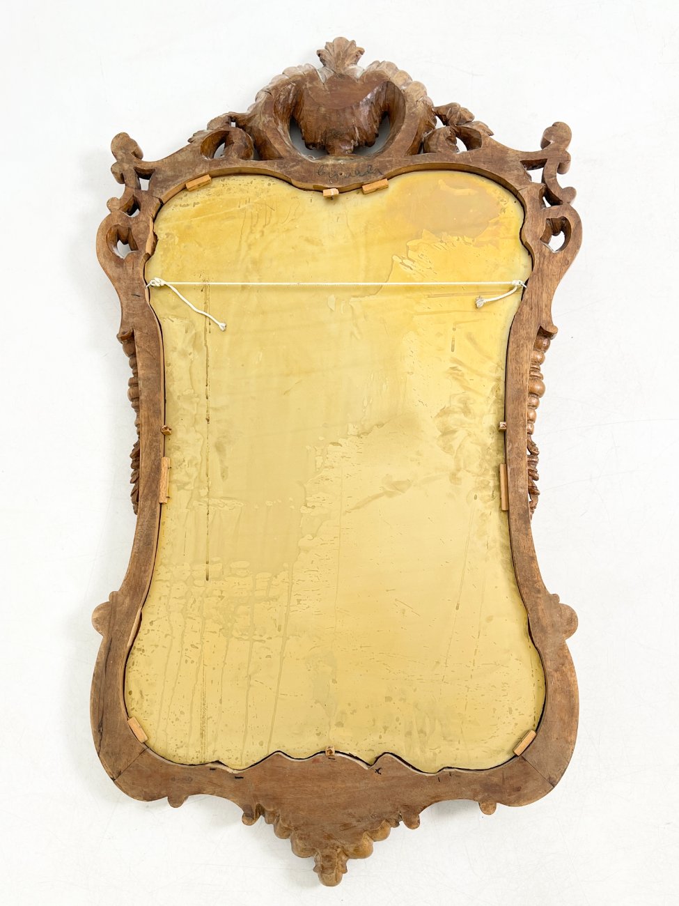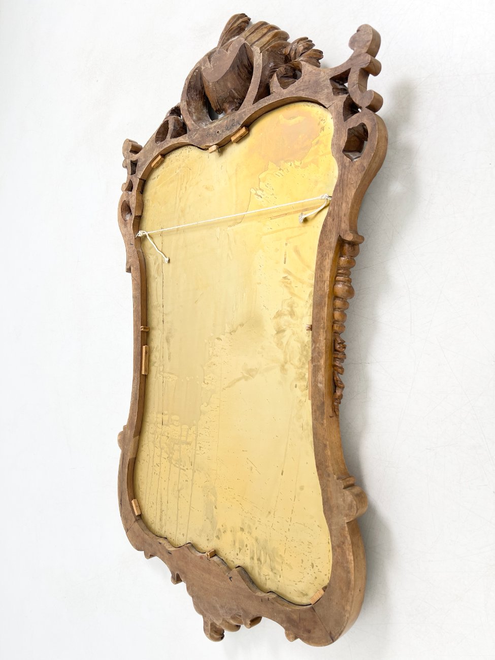 Barokinio stiliaus, drožinėto riešutmedžio rėmo pakabinamas veidrodis.