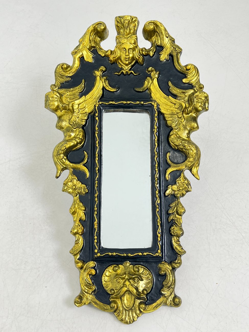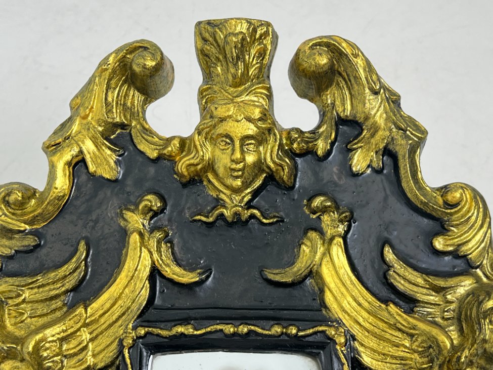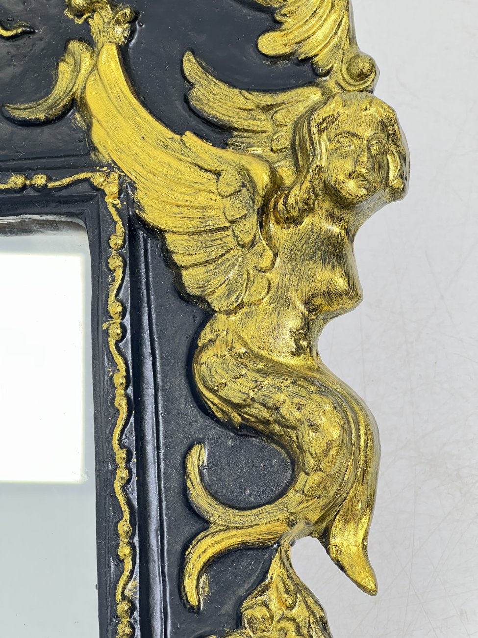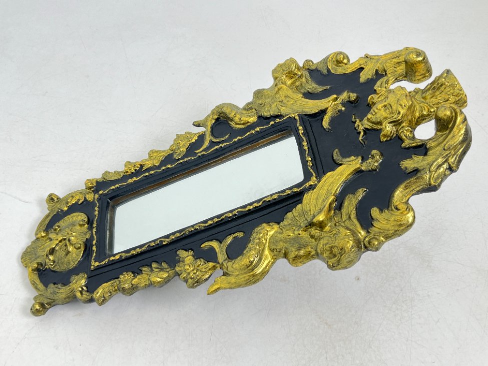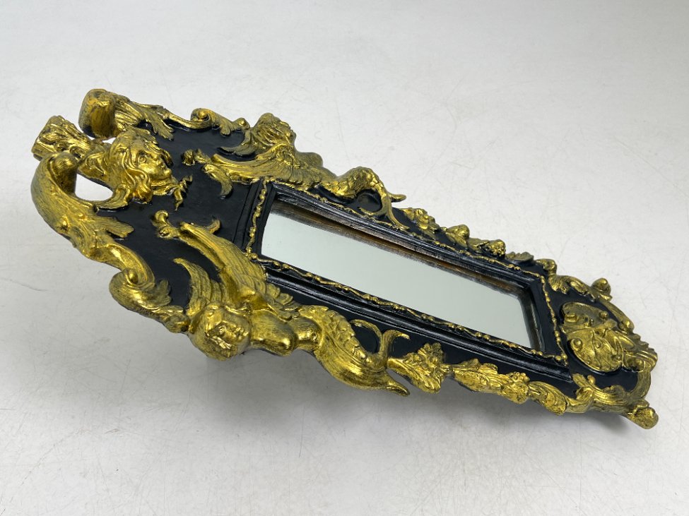 Siauras veidrodis juodame rėme su aukso spalvos ornamentais.