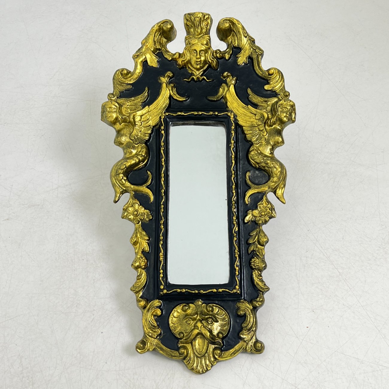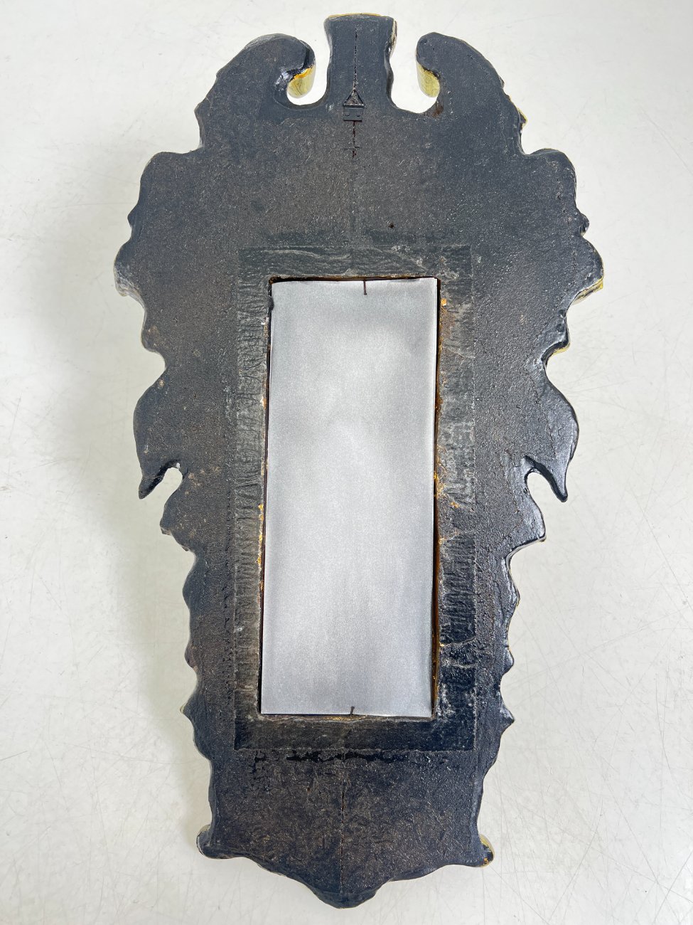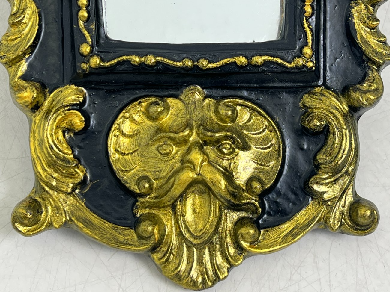 Siauras veidrodis juodame rėme su aukso spalvos ornamentais.