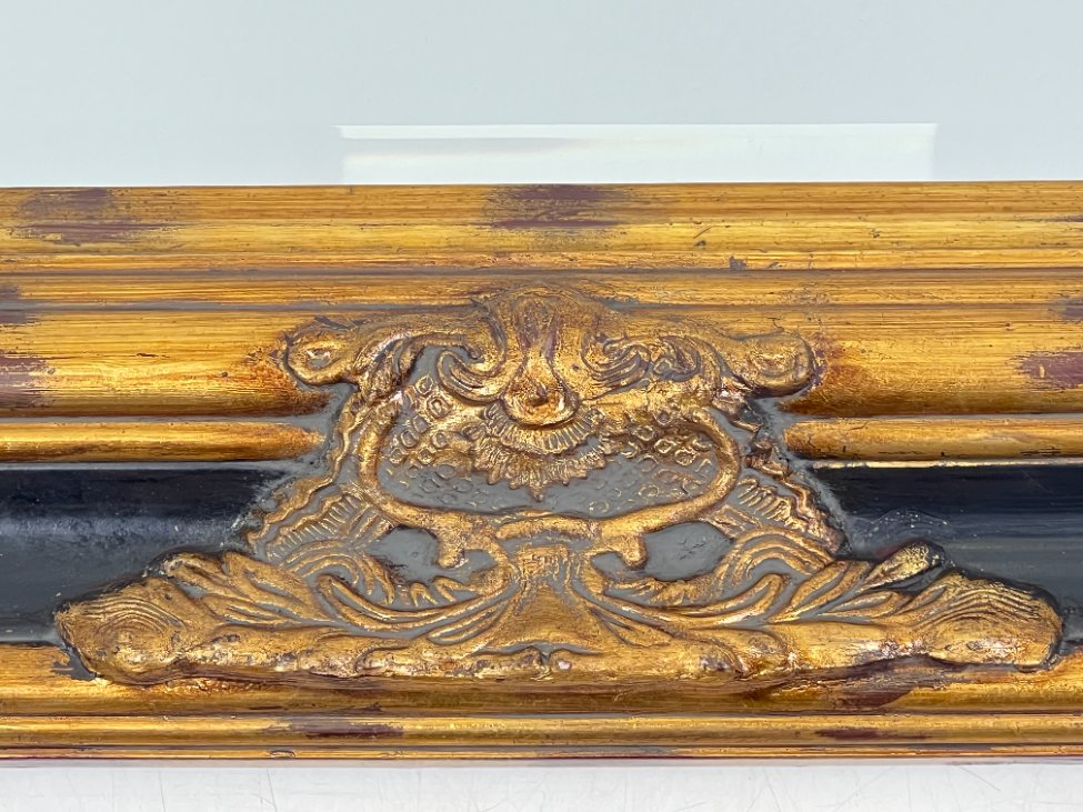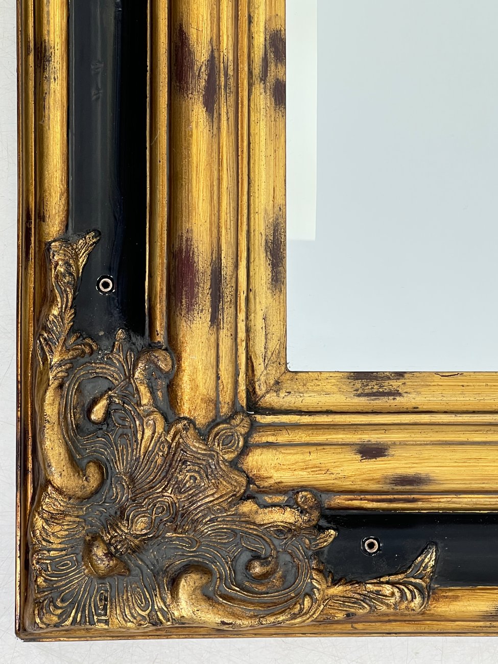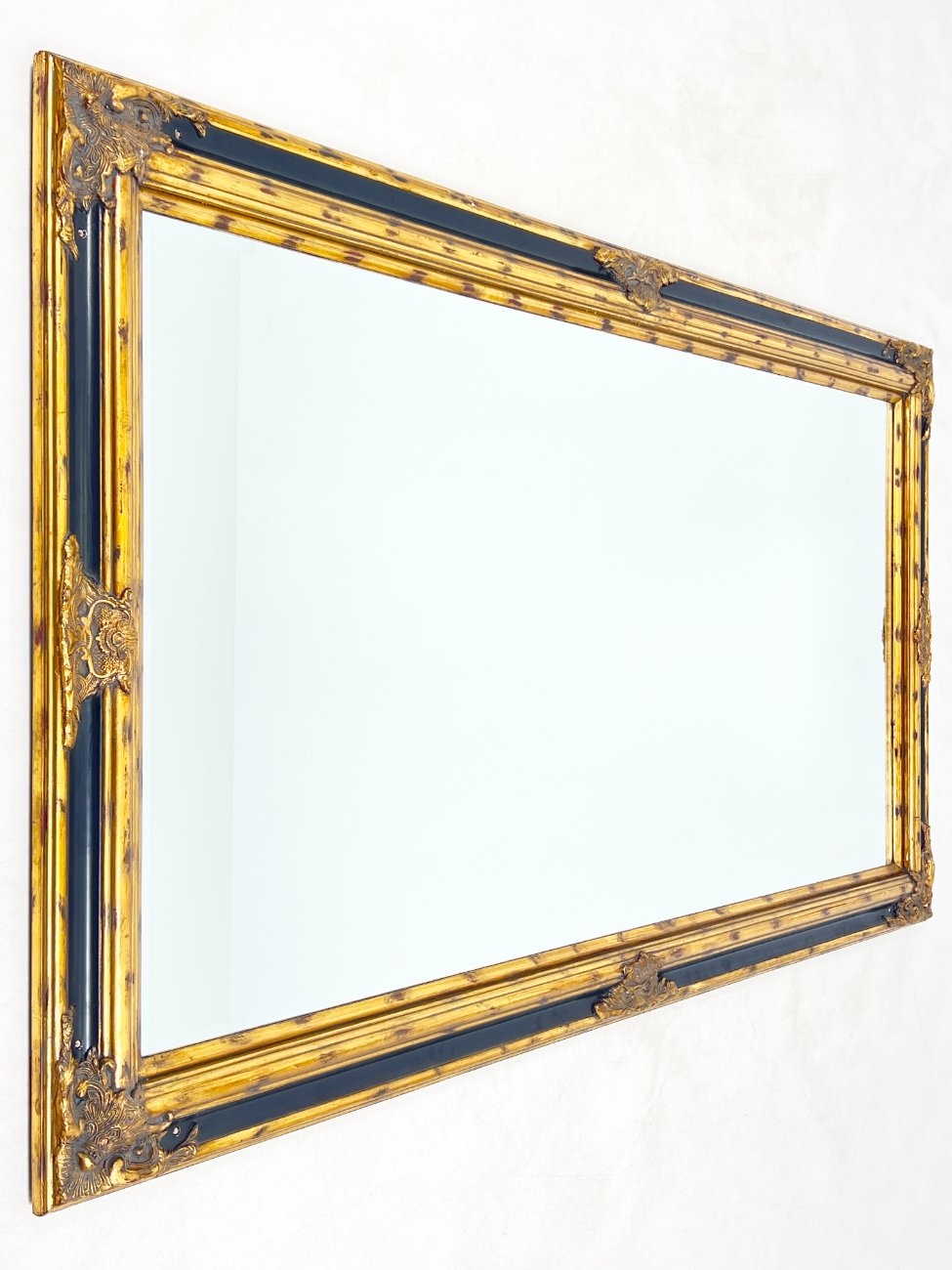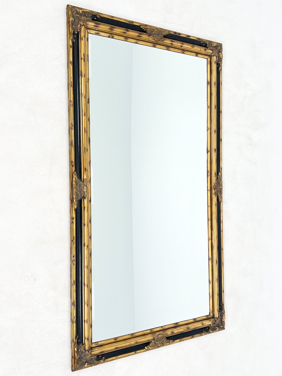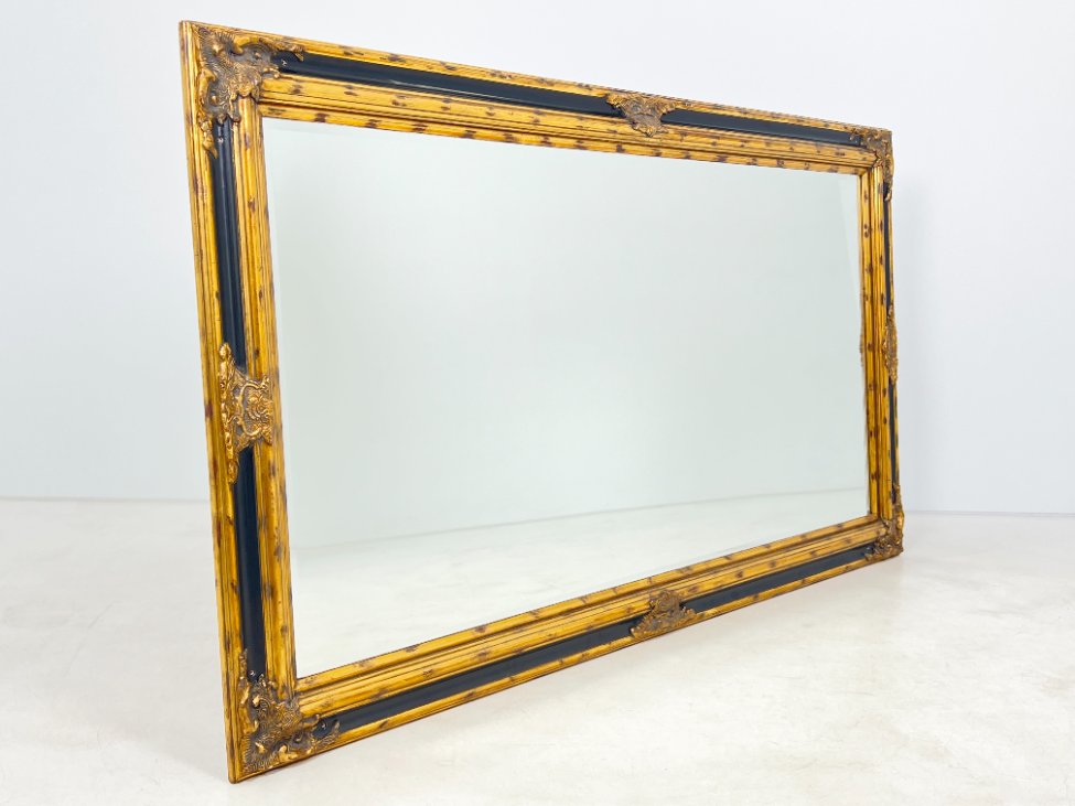 Vertikaliai arba horizontaliai kabinamas veidrodis aukso spalvos mediniame rėme.