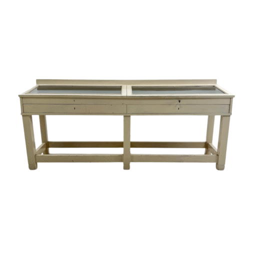 Balta medinė dviejų stalčių prekybinė vitrina stiklo viršumi