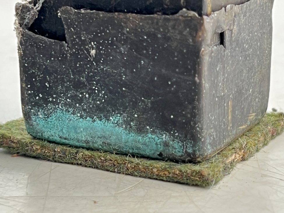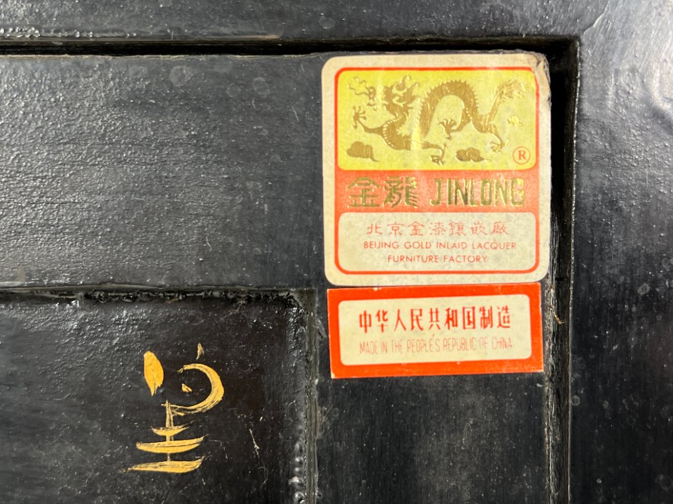 | Papildoma informacija | Matomos naudojimo žymės, vietomis yra pabraižymų, įmušimų. Ant kairiųjų durelių klijuota akmens dekoracija. Oksidavęsis kojų apdailų metalas. Kraštinėse apdaužytos stiklinės lentynos. |