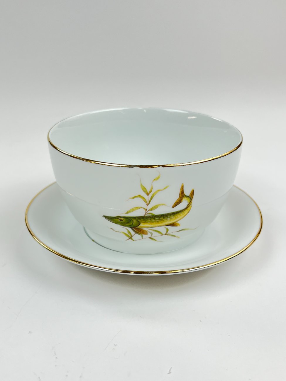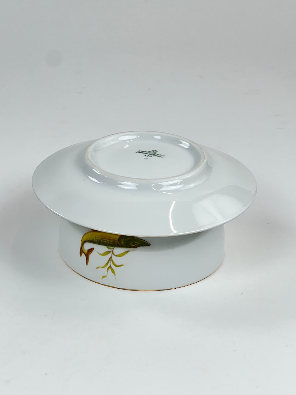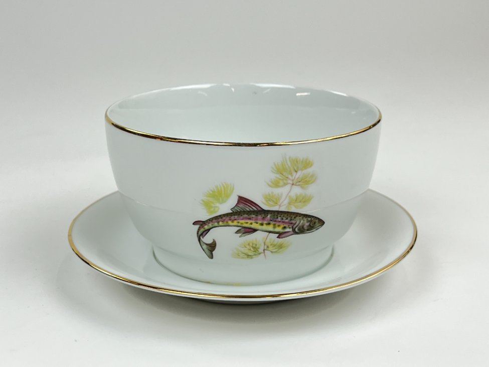 Porcelianinė Vohenstrauss Johann Seltmann padažinė su žuvų atvaizdais.