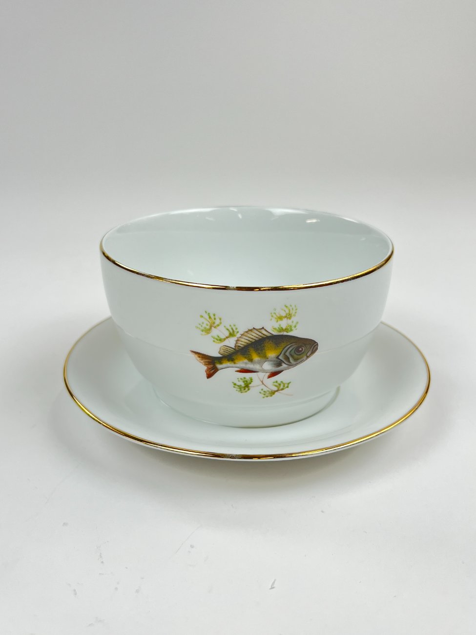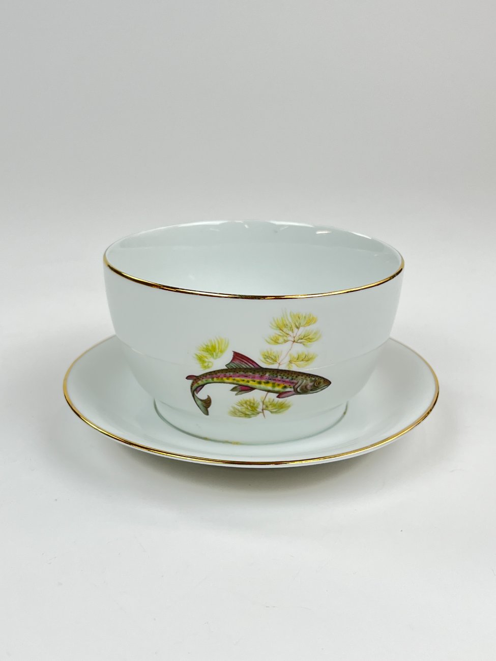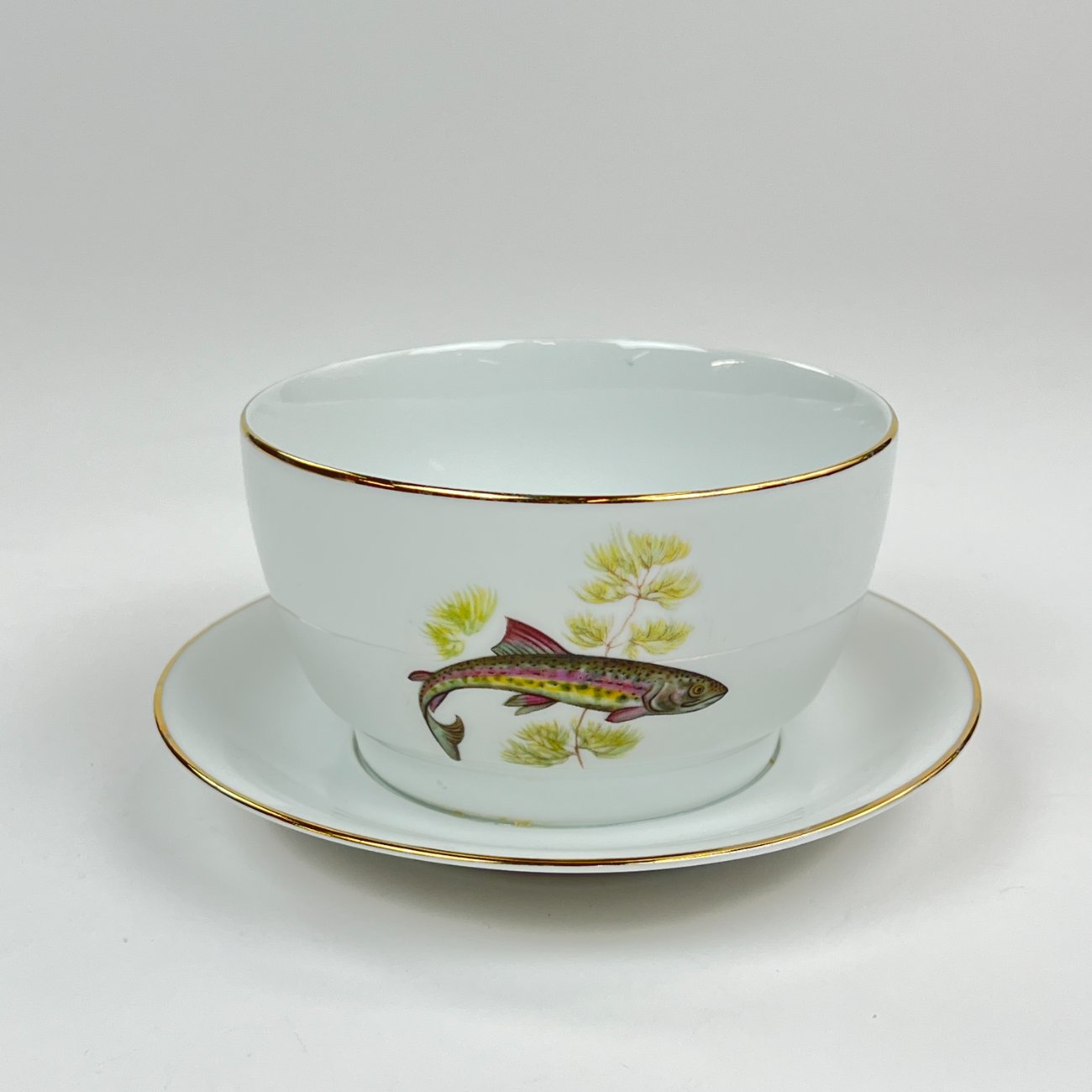 Porcelianinė Vohenstrauss Johann Seltmann padažinė su žuvų atvaizdais.