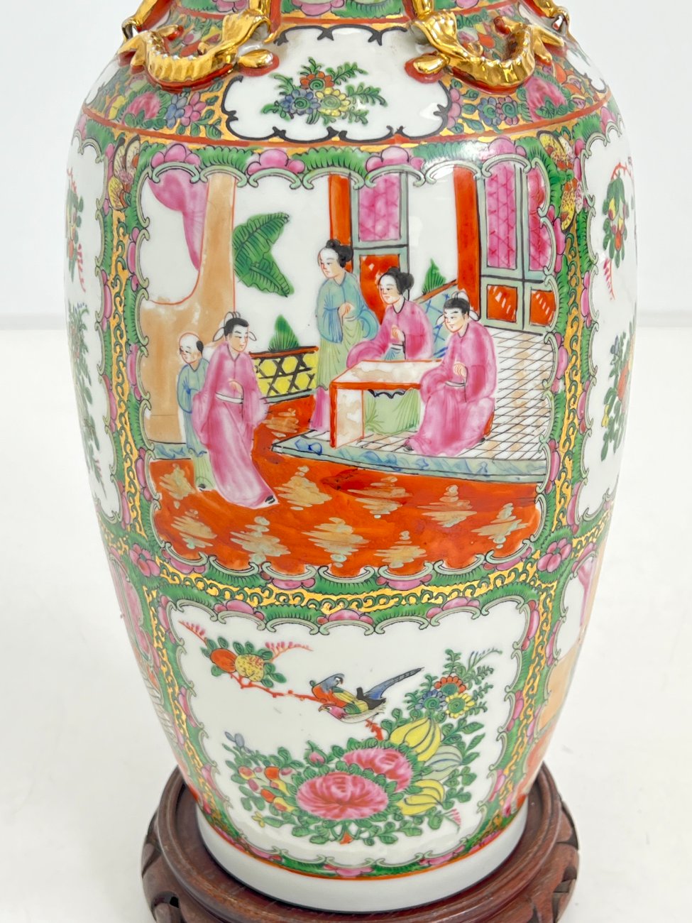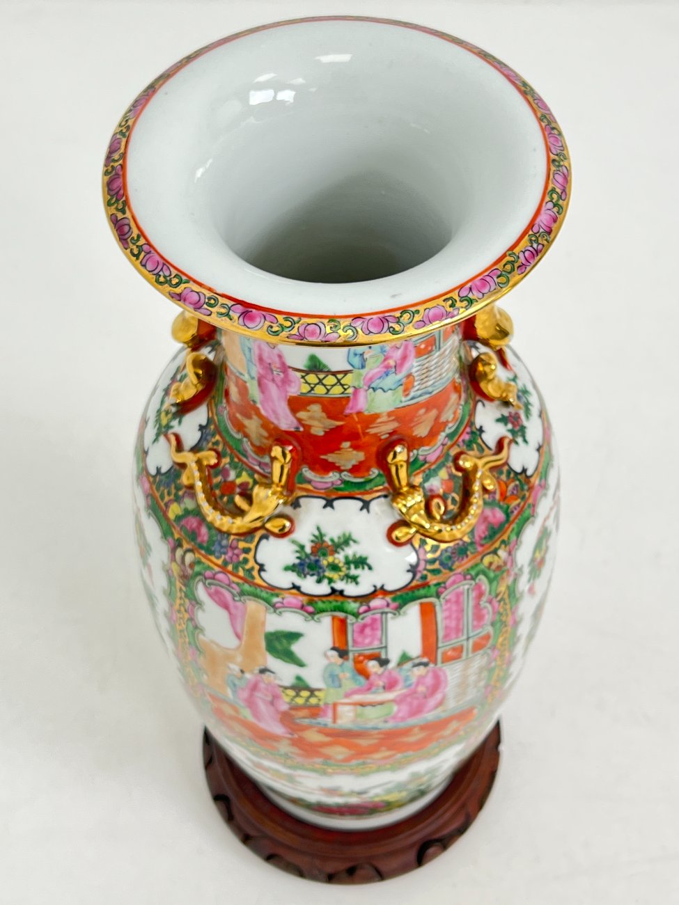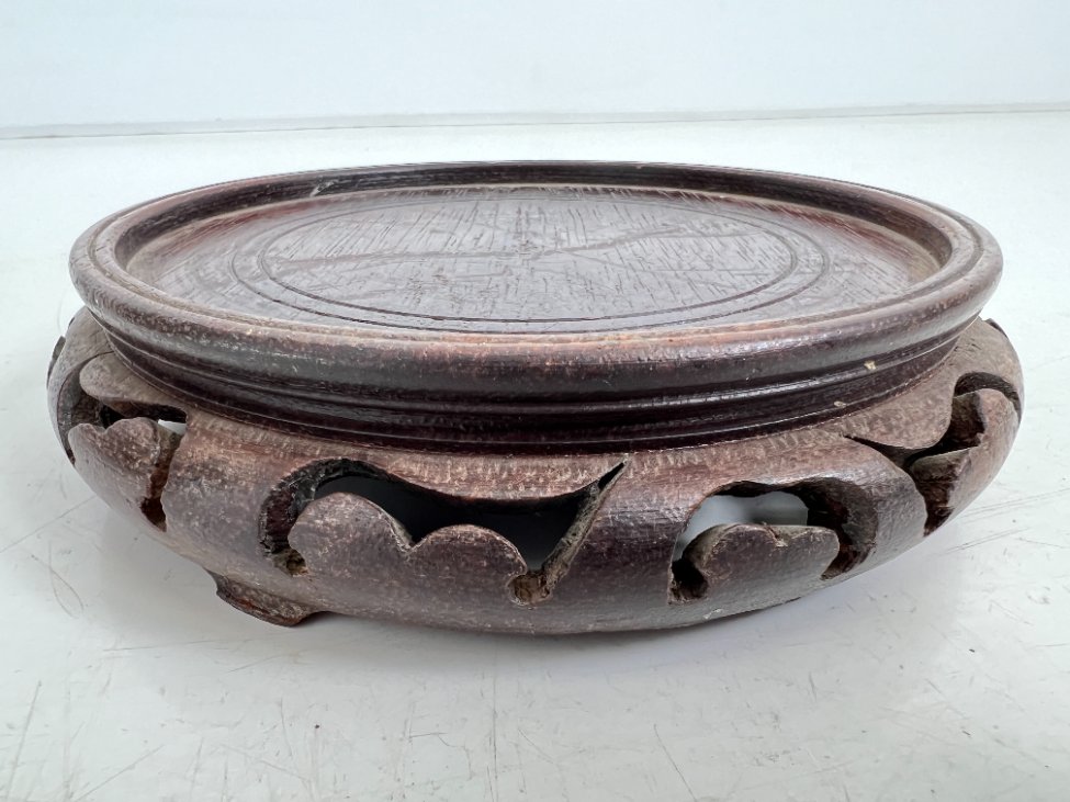 Rytietiška keramikinė vaza su raudonmedžio padėkliuku.