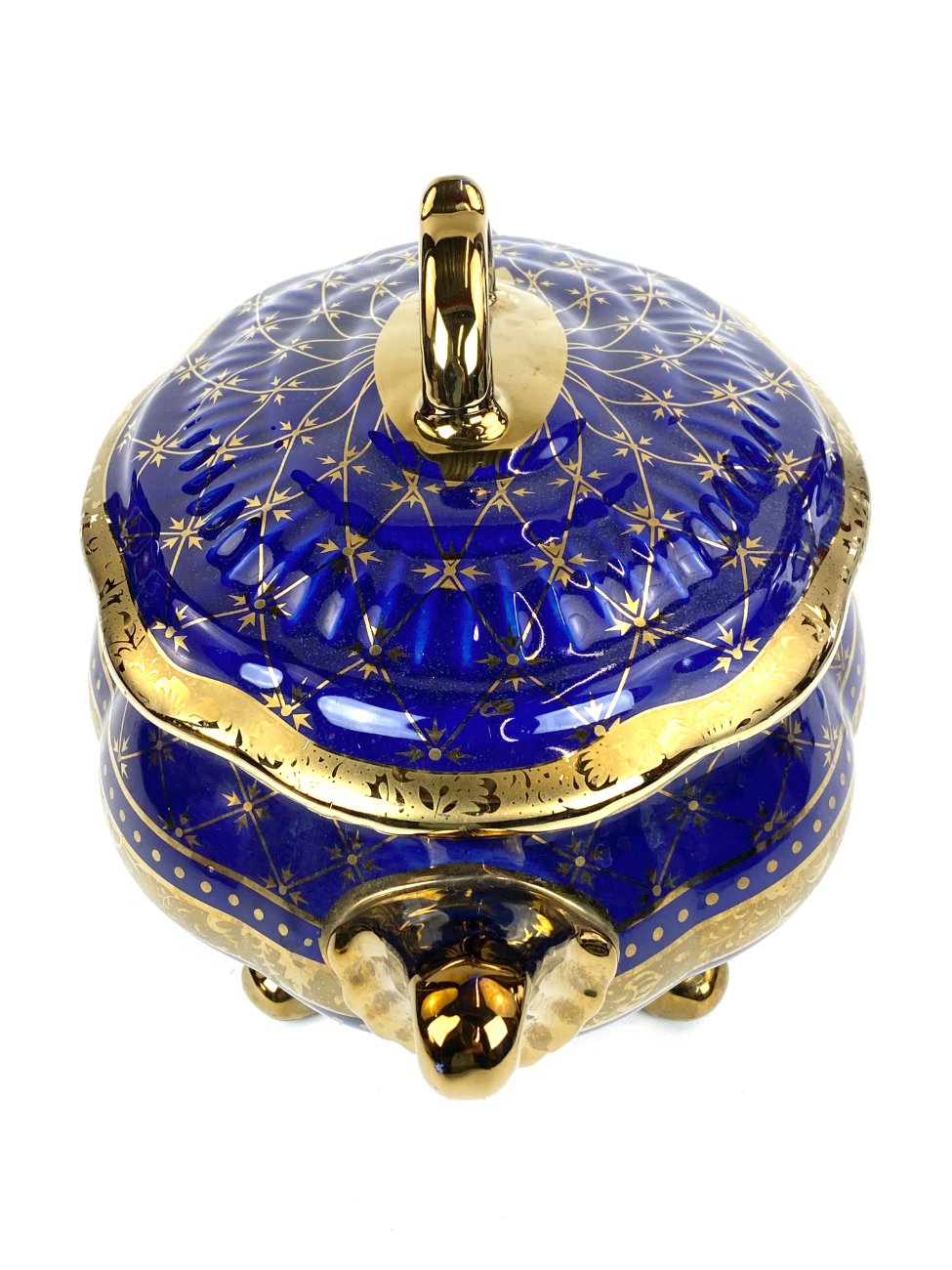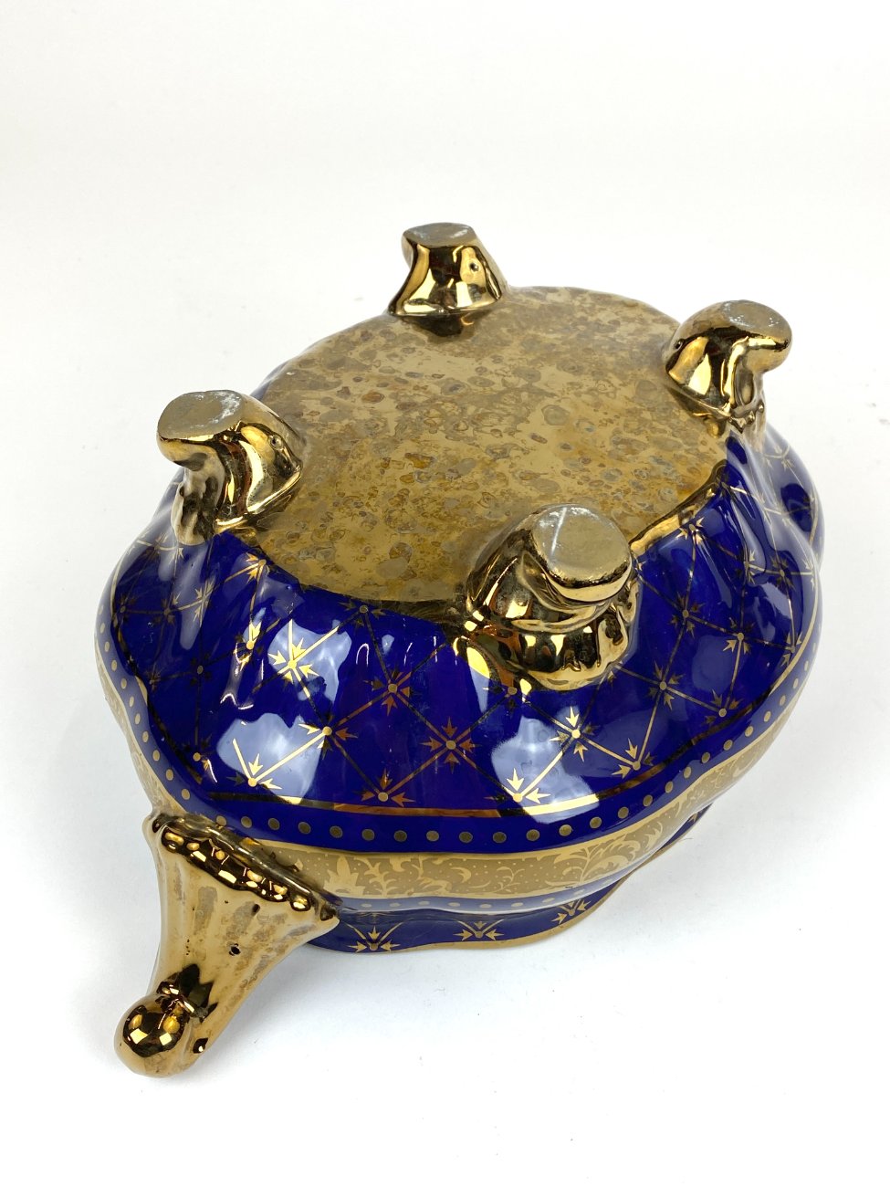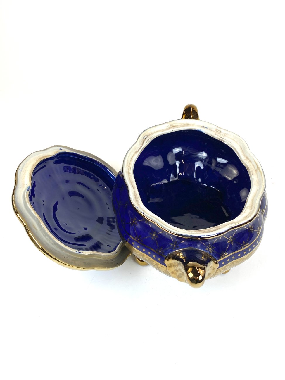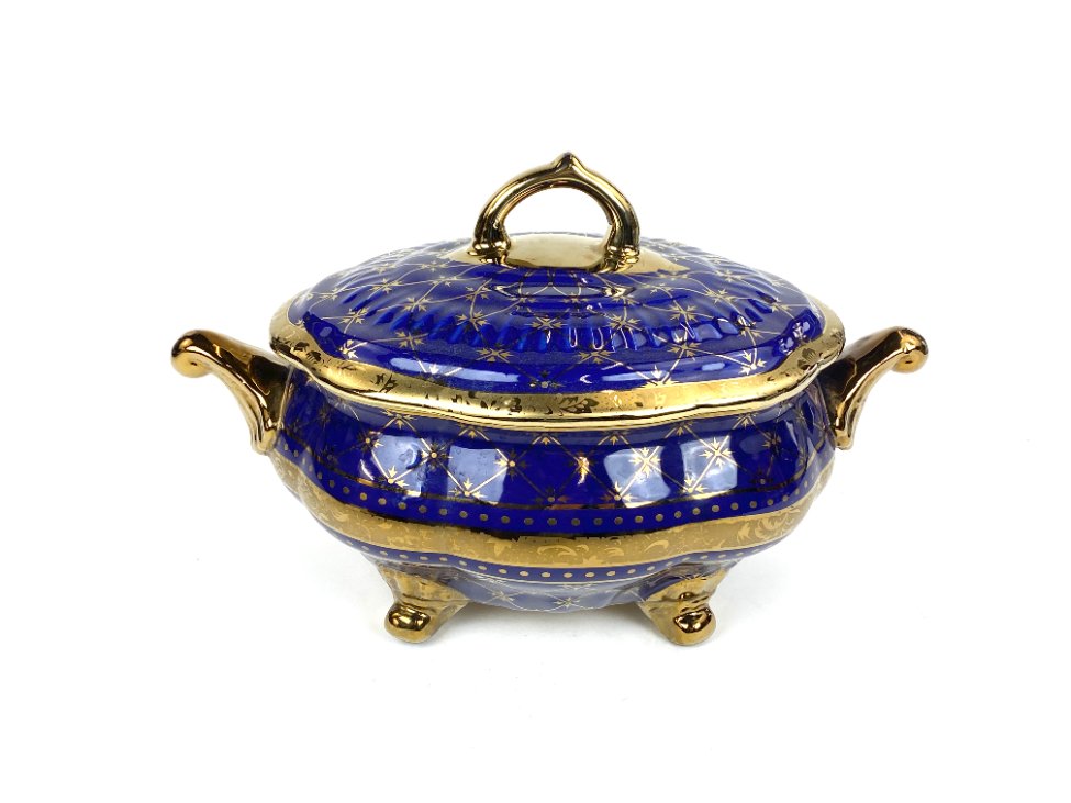 Keramikinis “Wurko” mėlyno ir aukso atspalvių indas su dangčiu.
