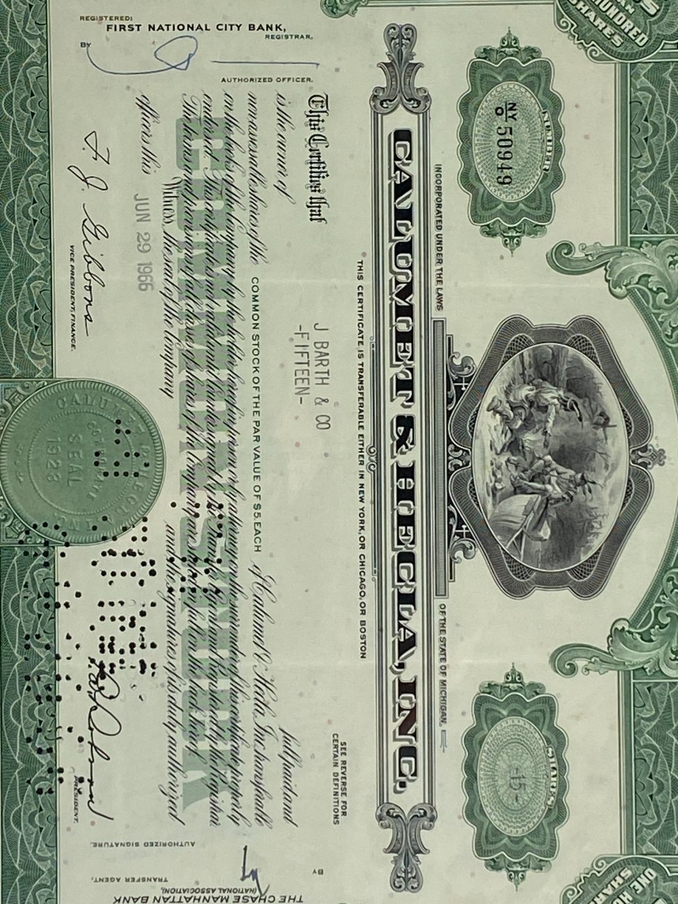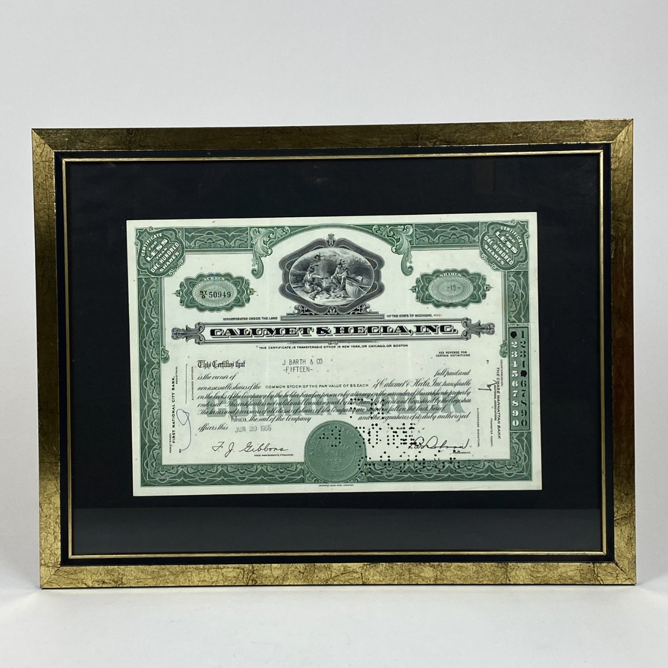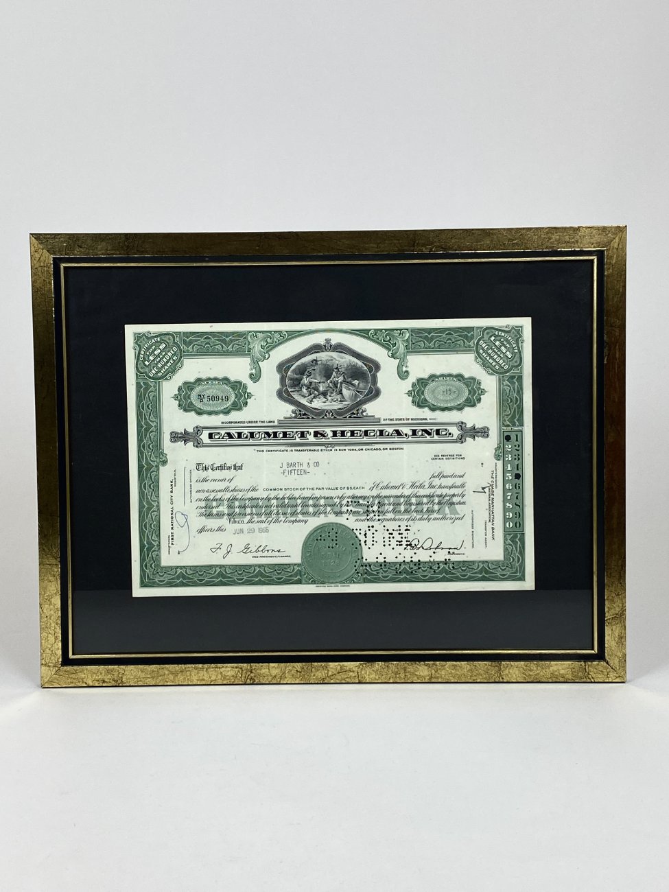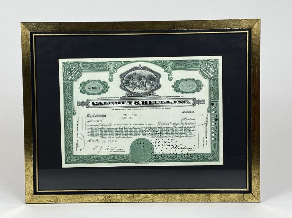 Calumet & Hecla, Inc. 15 vnt. akcijų sertifikatas mediniame rėme su stiklu.