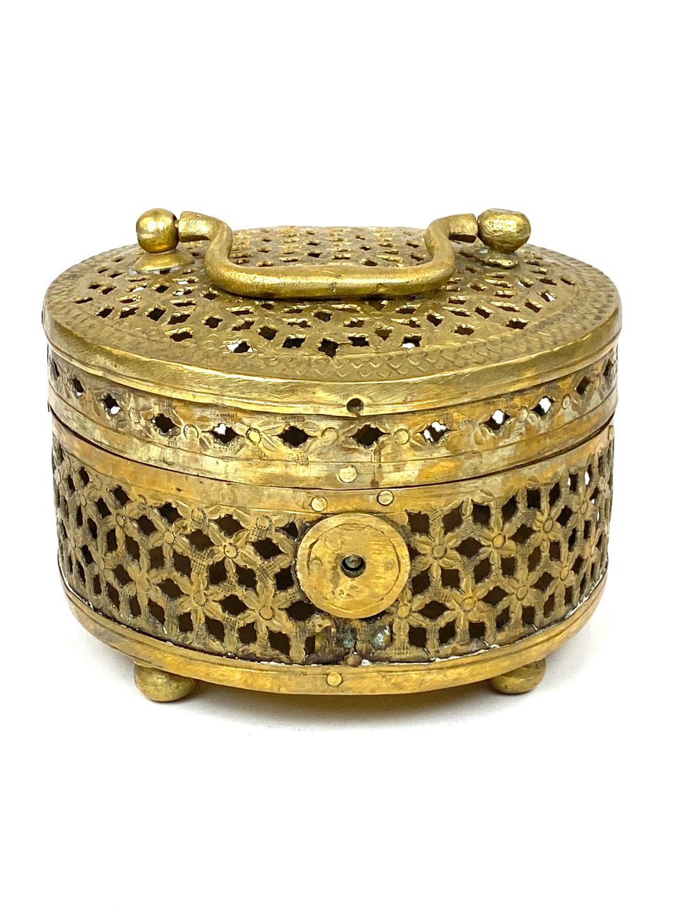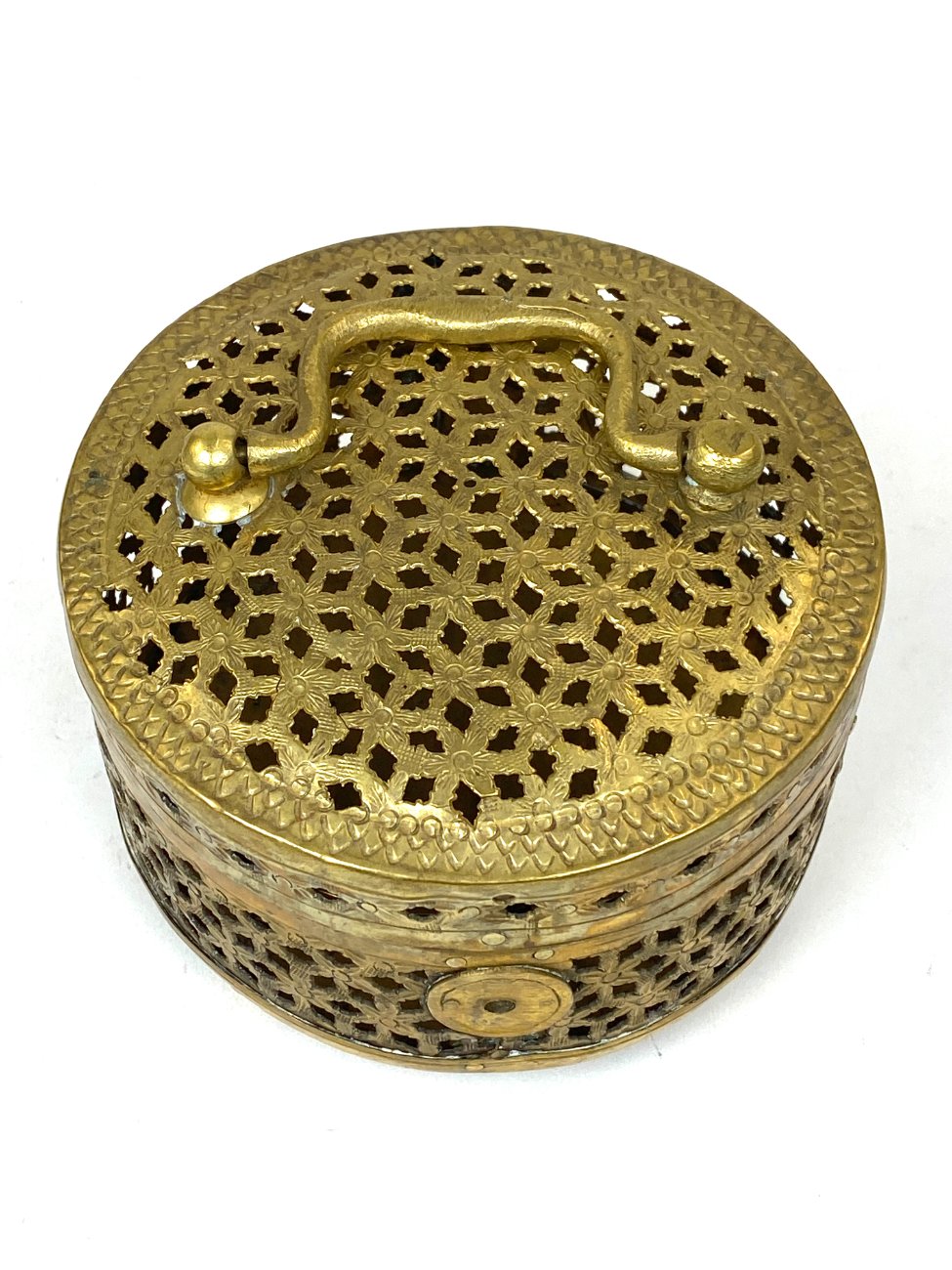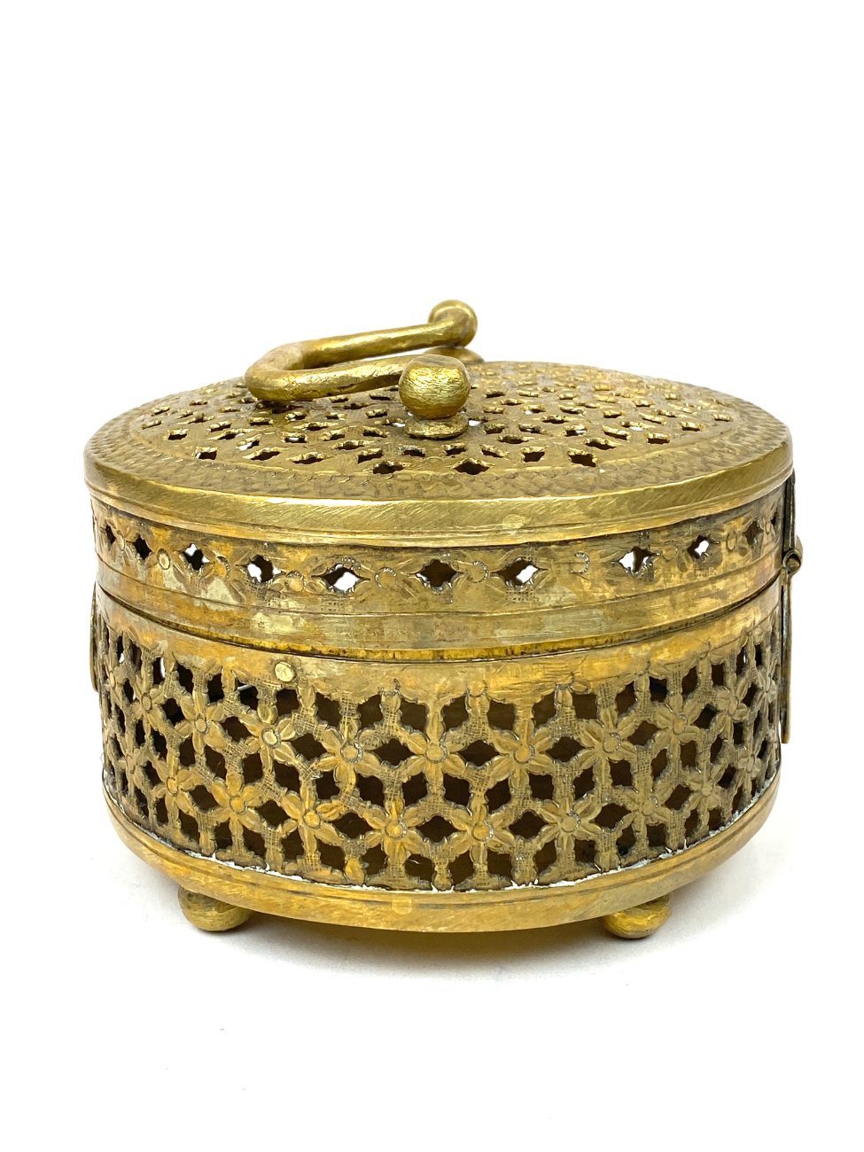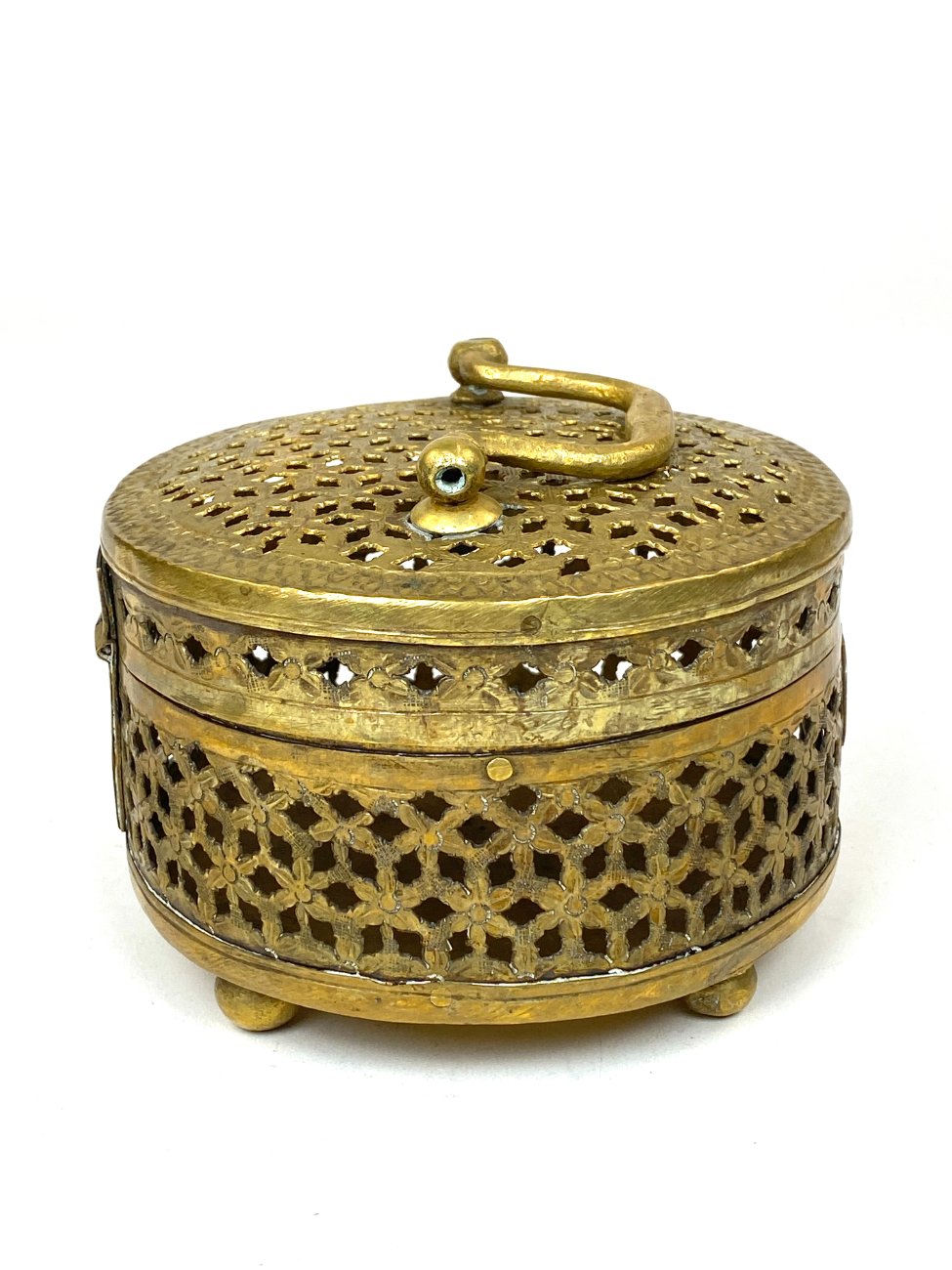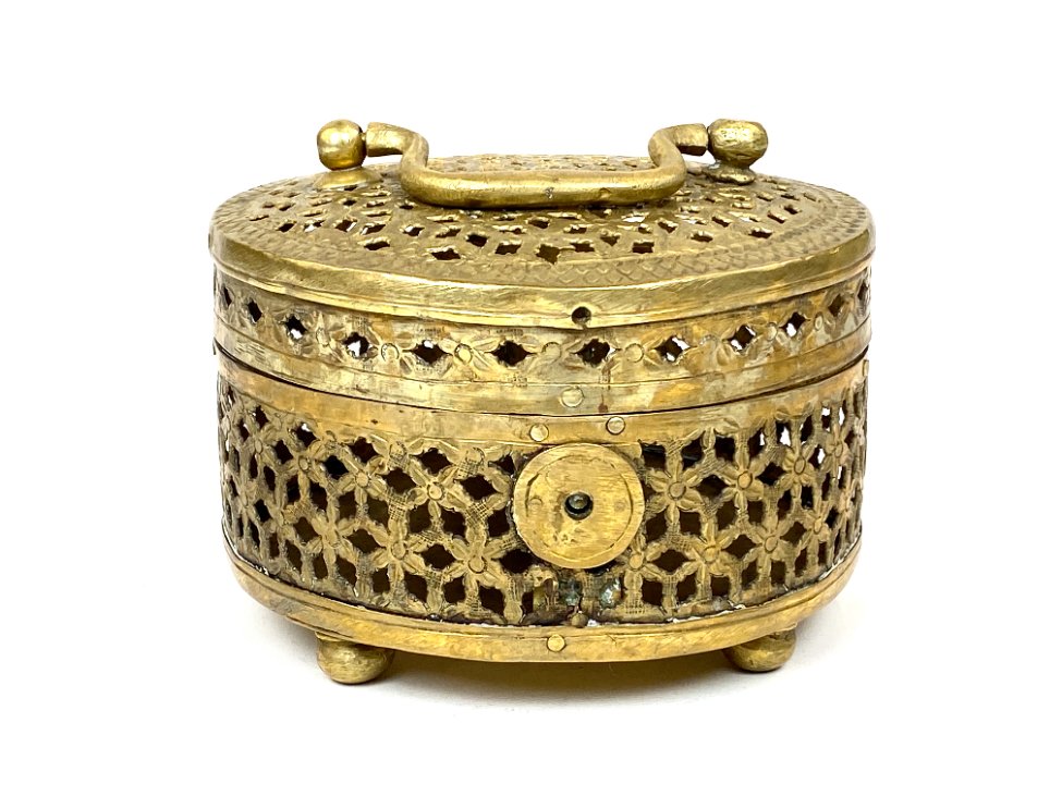 Indiška žalvarinė ažūrinė apvalios formos dėžutė.